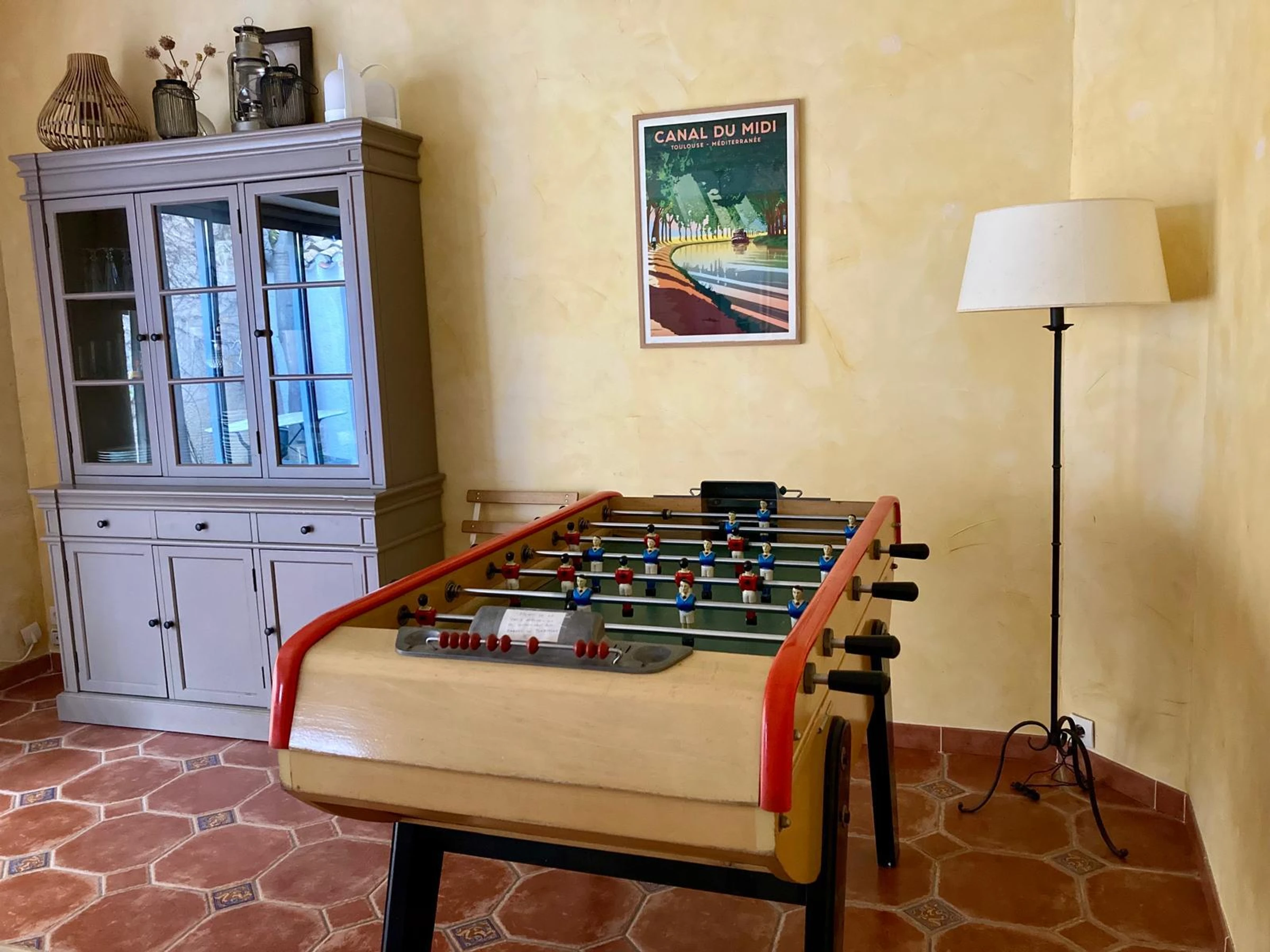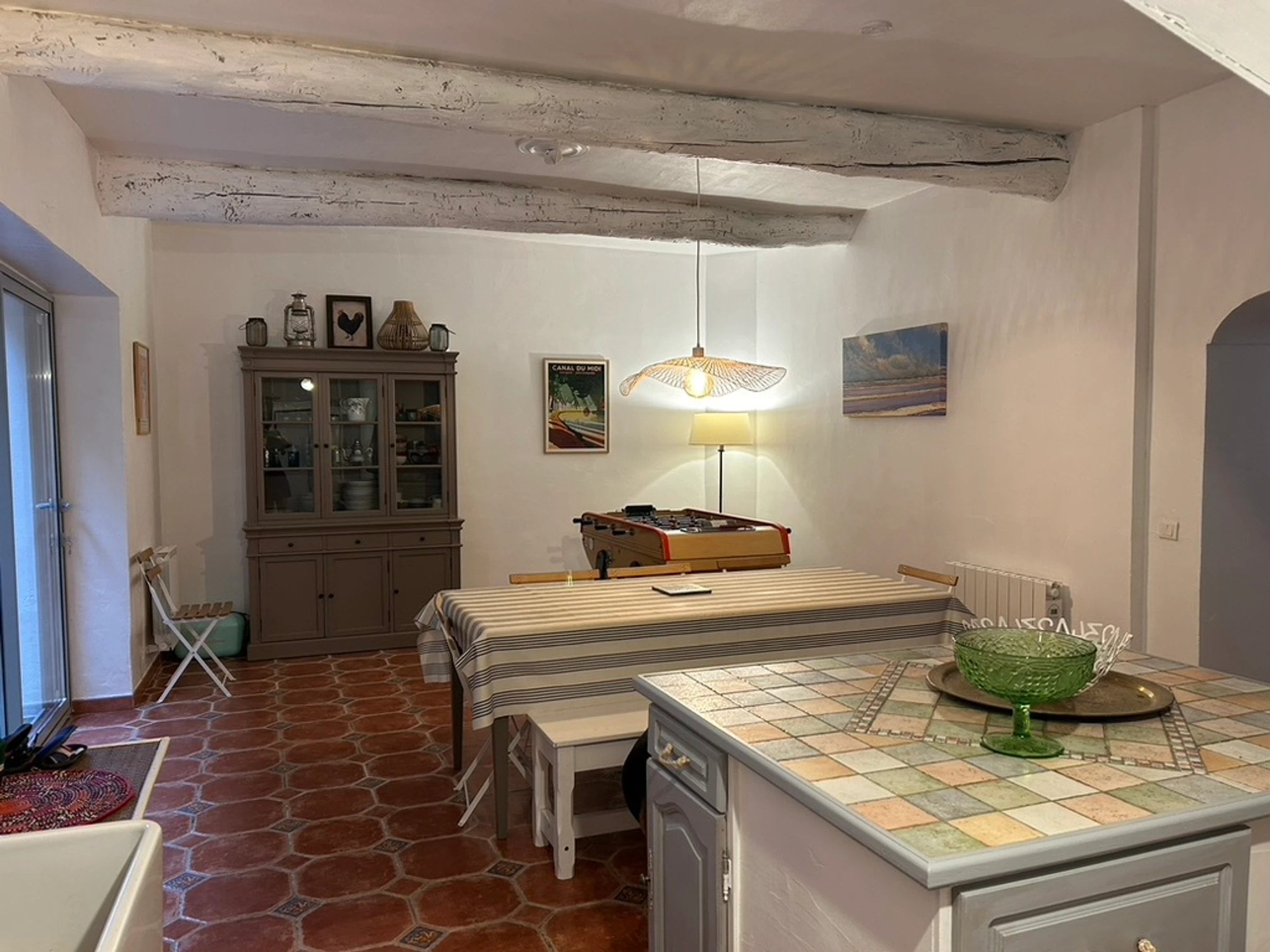 RDC : séjour (tv) avec Babyfoot, salon, salle de jeux, cuisine( piano de cuisson gaz, four, frigo américain, lave vaisselle, lave linge, micro ondes), salle à manger
