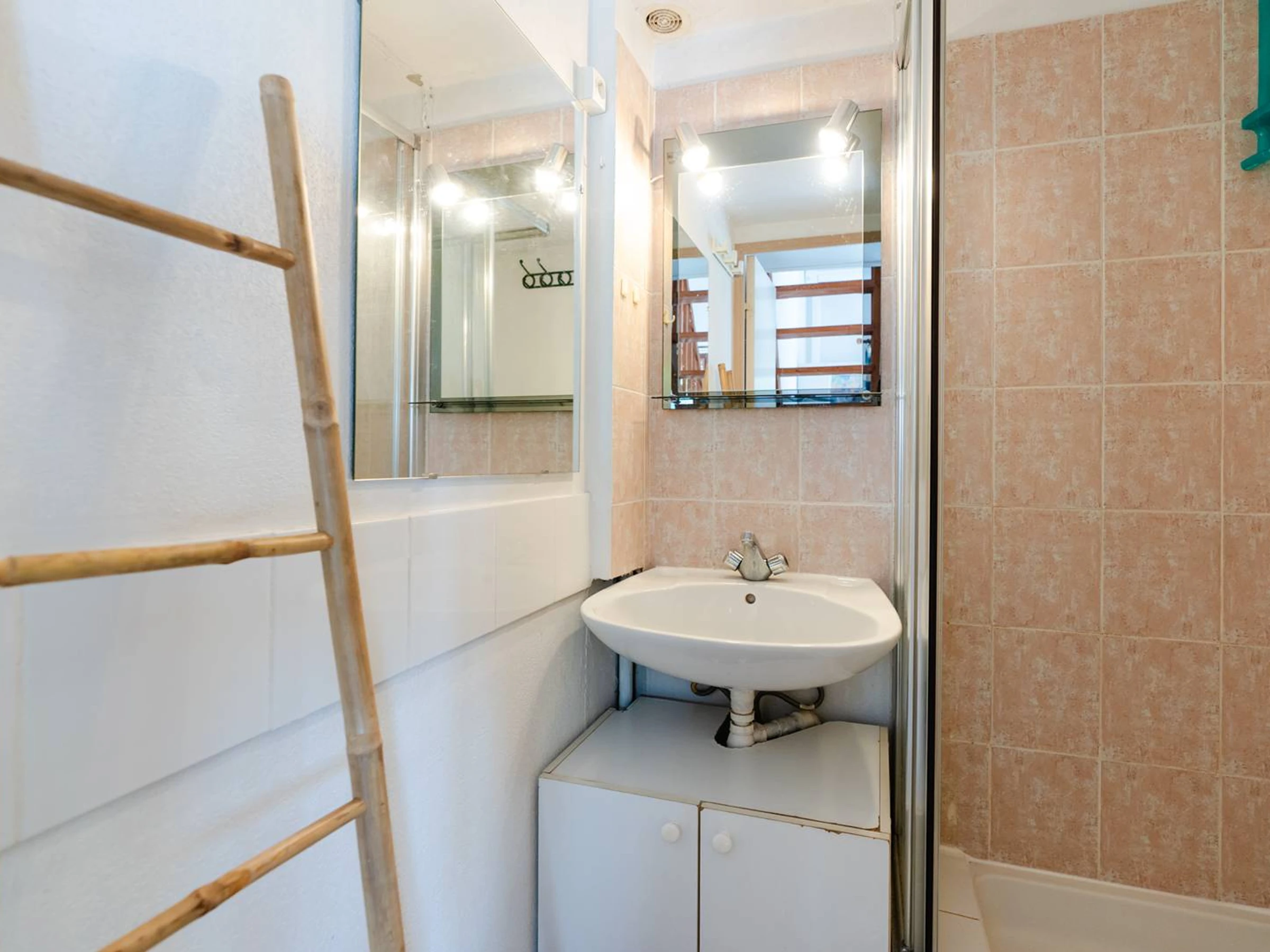 The bathroom has a washbasin, shower cubicle and WC.