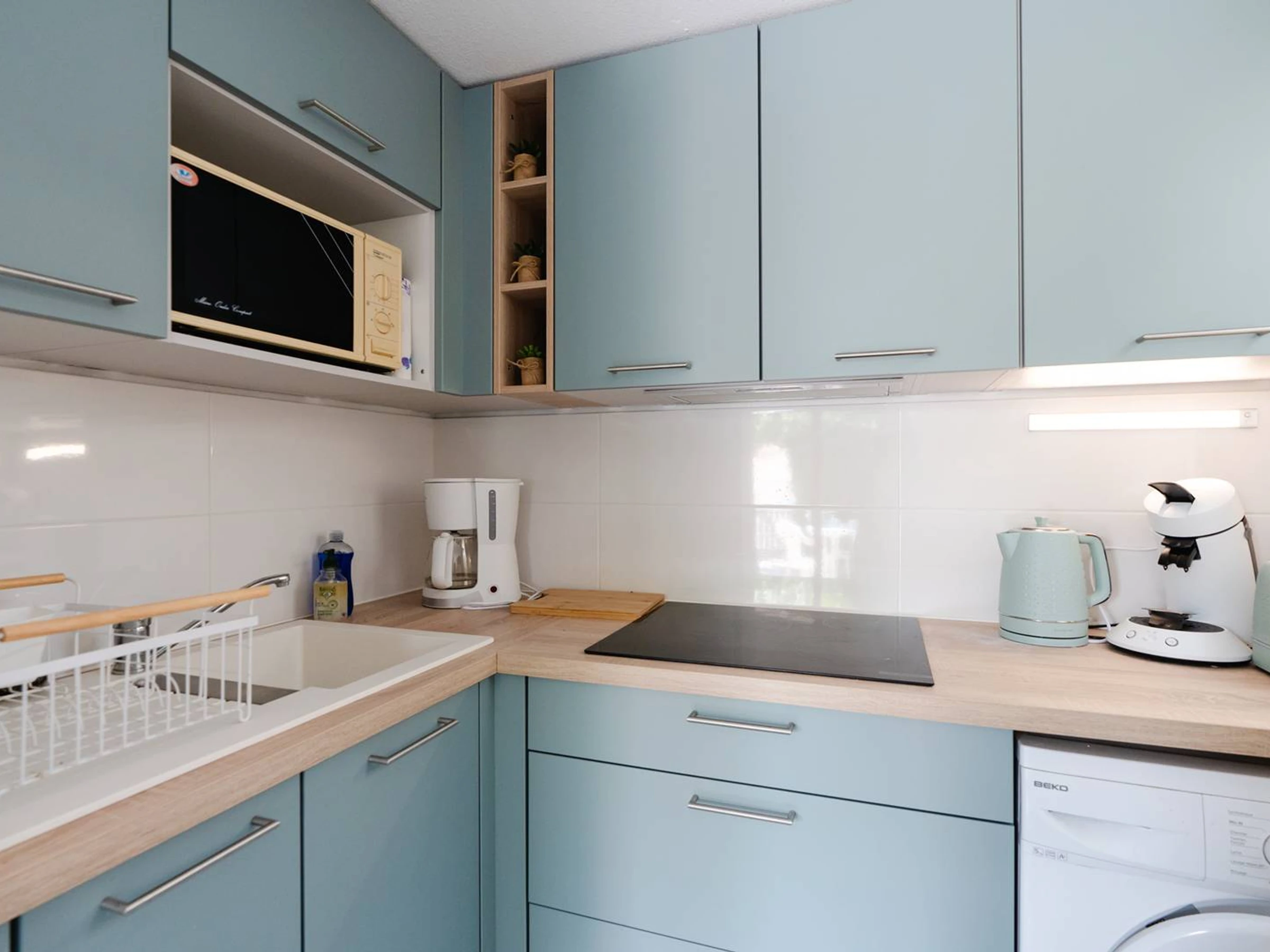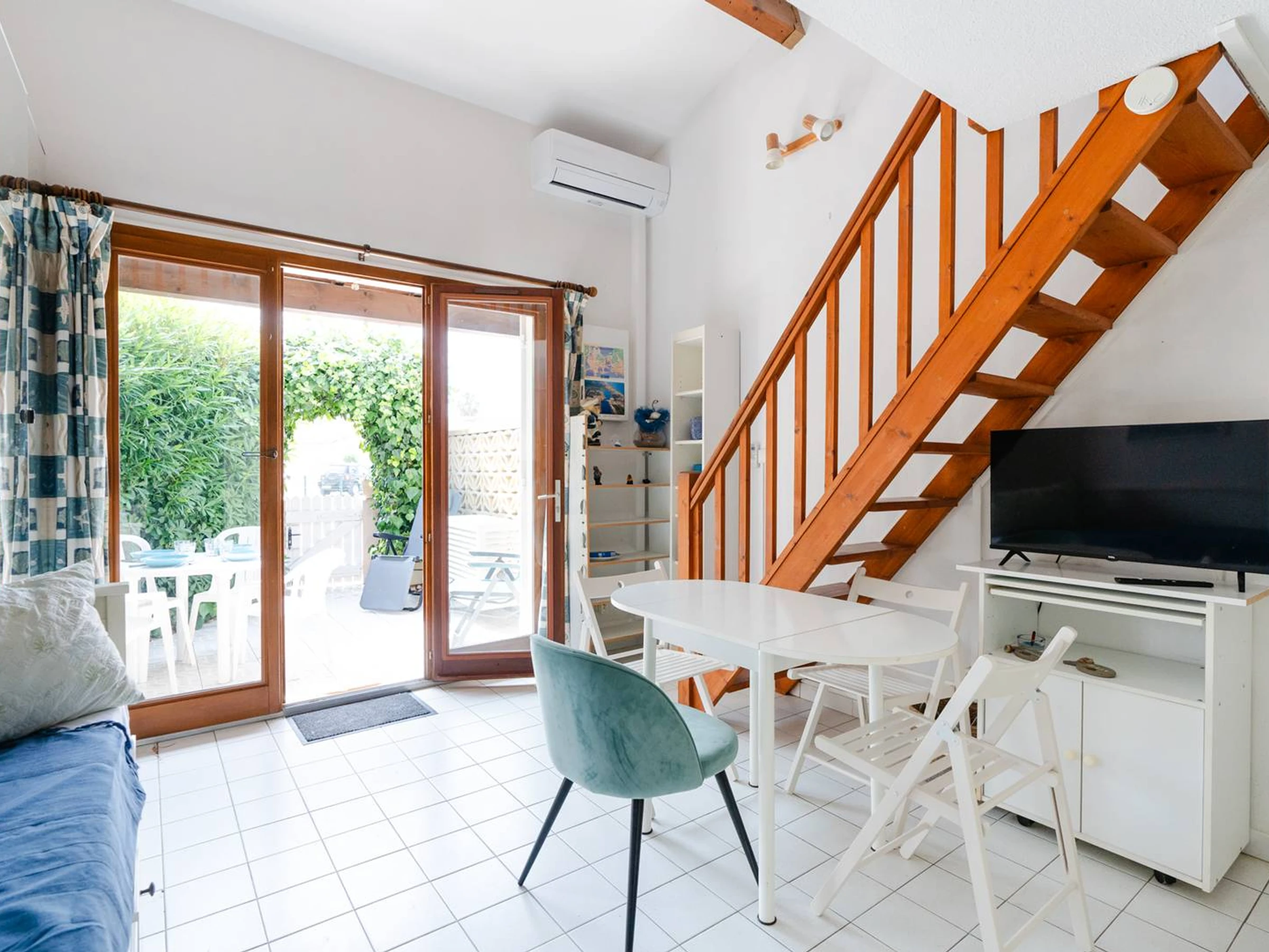 The living room on the ground floor has air conditioning, a sofa bed and a television with French channels only. The open-plan kitchen is equipped with a fridge-freezer, toaster, kettle, Senseo and classic coffee makers, a mini oven, a ceramic hob, a washing machine, a microwave and an extractor fan.