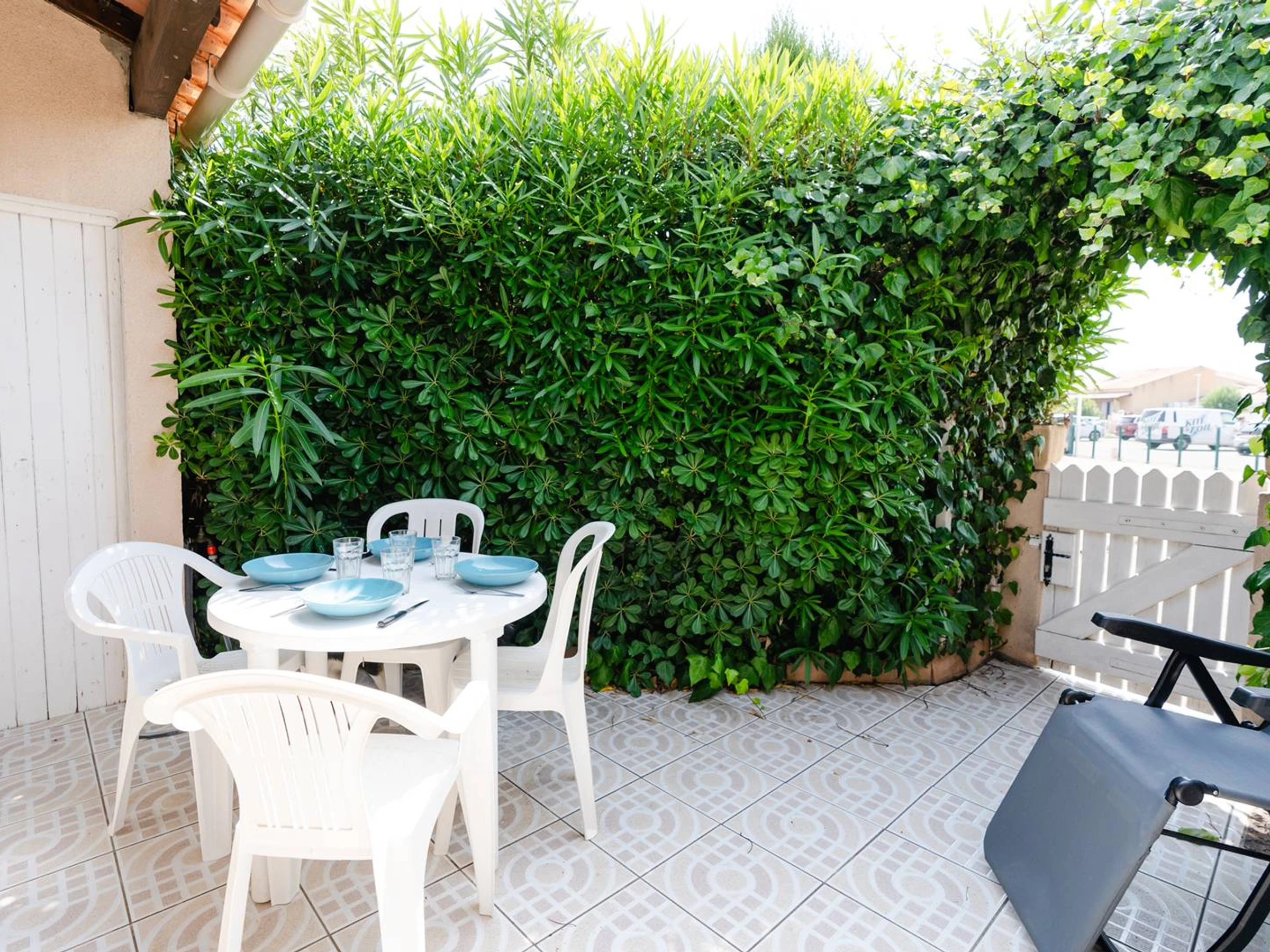 The terrace is furnished with seating for four people and two sun loungers.