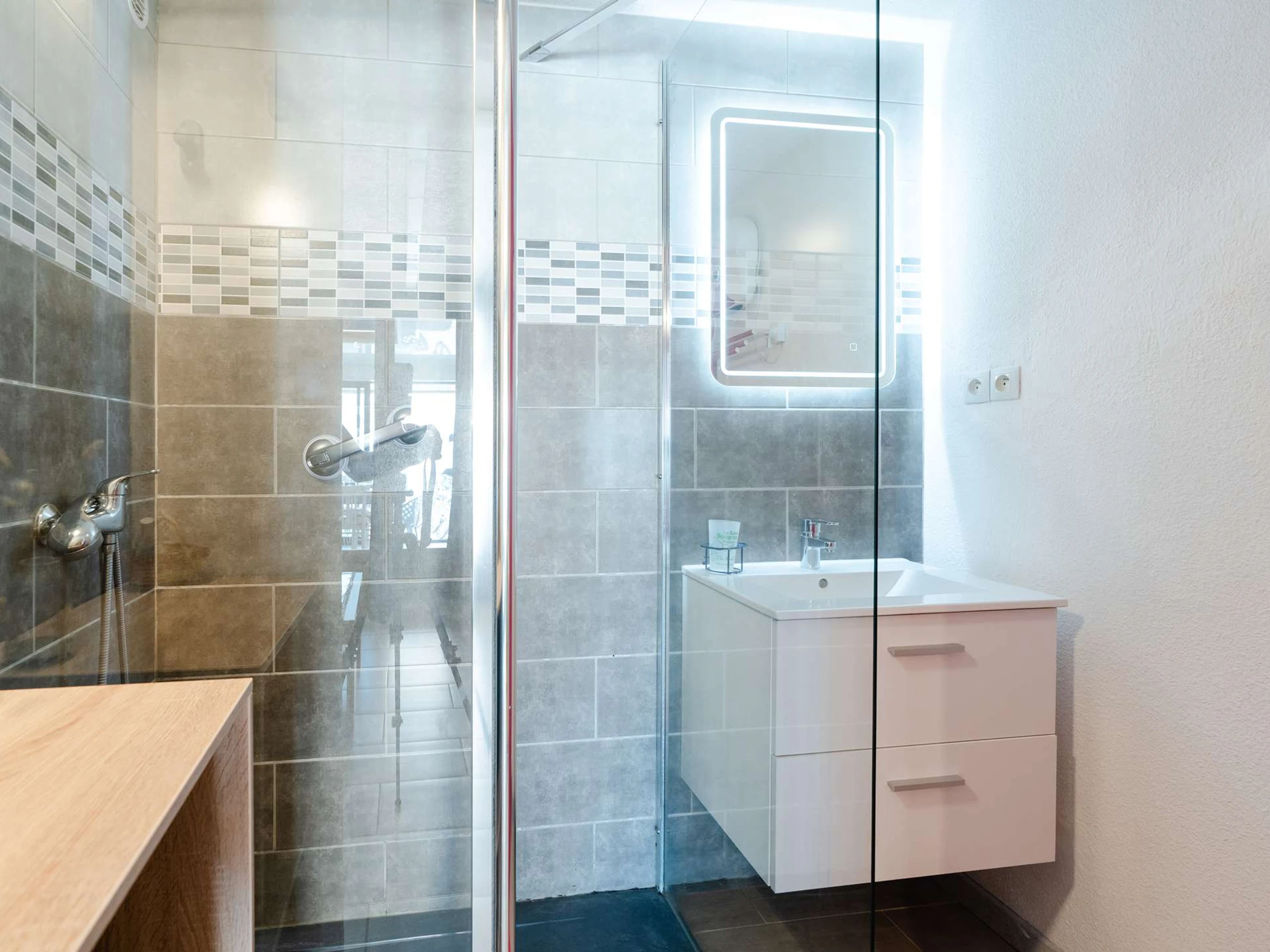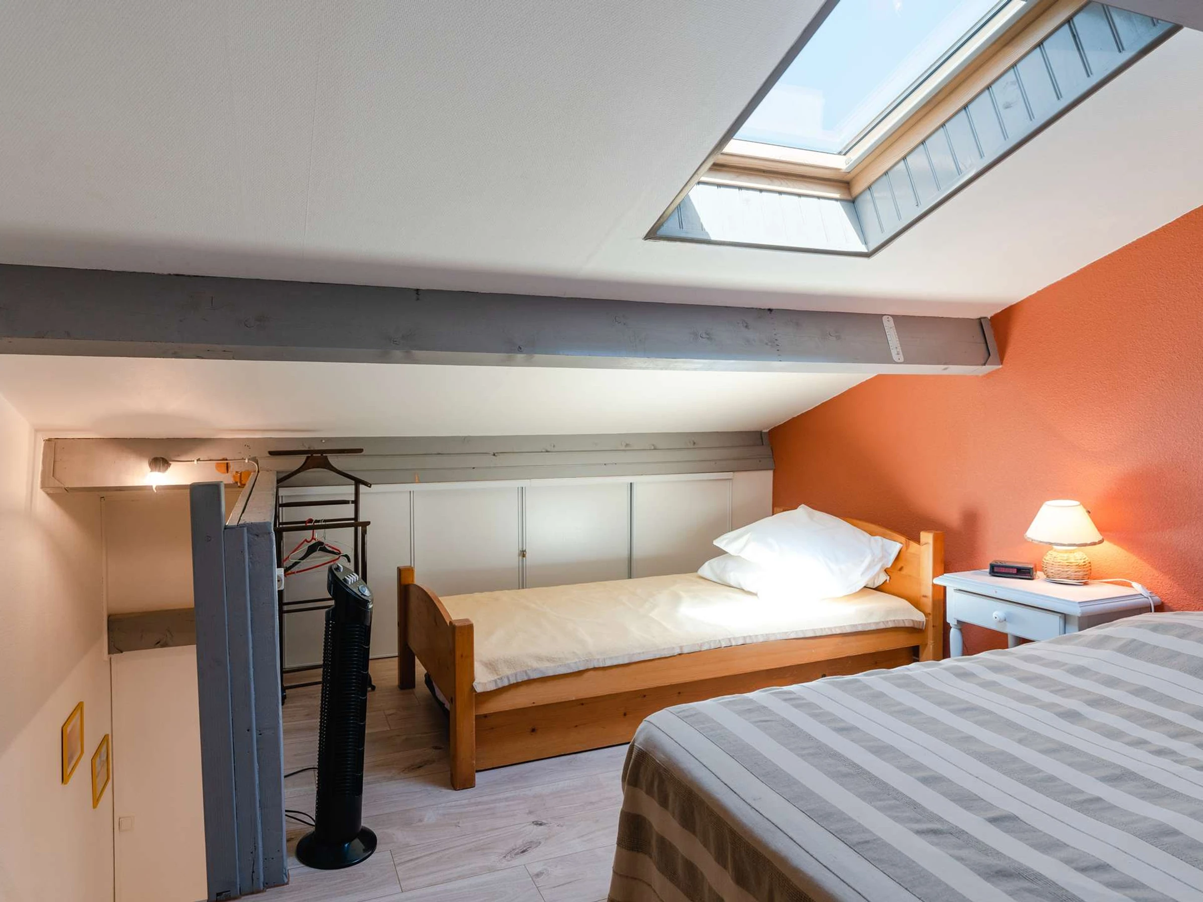 The living room is equipped with a sofa, coffee table, TV (French channels). The toilet is separate (with washing machine), and the bathroom is completely renovated (Italian shower, washbasin). The mezzanine on the first floor has a double bed (140x200), single beds (2x90x190), and storage space.