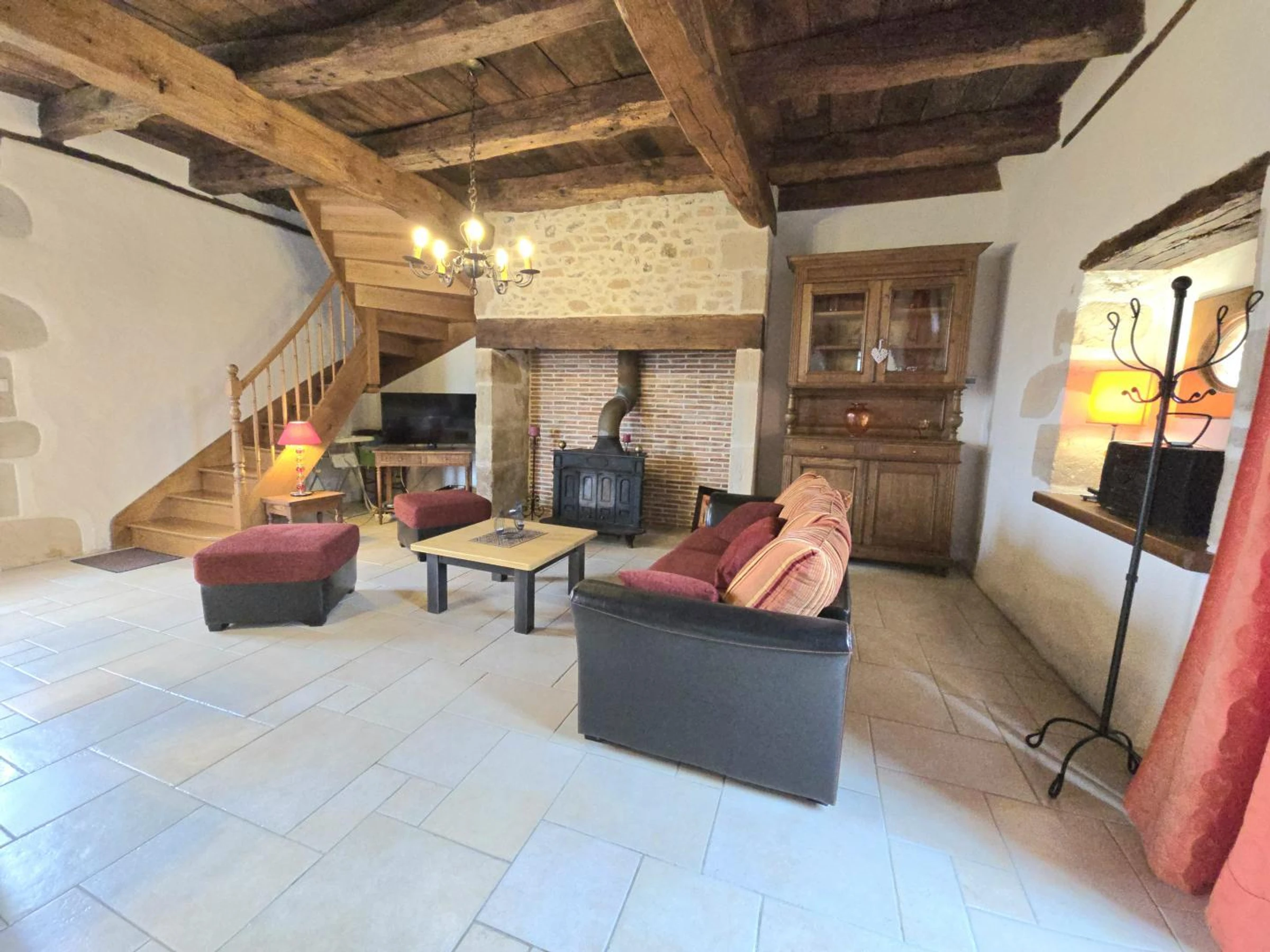 Upstairs in the house, you'll find an open-plan living area with a double bed (140x190cm), a shower room with toilet, and a bedroom with a double bed (140x190cm) and a single bed (90x190cm). Located in the commune of Hautefort, 3 km from the Château de Hautefort (castle and gardens) and the Museum of Medicine, and not far from Tourtoirac and its cave with concretions.