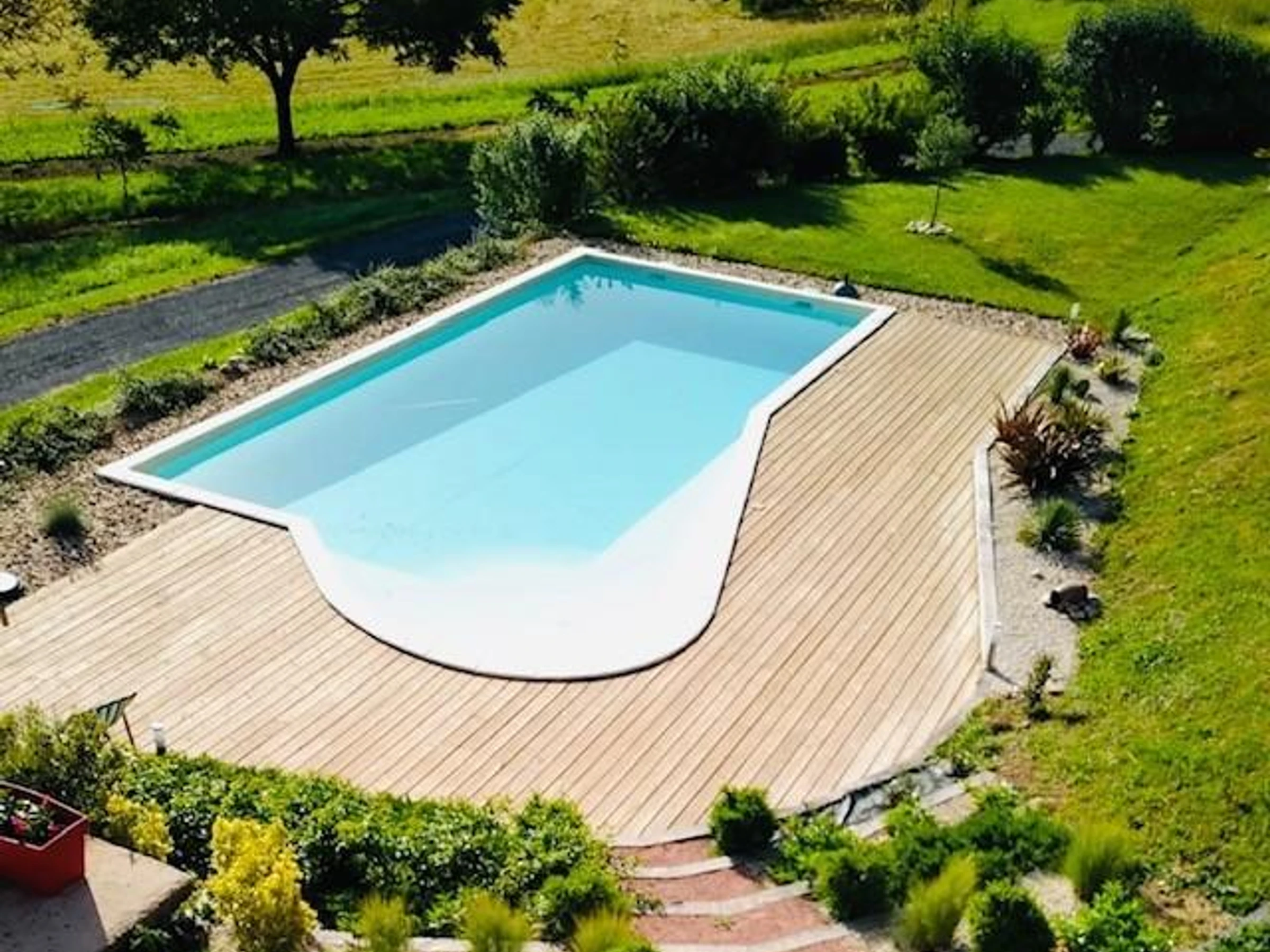 On the ground floor, you'll find a living room with a lounge, dining area, and fully equipped open-plan kitchen, a bathroom with a shower, corner bathtub, and toilet, as well as a bedroom with a queen-size bed (160x200 cm). From the living room, you can enjoy the chlorine swimming pool, available from mid-June to the end of October and secured by an alarm (dimensions 5x11 m, depth 1.50 m to 1.85 m, with a family area 0.25 m deep).