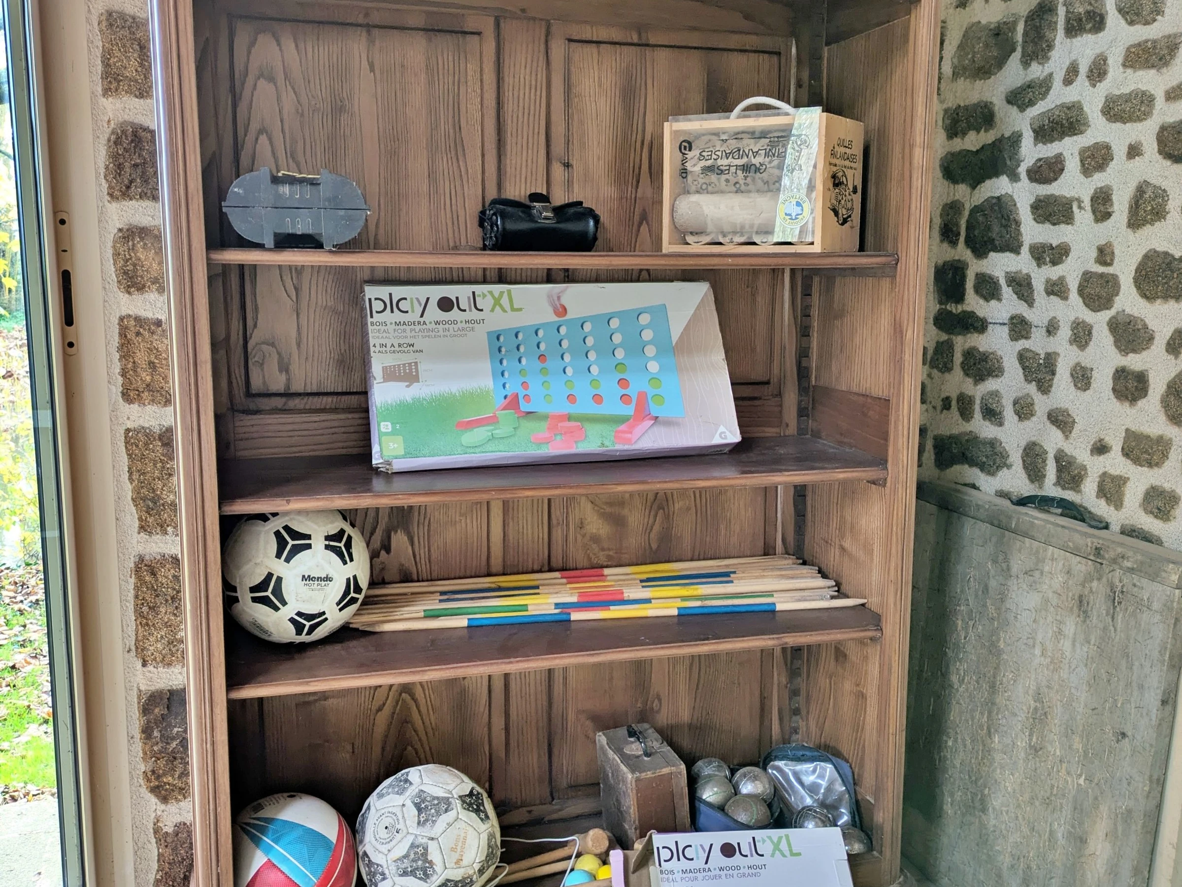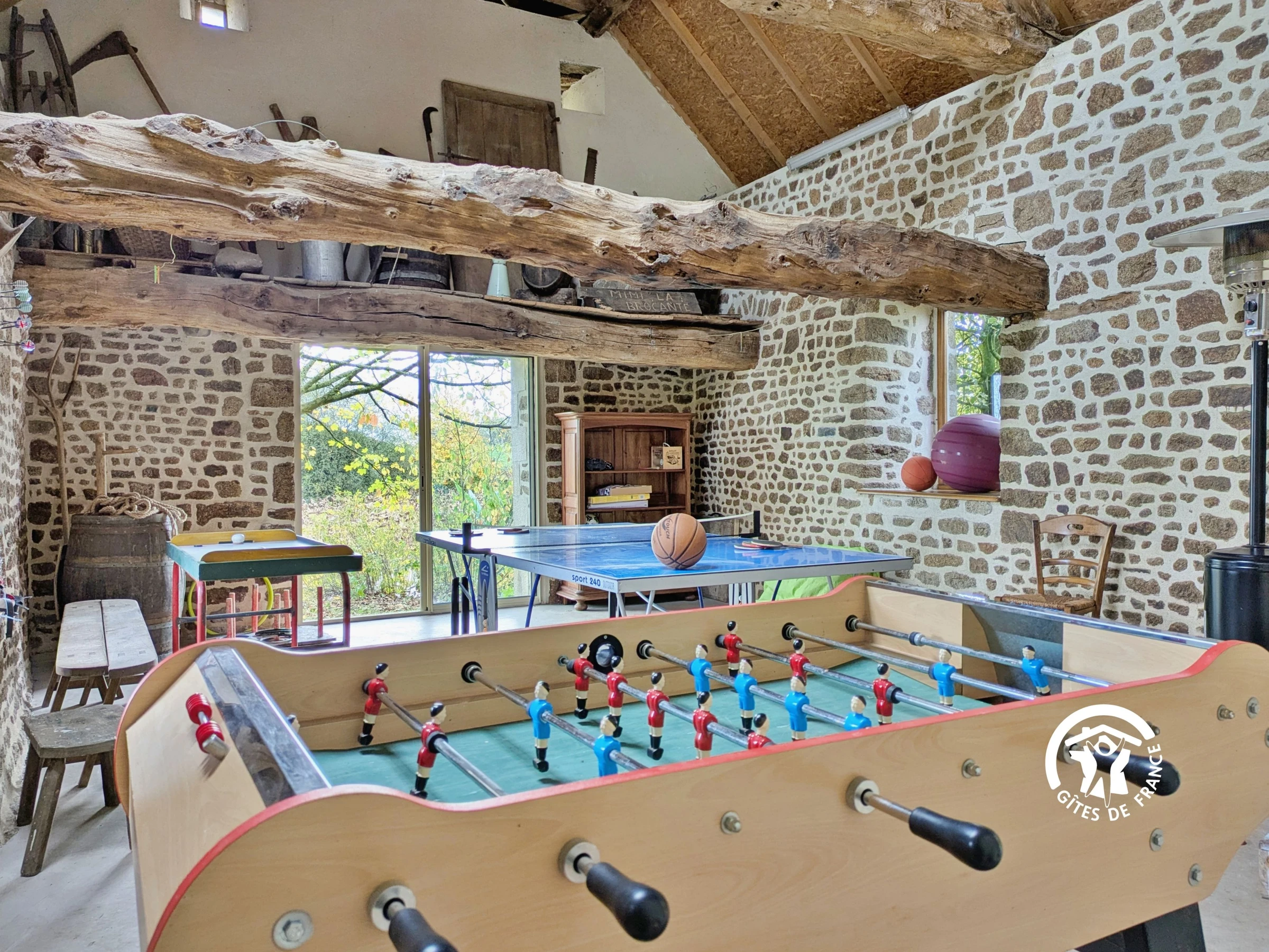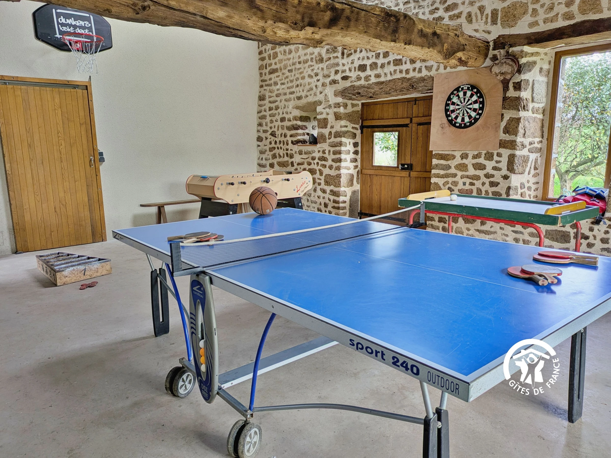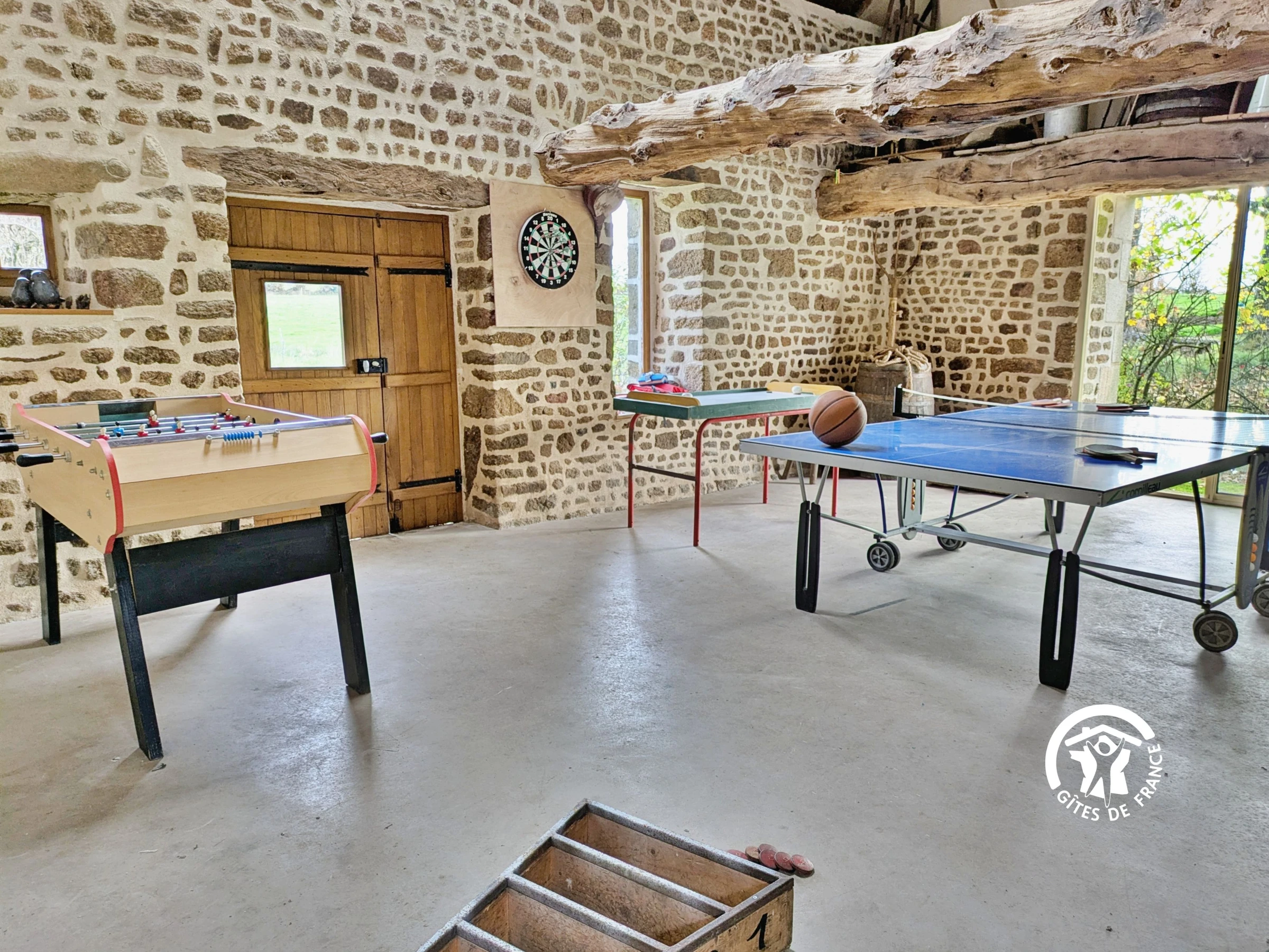 Games room: foosball, darts, ping-pong table, basketball hoop, pétanque balls, Molkky, shuffleboard, skittles...