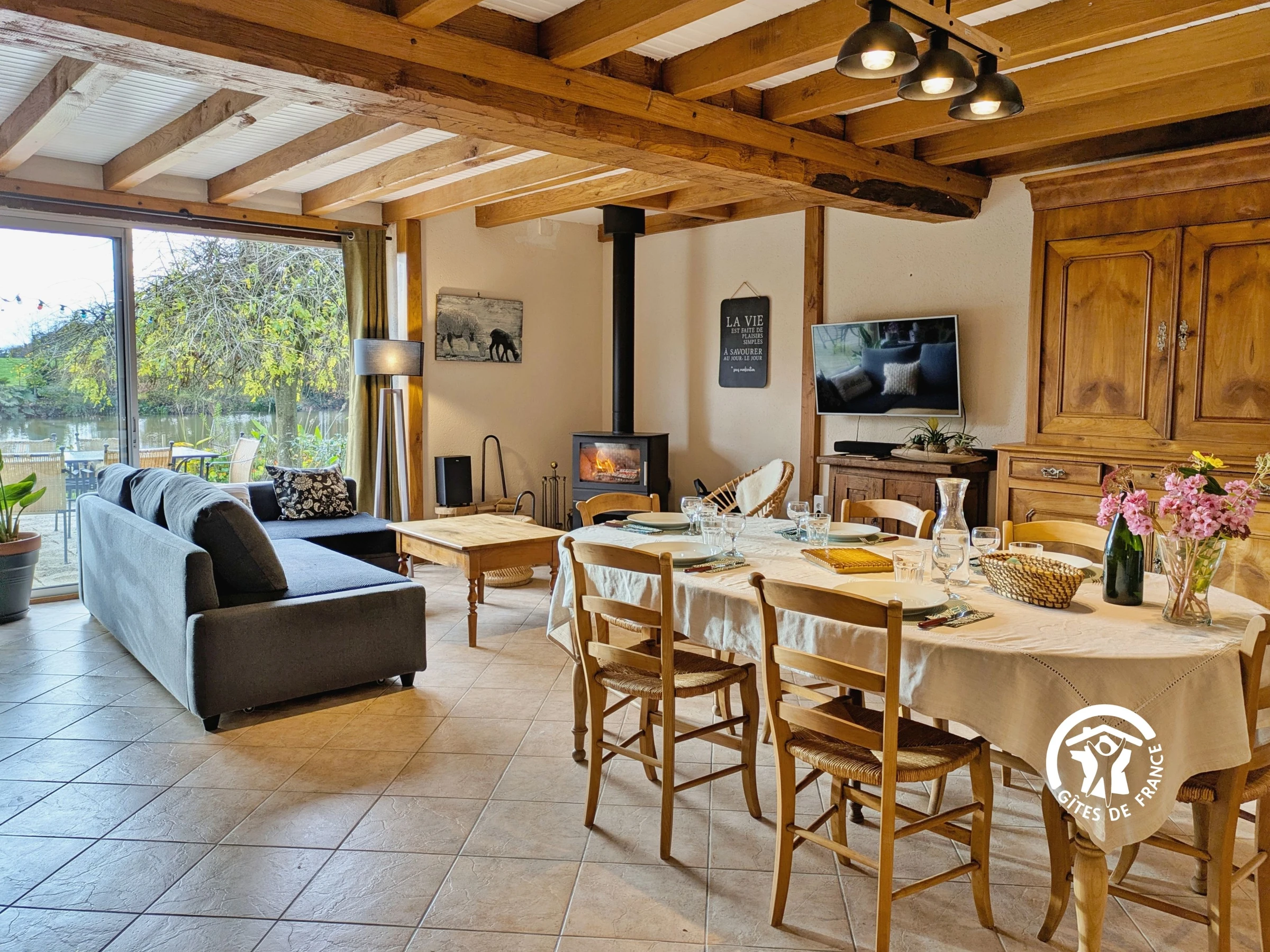 Shops and services: Gorron (5 km) Single-storey cottage: Equipped kitchen (10m²): oven, 3-burner gas hob, refrigerator, dishwasher, microwave, toaster, filter coffee maker, Bialetti-type Italian coffee maker, kettle, "Companion" food processor, electric mixer, immersion blender, crepe maker, fondue set, raclette grill - Living area (37m²): board games, TV, wood-burning stove, sofa and armchairs, smart speaker - Shower room (5.8m²): walk-in shower, towel warmer, hairdryer, washer-dryer, WC - Separate WC - Utility room (4m²): second refrigerator and freezer compartment - Bedroom 1 (12.7m²): 2 single beds (90*200cm), wardrobe, desk - Bedroom 2 (18m²): 1 double bed (160*200cm) and 1 single bed (90*200cm), large bay window overlooking the Terrace and pond view.
