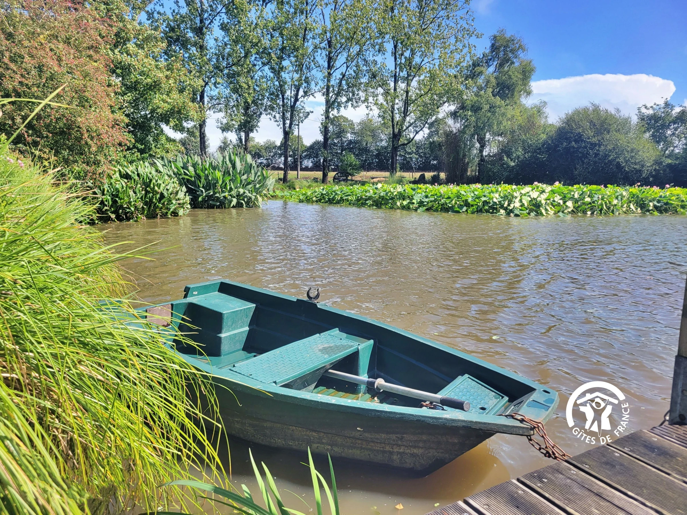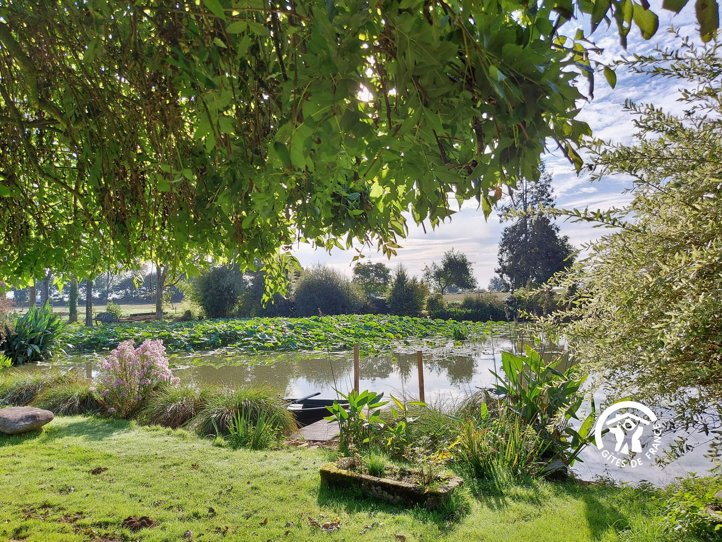 The 5,000 m² pond, located in front of the cottage, is perfect for a peaceful stroll, a boat ride, or even a fishing trip (carp, tench, roach). In spring, the grounds burst into a thousand colors thanks to lotuses, roses, hydrangeas, and many others.