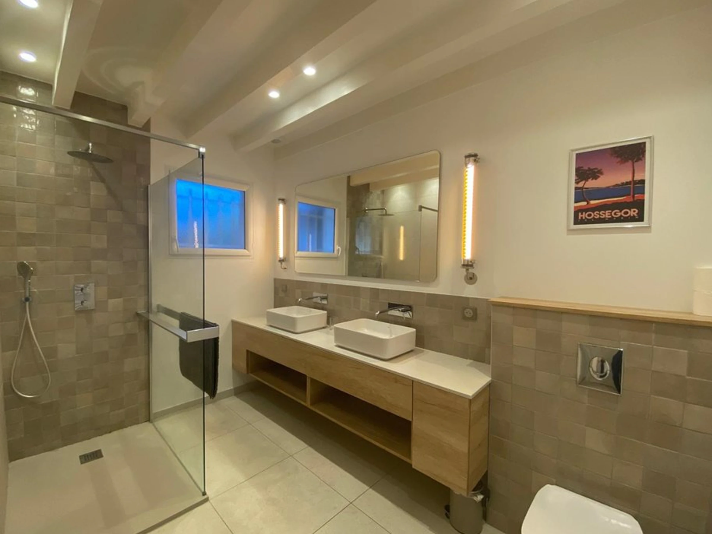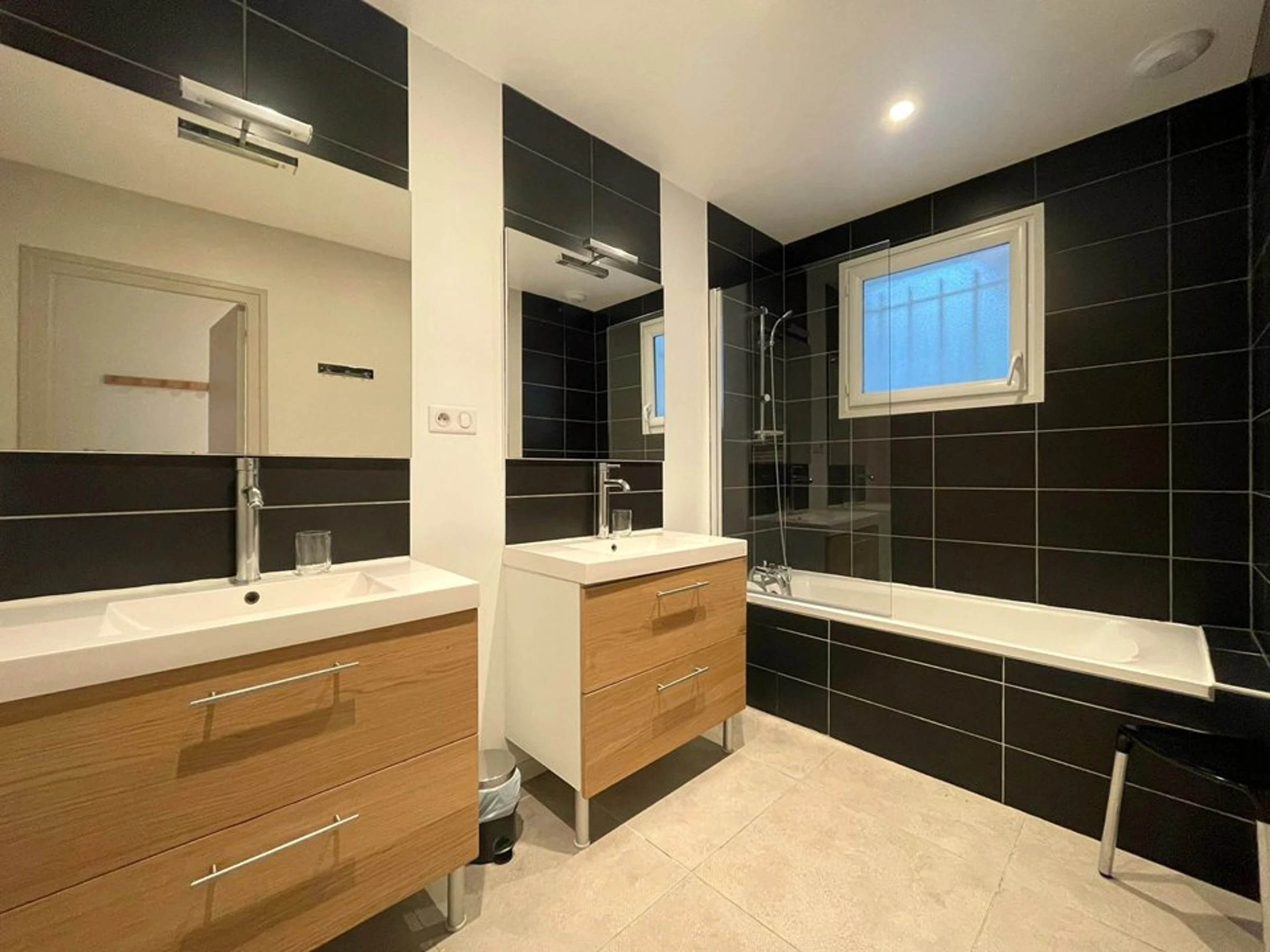 - une salle de bain avec double meuble, double vasque, double miroir et sa baignoire.