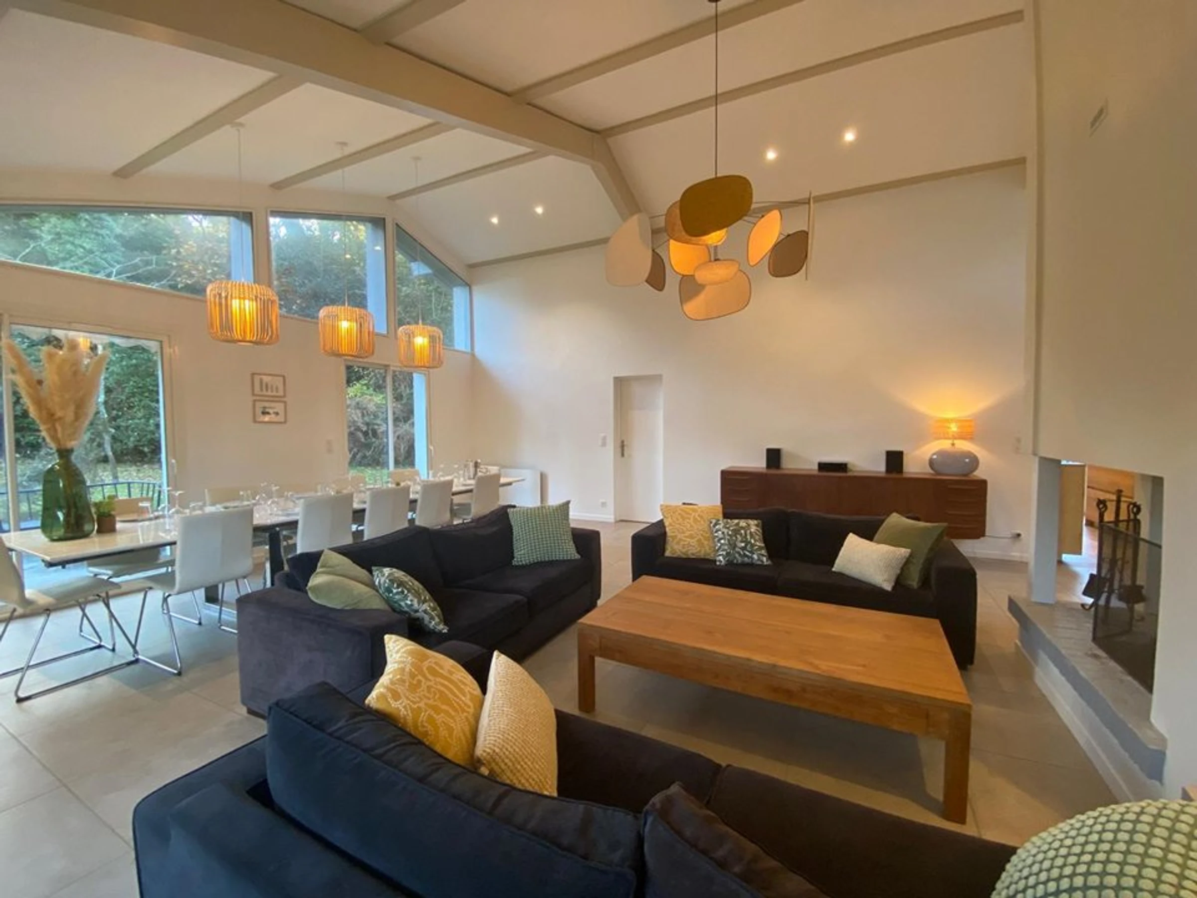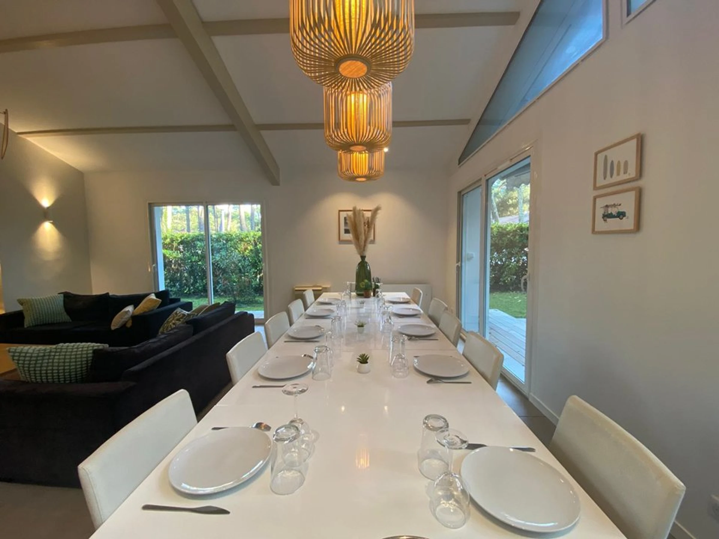 - un double séjour avec un coin TV lecture ouvert sur la cuisine et traversant avec la véranda, un 2nd coin séjour lounge, suivi d'une salle à manger avec une table pouvant accueillir 12 pers. Ces espaces communs sont dotés d'un accès direct vers l'extérieur.