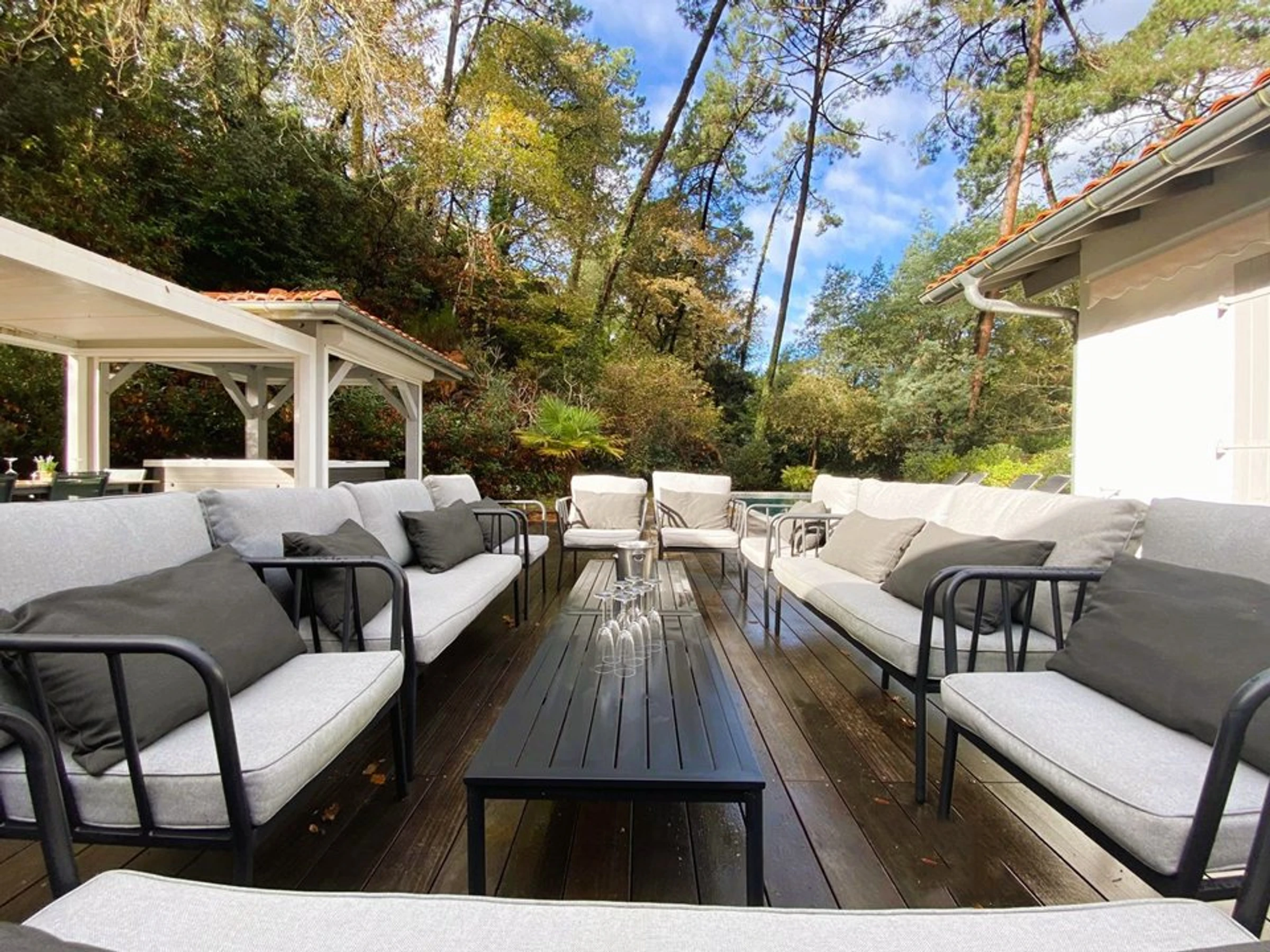En extérieur vous y trouverez un vaste jardin de plus de 2000m2 entouré de Pins, ainsi qu'une spacieuse terrasse vous offrant :