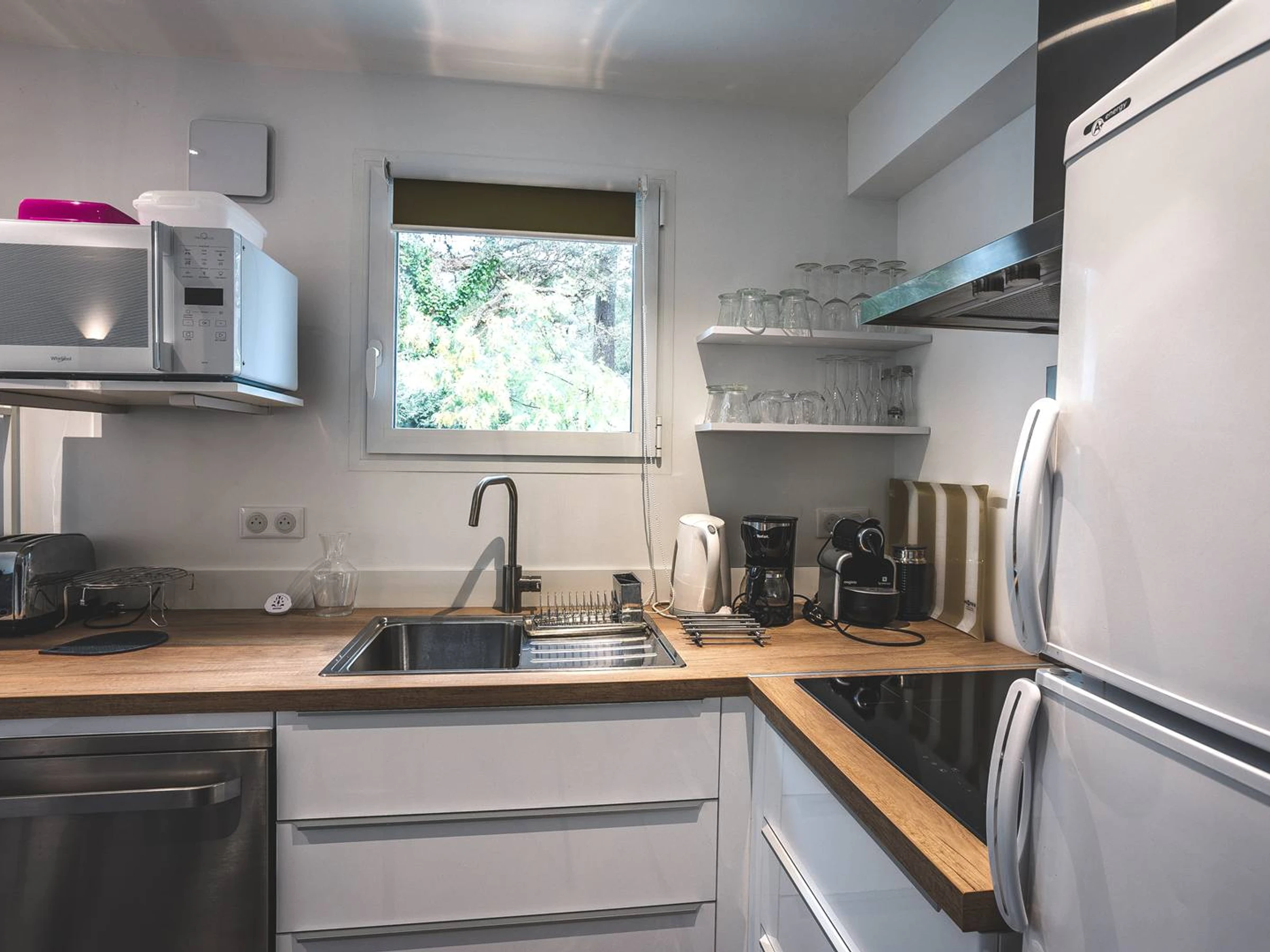 Main room with living room (2.94 x 5.46) with TV opening onto the terrace overlooking the golf course. Kitchen area: fridge-freezer, 4-burner induction hob, microwave, Nespresso coffee maker, washing machine and dryer.