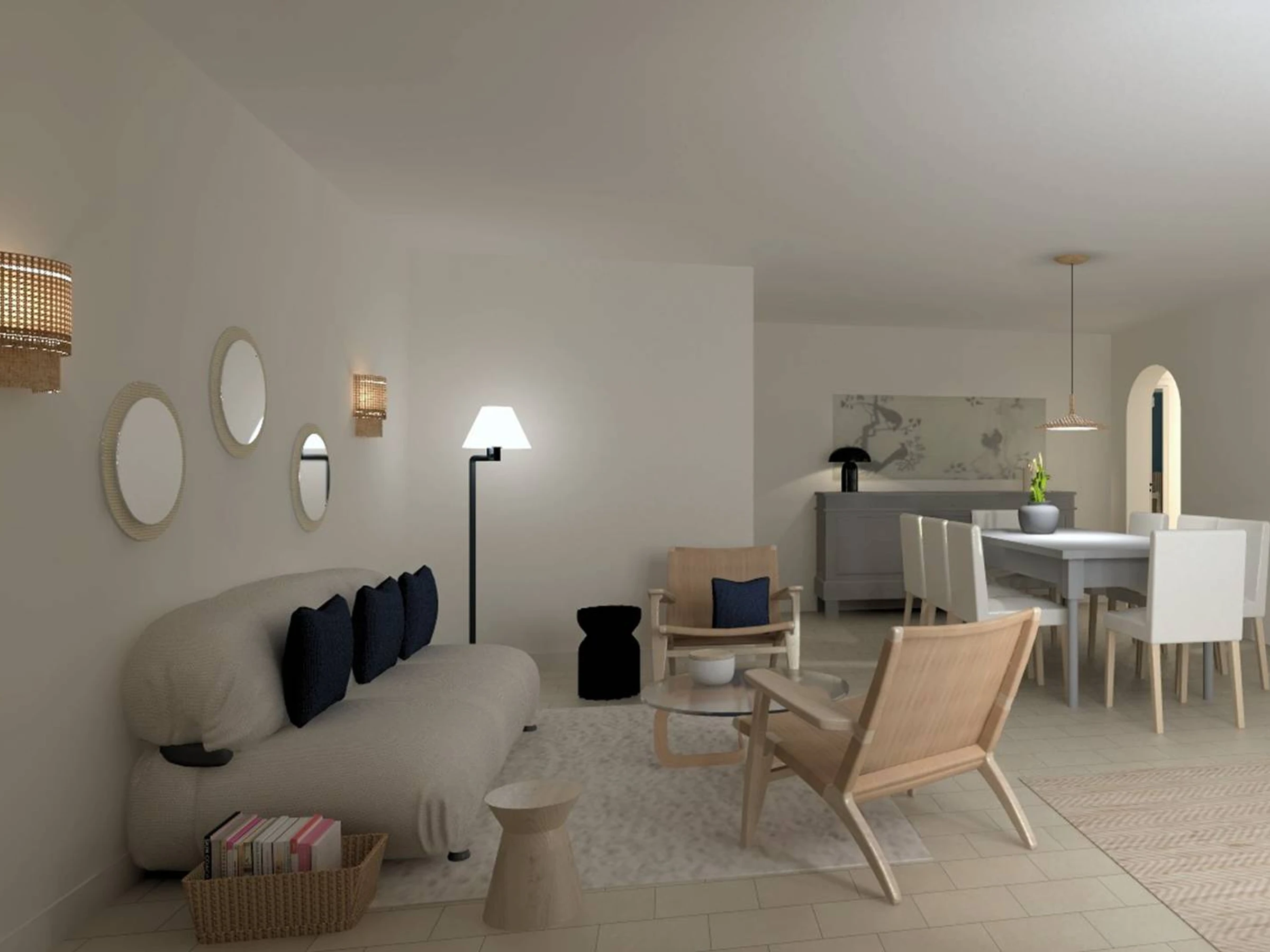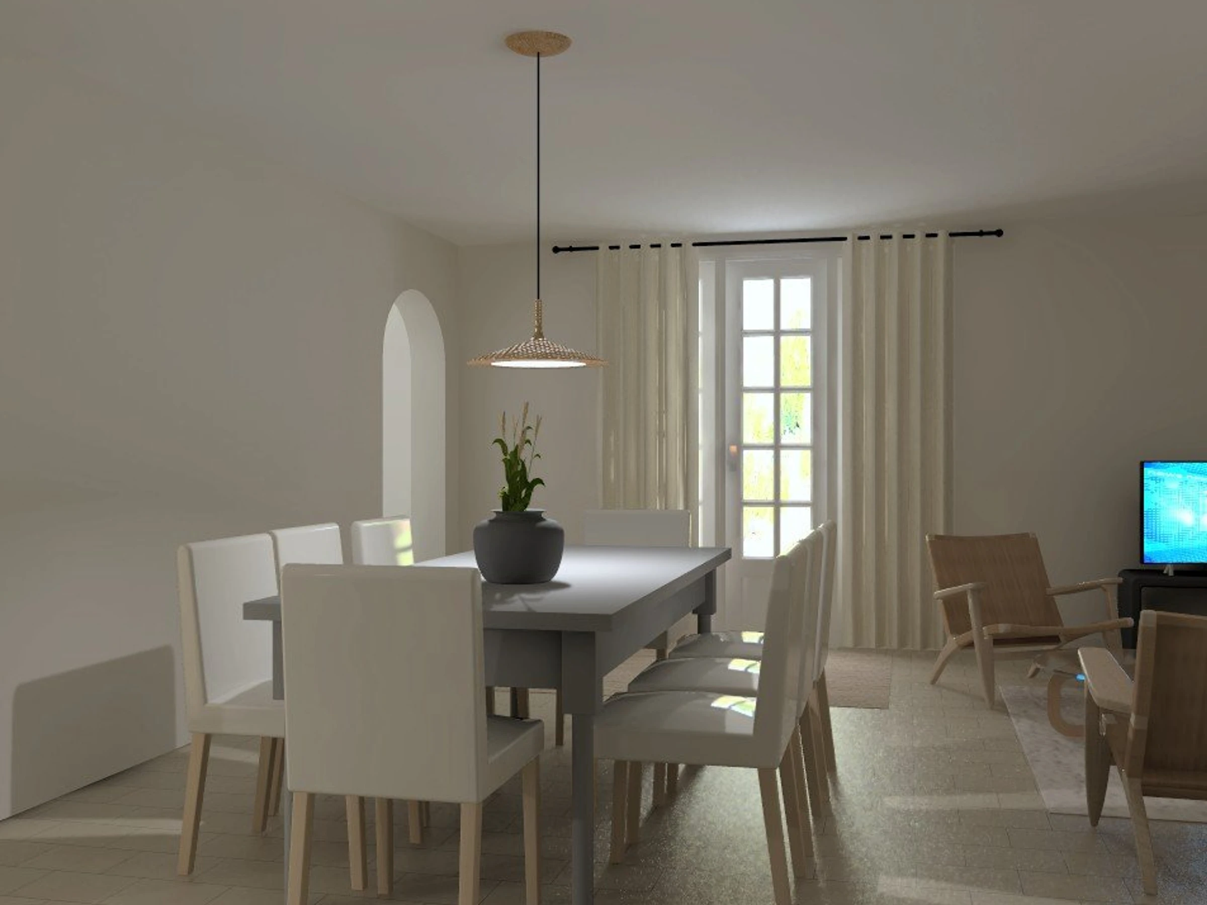 The living area is bright and spacious, with a south-facing living room of approximately 31 sqm opening onto the terrace, which is equipped for outdoor dining (table, chairs and barbecue).