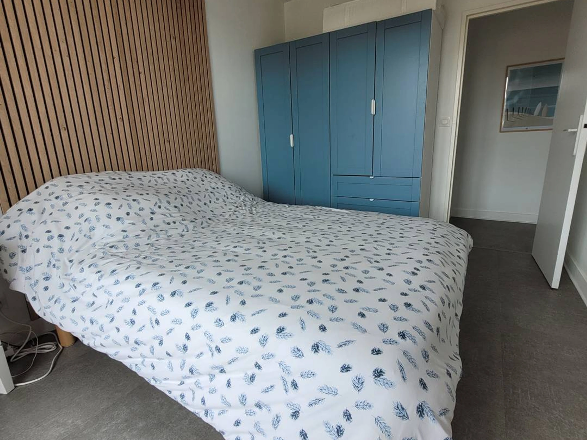 The bedroom is equipped with a double bed (140 cm), a wardrobe and air conditioning, and opens onto a second east-facing balcony overlooking the quiet garden at the rear of the residence.