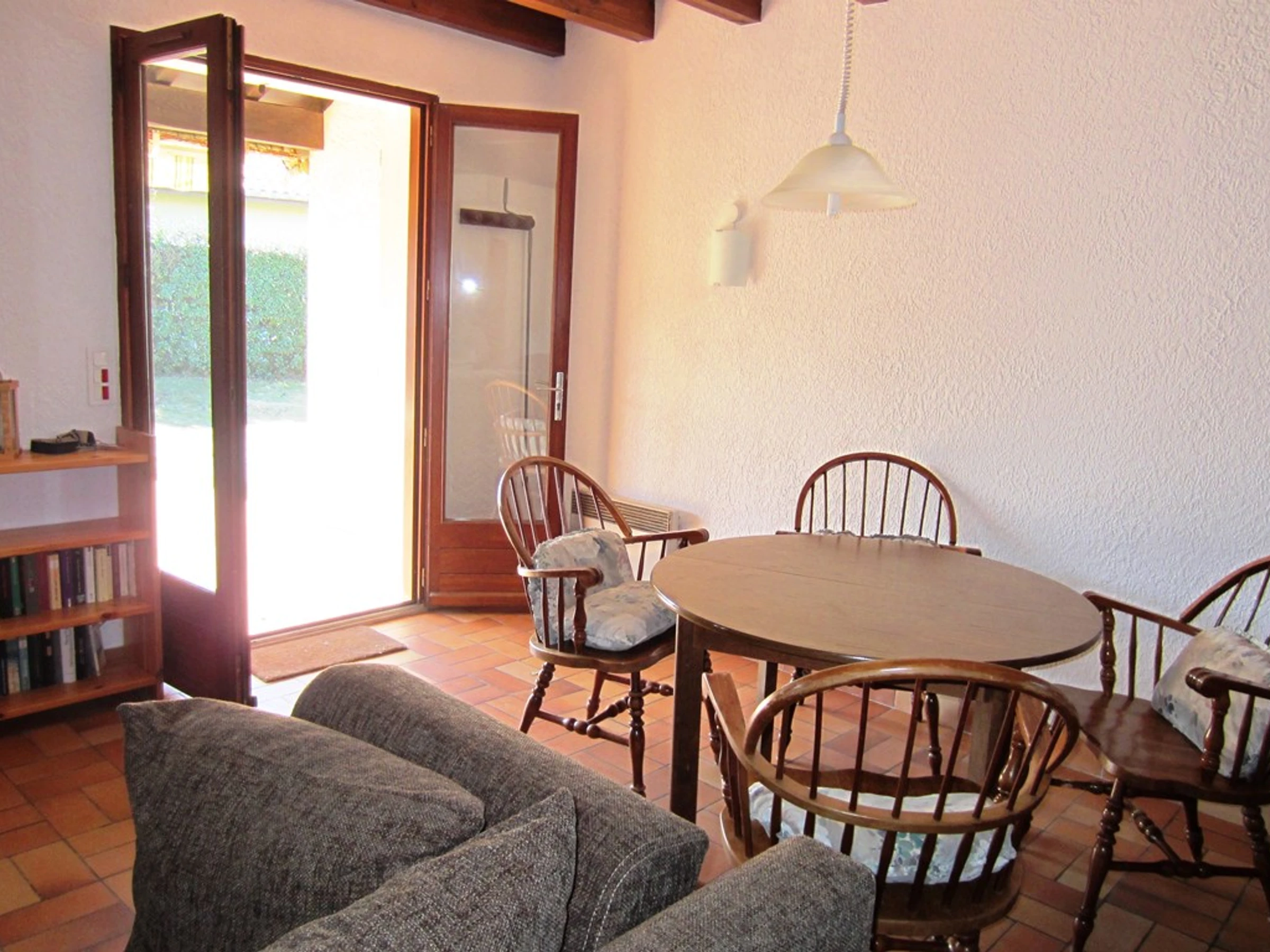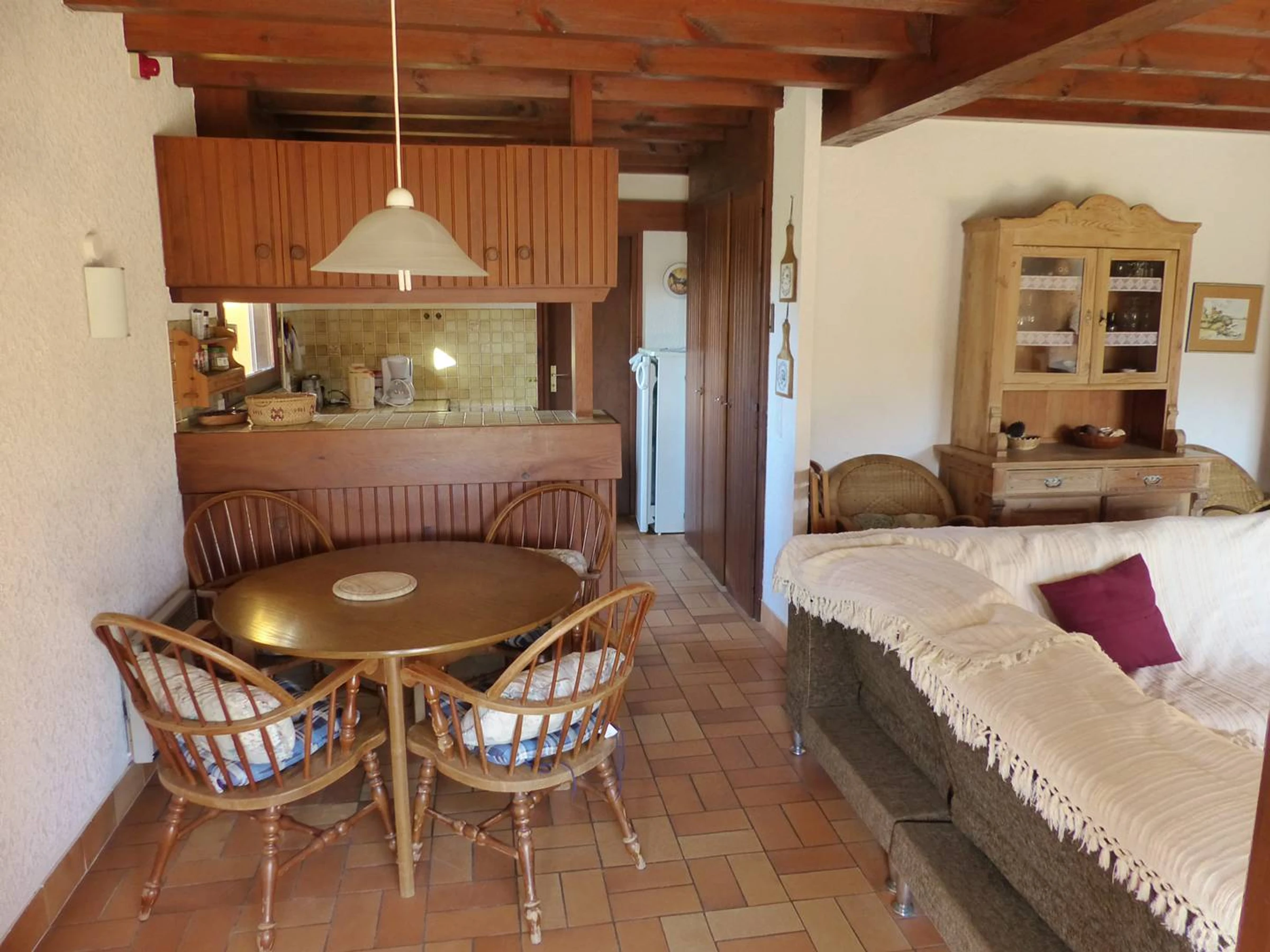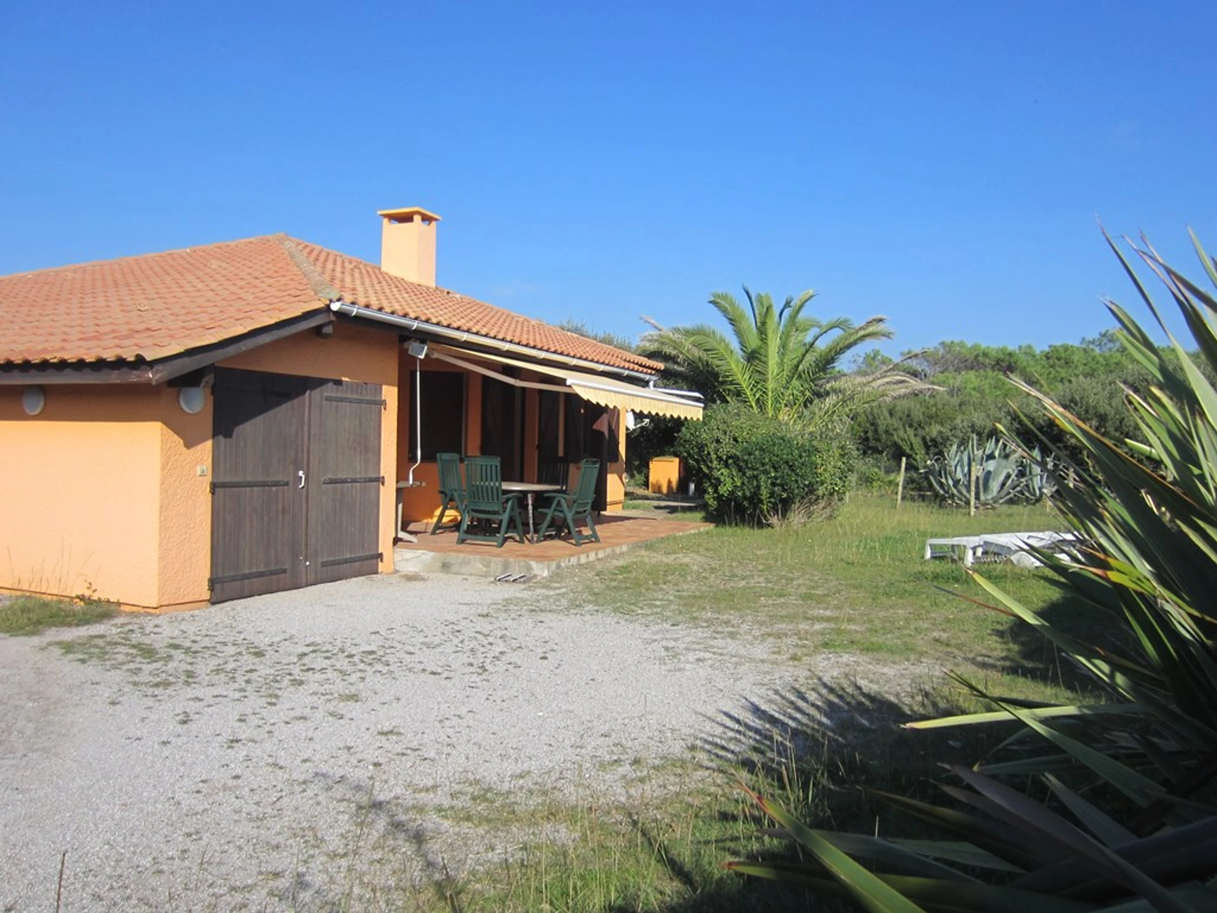 Living room opening onto the covered terrace facing south – TV in German language only. Kitchen area separated by bar unit (fridge-freezer, cooker with ceramic hob, oven and dishwasher) with west window overlooking the garden – Cellar (washing machine). Bedroom 1 facing South: 2 bunk beds. Bedroom 2 facing East: 2 single beds. Bedroom 3: 2 single beds pushed together. Shower room: shower and washbasin – WC – A cot and a high chair available – Locked garage for the owner's personal belongings. The whole is simple and basic, rental appreciated for its large garden, its proximity to the beach " naturists" and the cycle path.