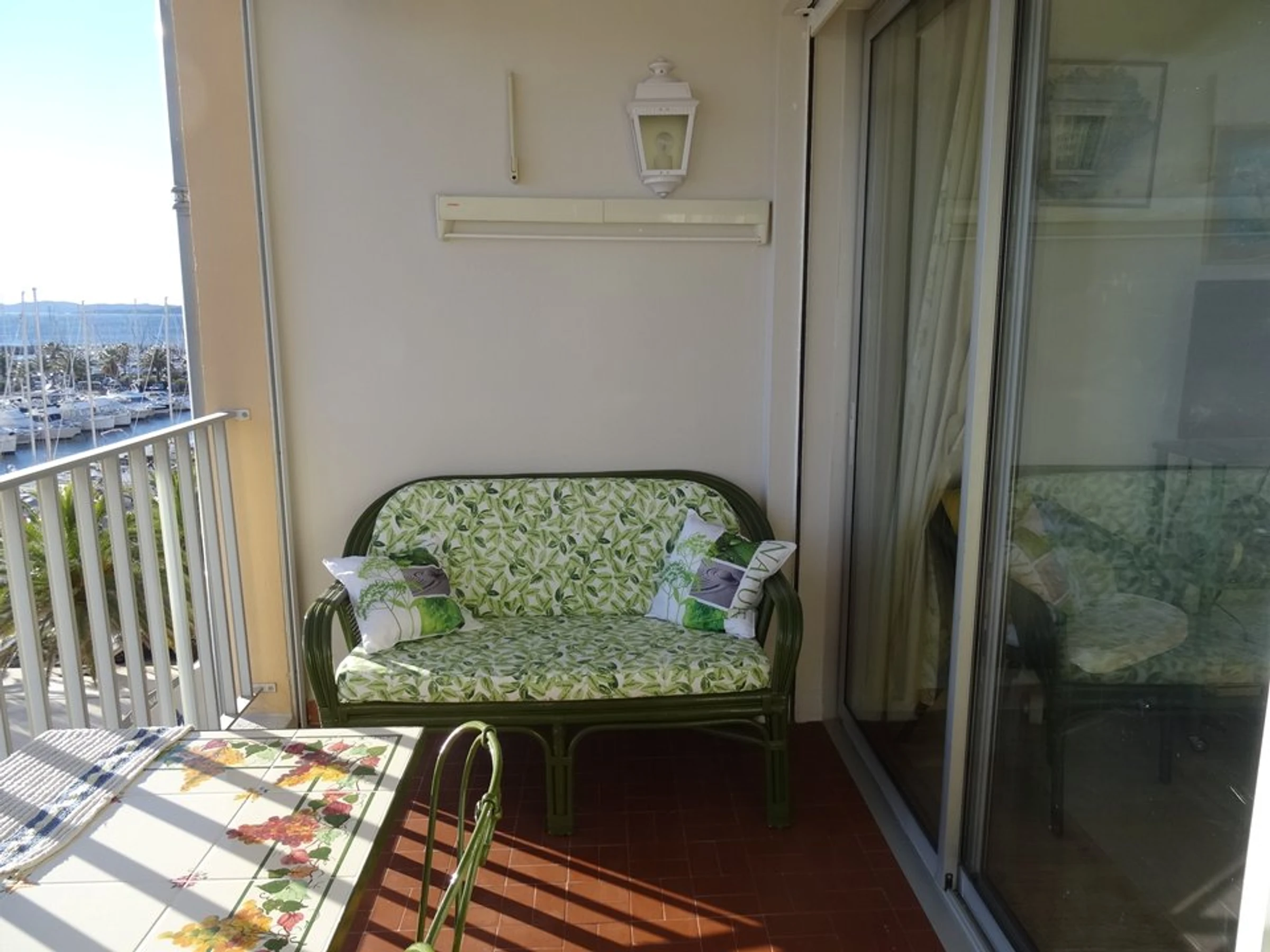 Magnificent view of the PORT AND ISLANDS, this apartment benefits from an EAST exposure facing the Islands with loggia. In the heart of the Marina, close to shops, beaches and 1.5KM from the Airport. Composition: Furnished studio for 2 people, on the 4th floor with elevator Surface area 30m² approx + loggia 5 m². An entrance with wardrobe, A bathroom with bathtub and WC, a living room opening onto a loggia with sea view, equipped with a bed for 2 people, TV and dining area, WIFI. Fan. An adjoining kitchen equipped with: Refrigerator, washing machine, dishwasher, electric stove, microwave oven, complete crockery. A parking space. Household linen is not provided but can be ordered. Electricity consumption is extra from October 1 to April 30