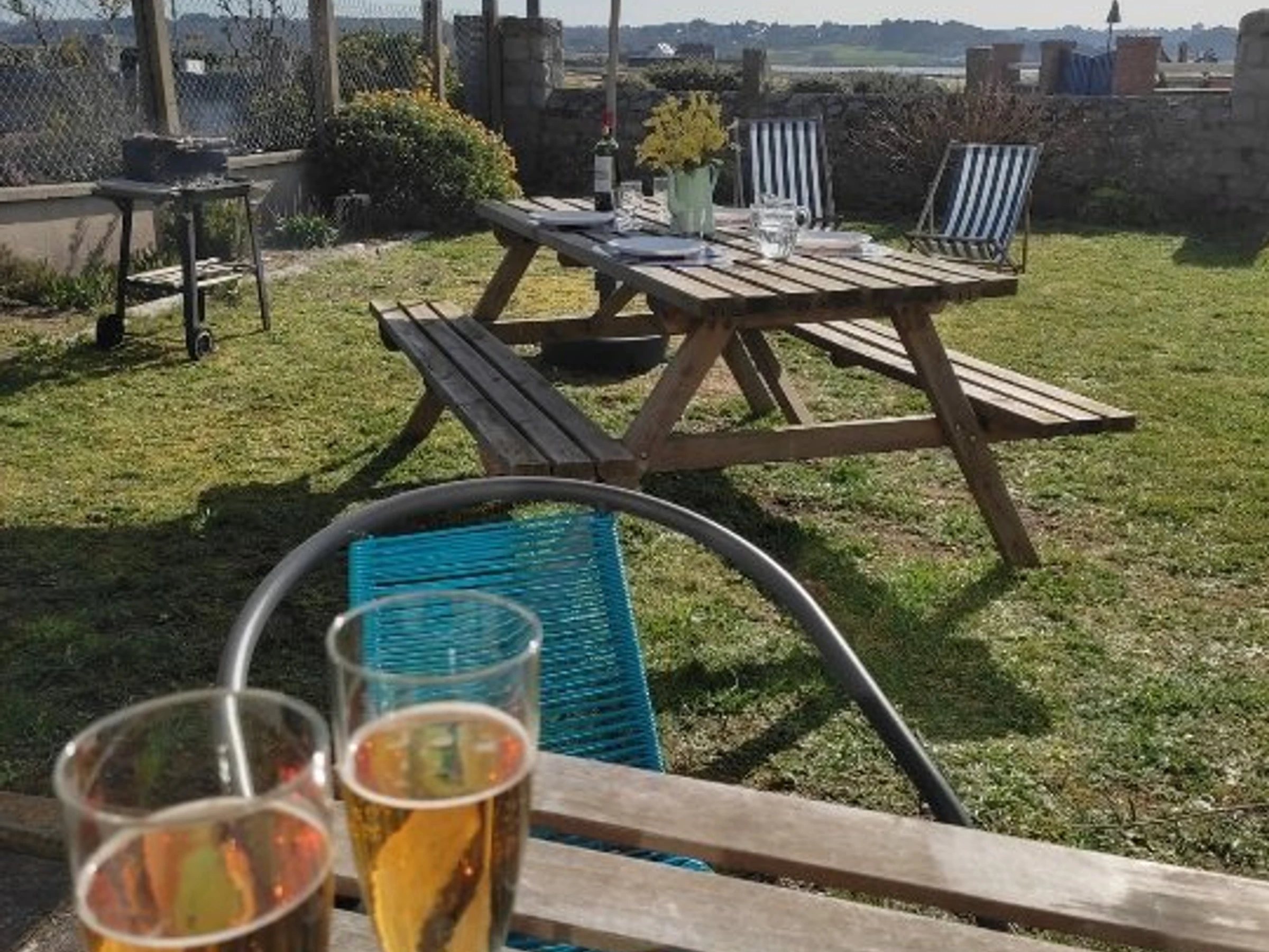 Les Mouettes house near the sea, beautiful sea view, garden and private parking. 80 m², furnished and equipped for 4 to 5 people. On the ground floor: entrance, fitted kitchen and dining area, living room, bathroom, separate WC. Upstairs: two bedrooms, bathroom with shower and WC. No pets, cleaning and disinfection included. Household linen optional.