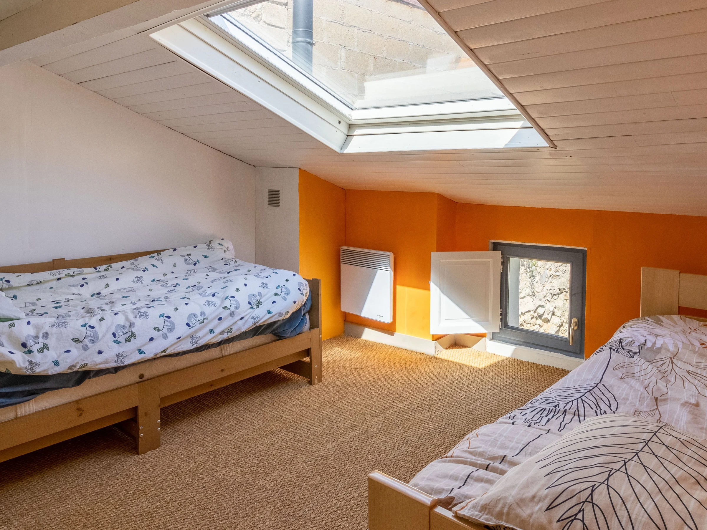 Take the Japanese staircase to the upper floor where you will find a small bedroom (8.50 m² at 1.80 m height and 16 m² on the floor) with a 160 x 200 cm bed with a memory foam mattress. The bedroom is bright thanks to its 3 windows. A second room upstairs has a large wardrobe and two 90 x 190 cm beds that can accommodate 2 children upon request.