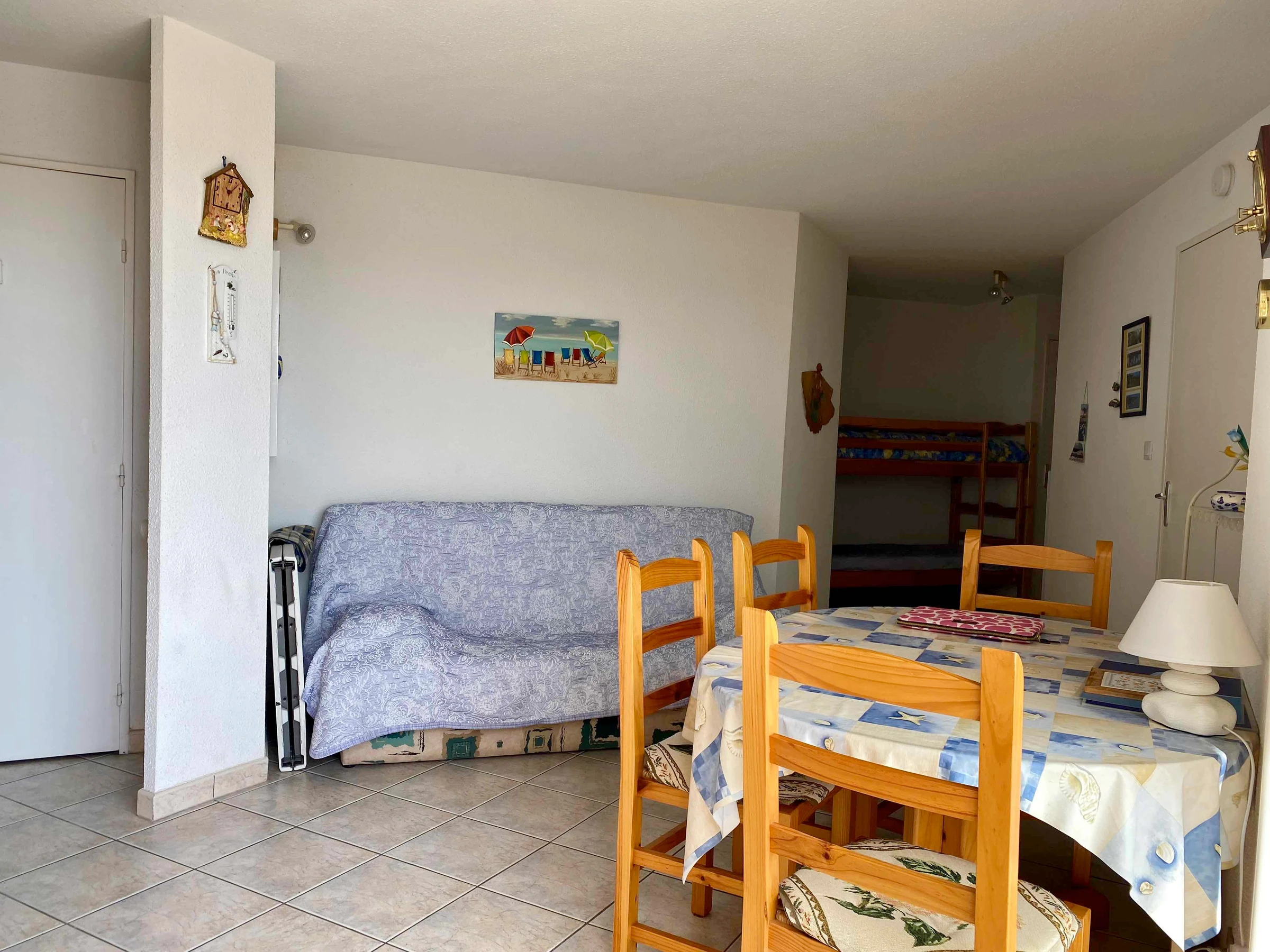 On the night side, the apartment has a warm bedroom with a double bed (140 cm) also opening onto the balcony, as well as a sleeping area in the entrance equipped with two bunk beds, ideal for children or friends . For your comfort, the apartment also has a modern bathroom and a separate toilet.