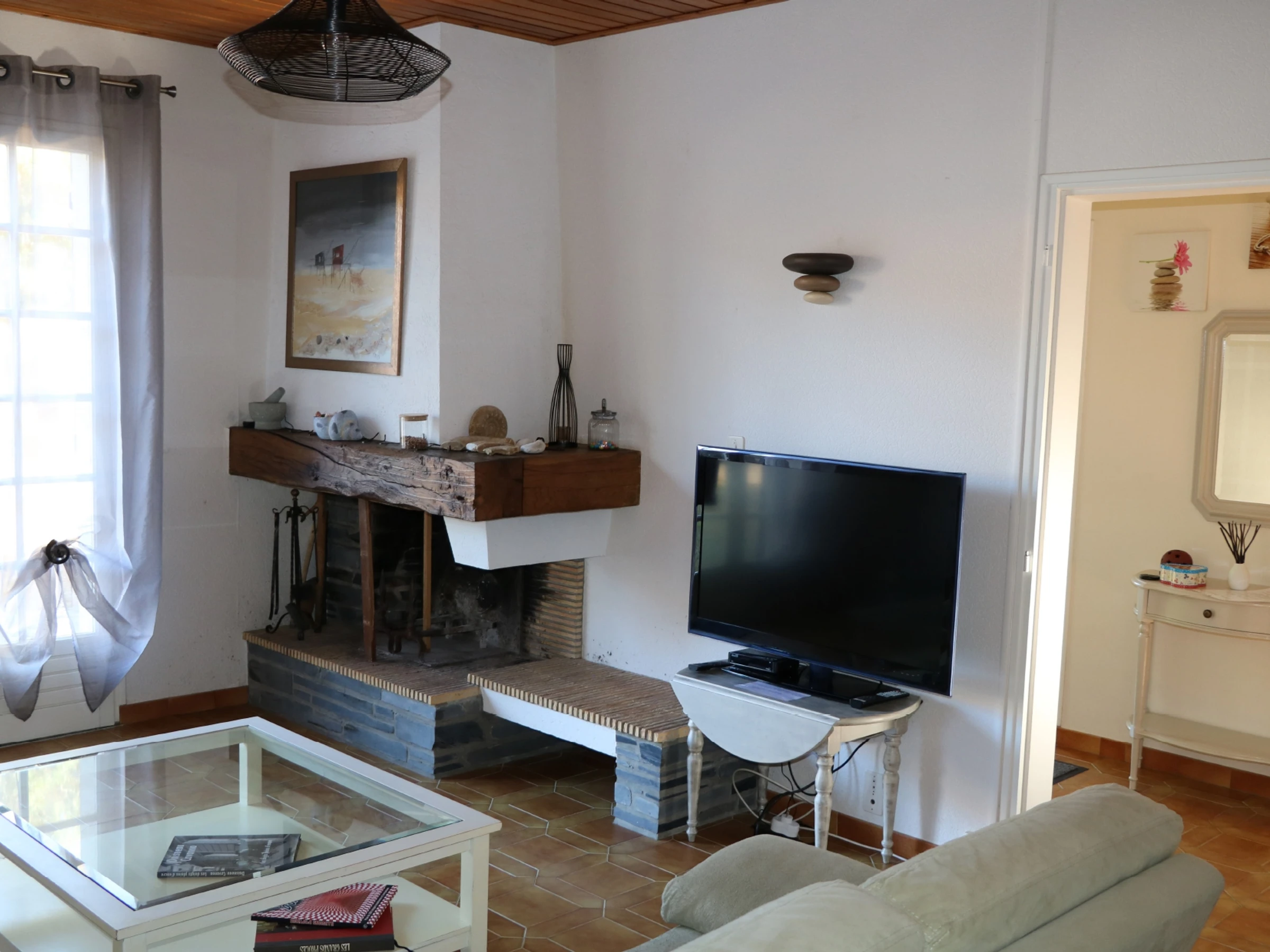 The kitchen is functional and well-equipped: fridge-freezer, ceramic hob, oven, microwave, extractor hood, dishwasher, coffee maker, kettle, toaster, pressure cooker, etc. You will also find a washing machine, vacuum cleaner, and all the necessary crockery and cutlery. A living room with a flat-screen TV completes the interior comfort. For babies: a travel cot and baby bath are available.