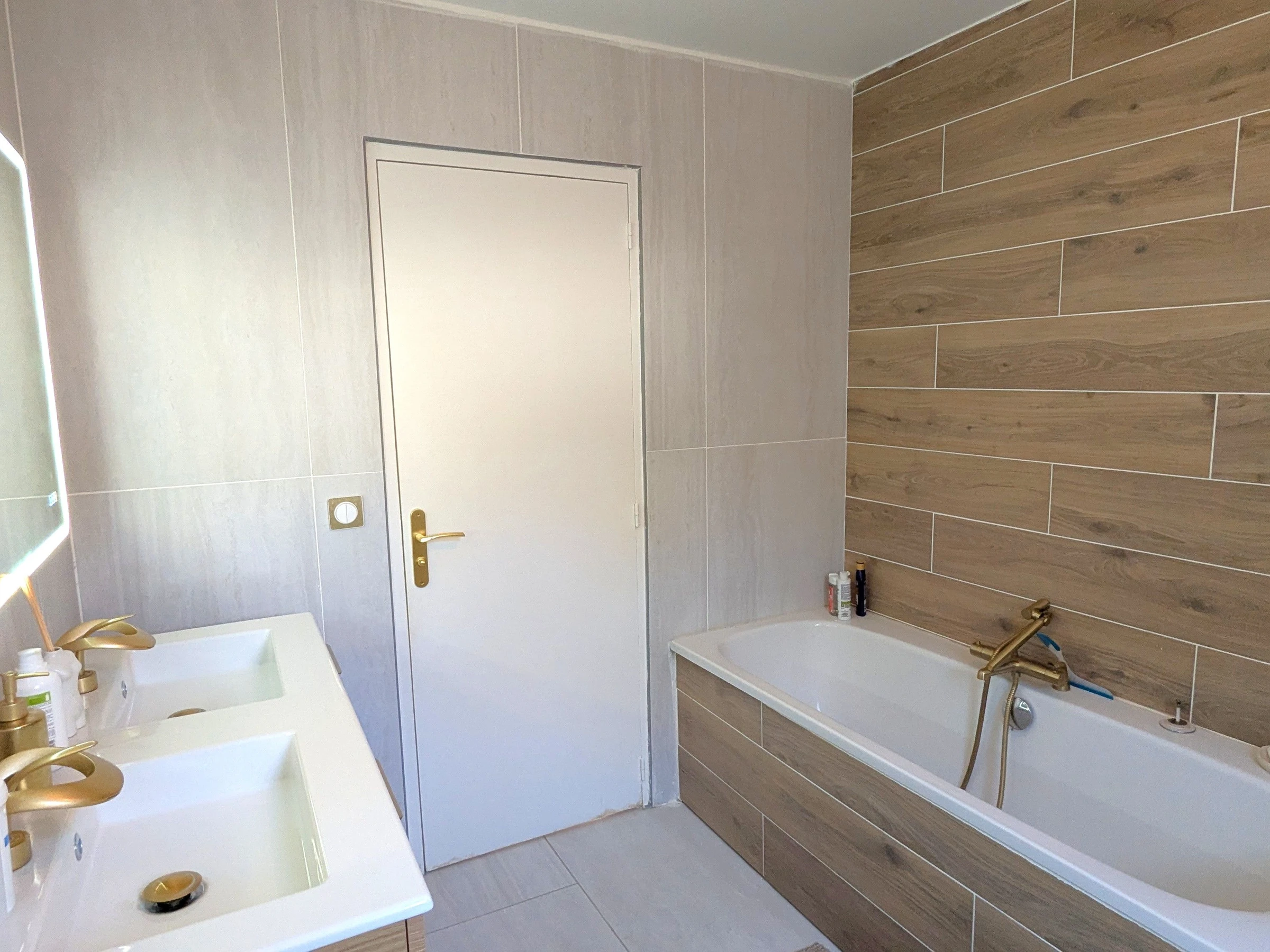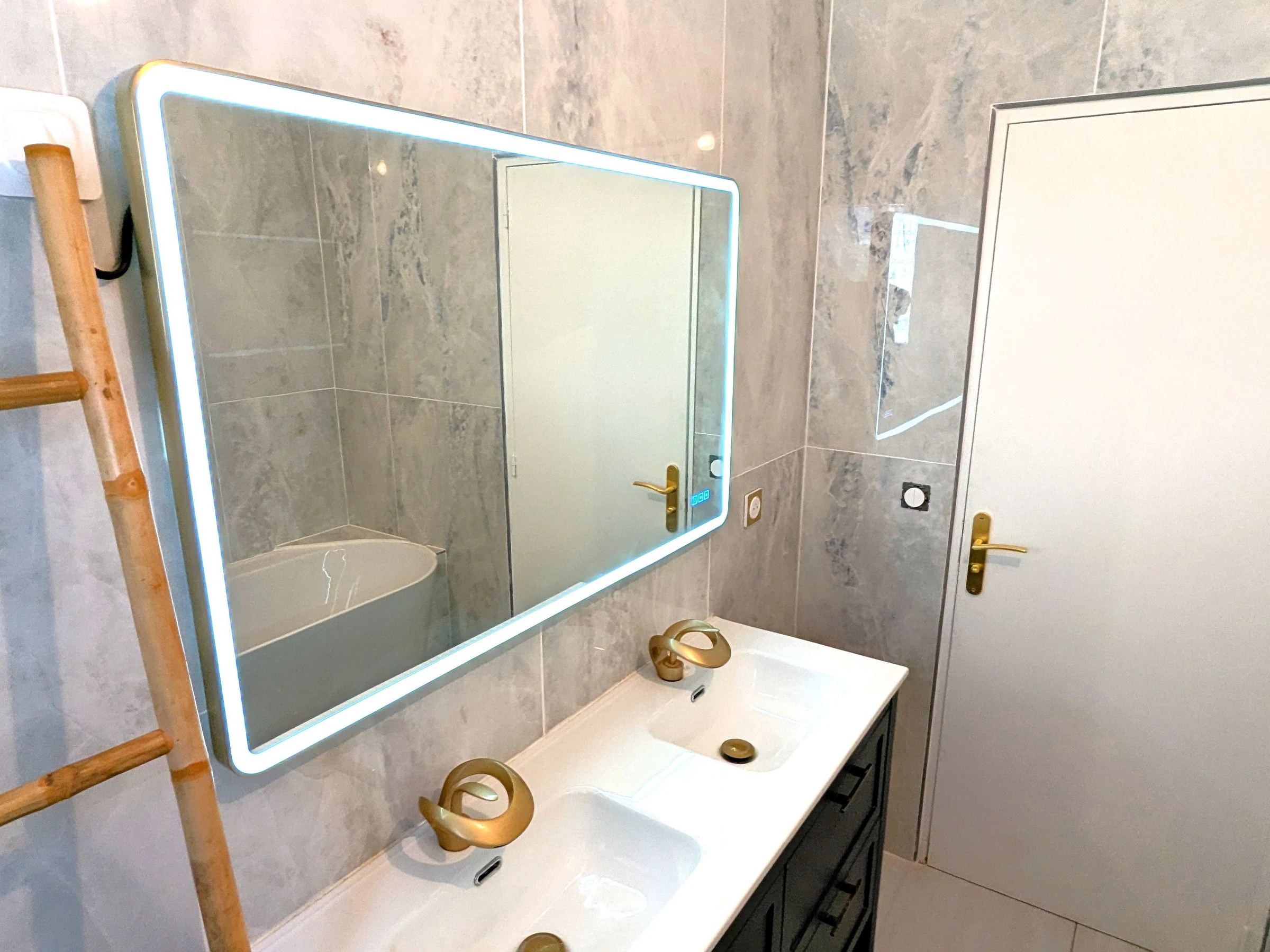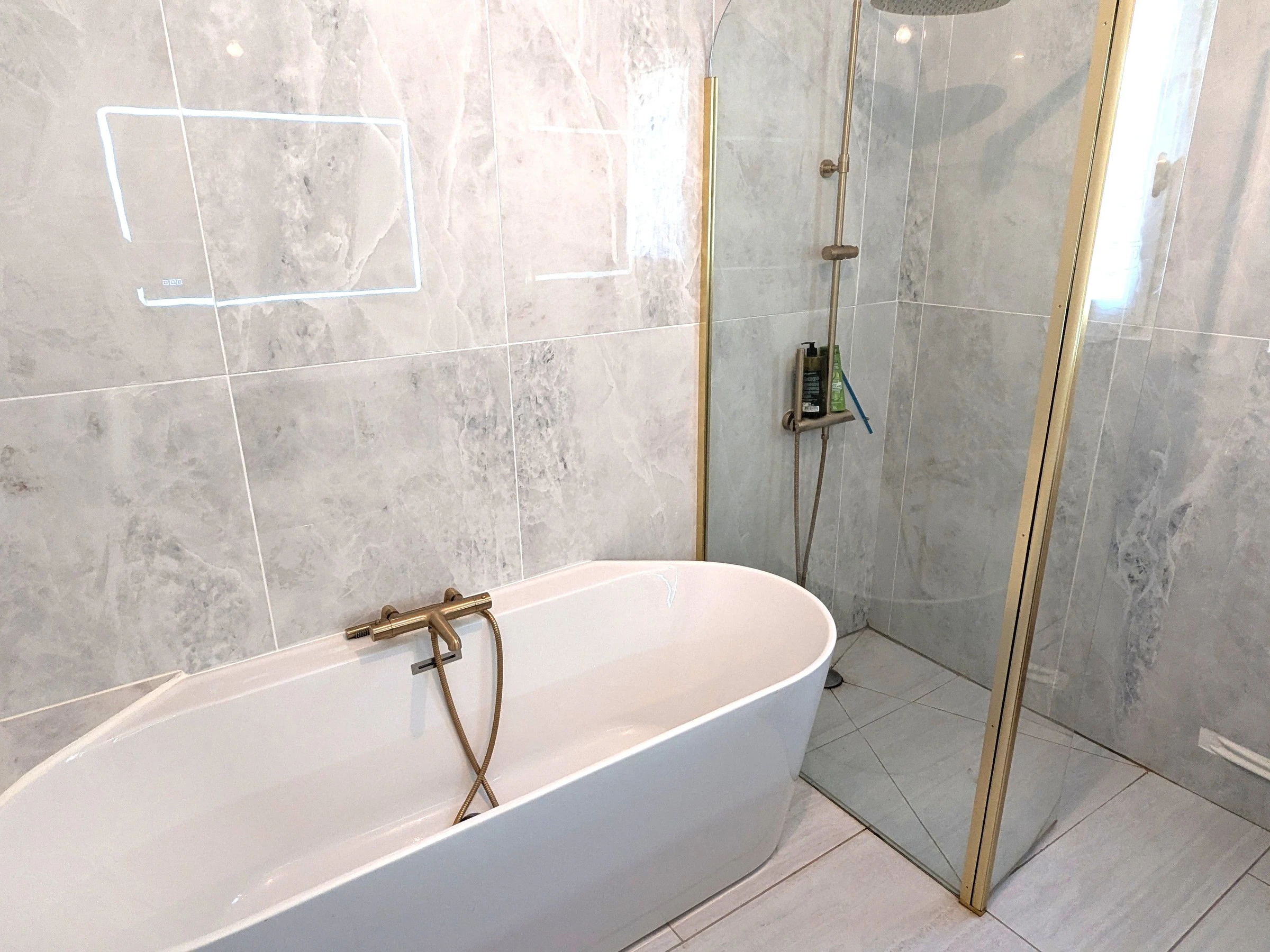On the ground floor, you will find two double bedrooms, each equipped with a king-size bed (180 cm) and a television. A first bathroom with a bathtub and shower completes this floor.