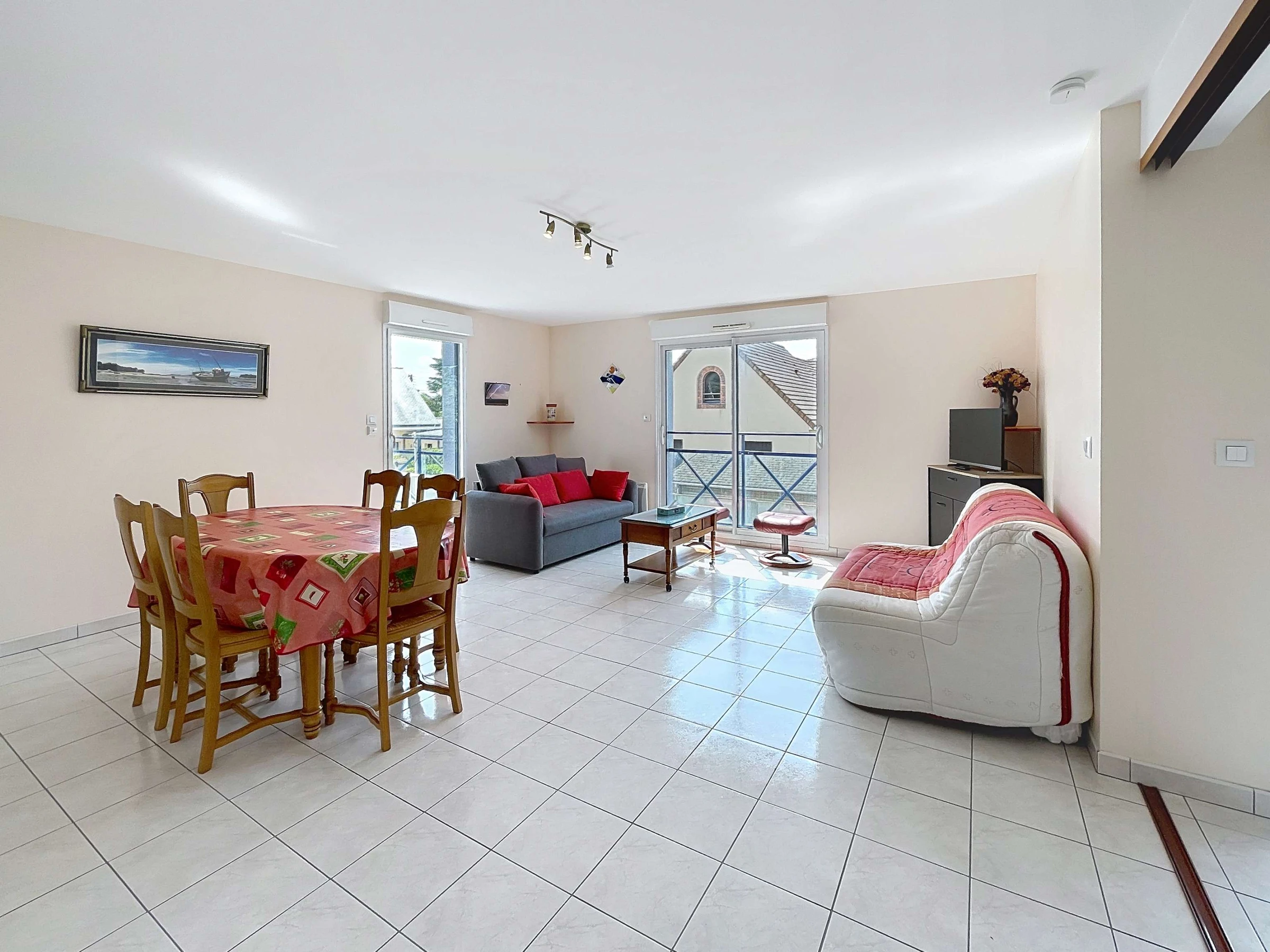 Located 250 meters from the beach and 1.5 kilometers from the shops of Jullouville, we welcome you to this apartment on the first floor of a recent residence. It comprises an entrance hall, a living room with a fitted kitchenette (oven, ceramic hob, refrigerator with freezer compartment, washing machine, microwave), two sofa beds, a television, a sleeping area with a 140cm double bed, a bathroom (shower), and two small balconies.