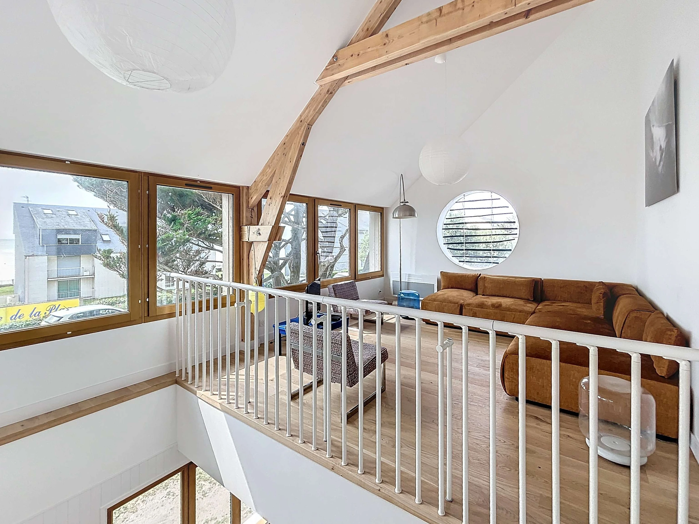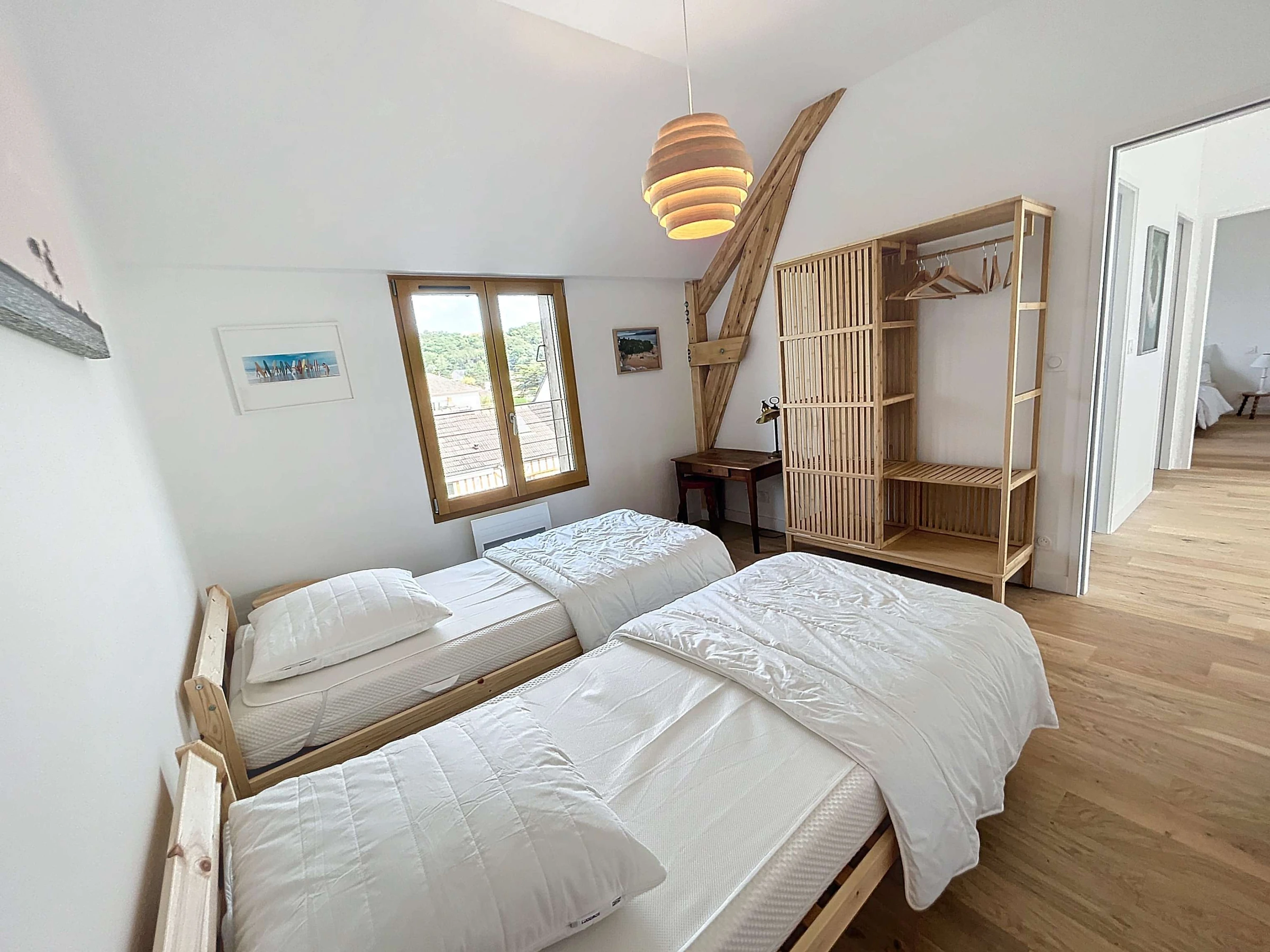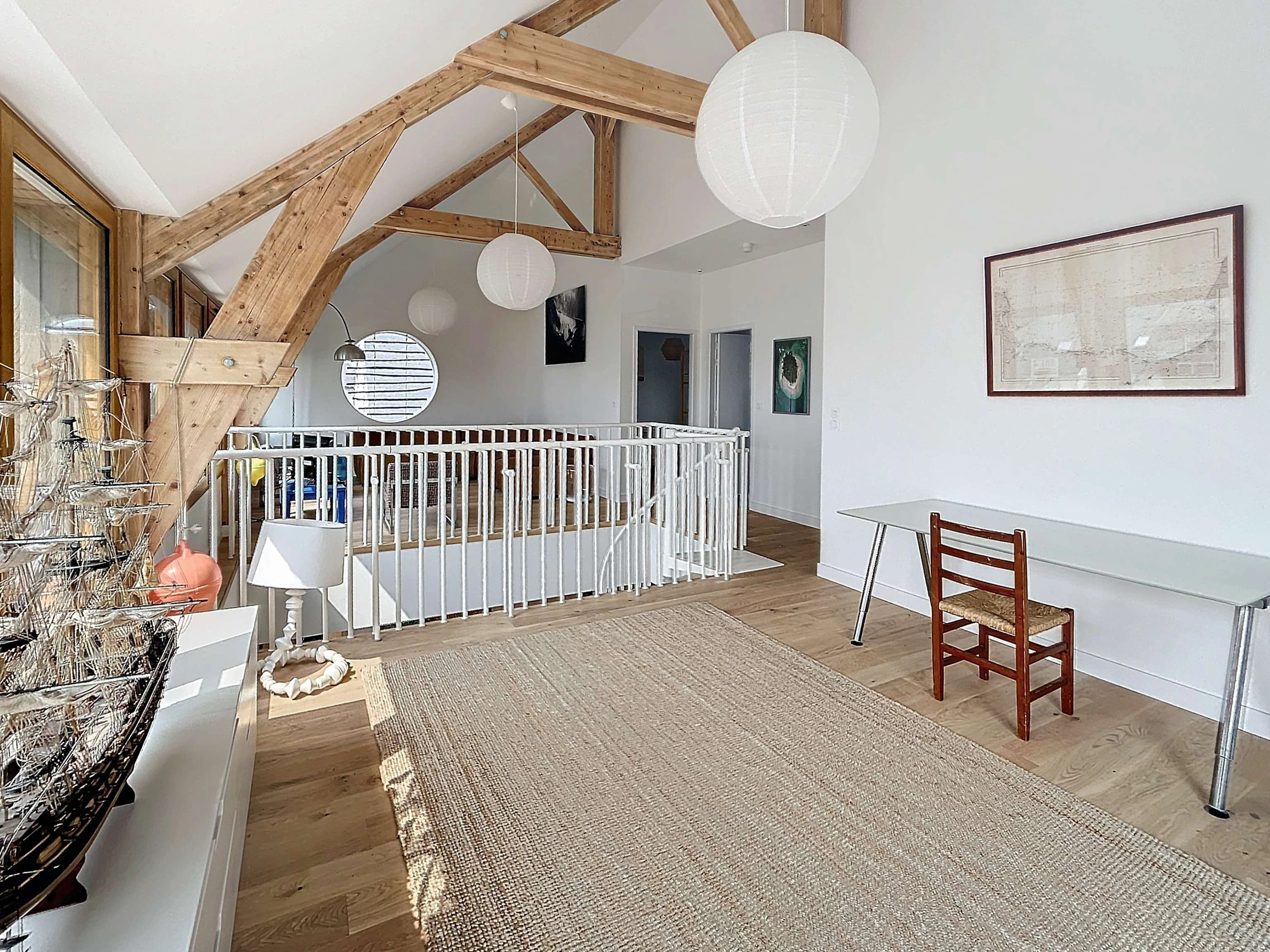 Upstairs a large hallway with a TV corner, an office corner, a bedroom with two single beds and another bedroom with a 140 bed, a second bathroom and separate toilet.