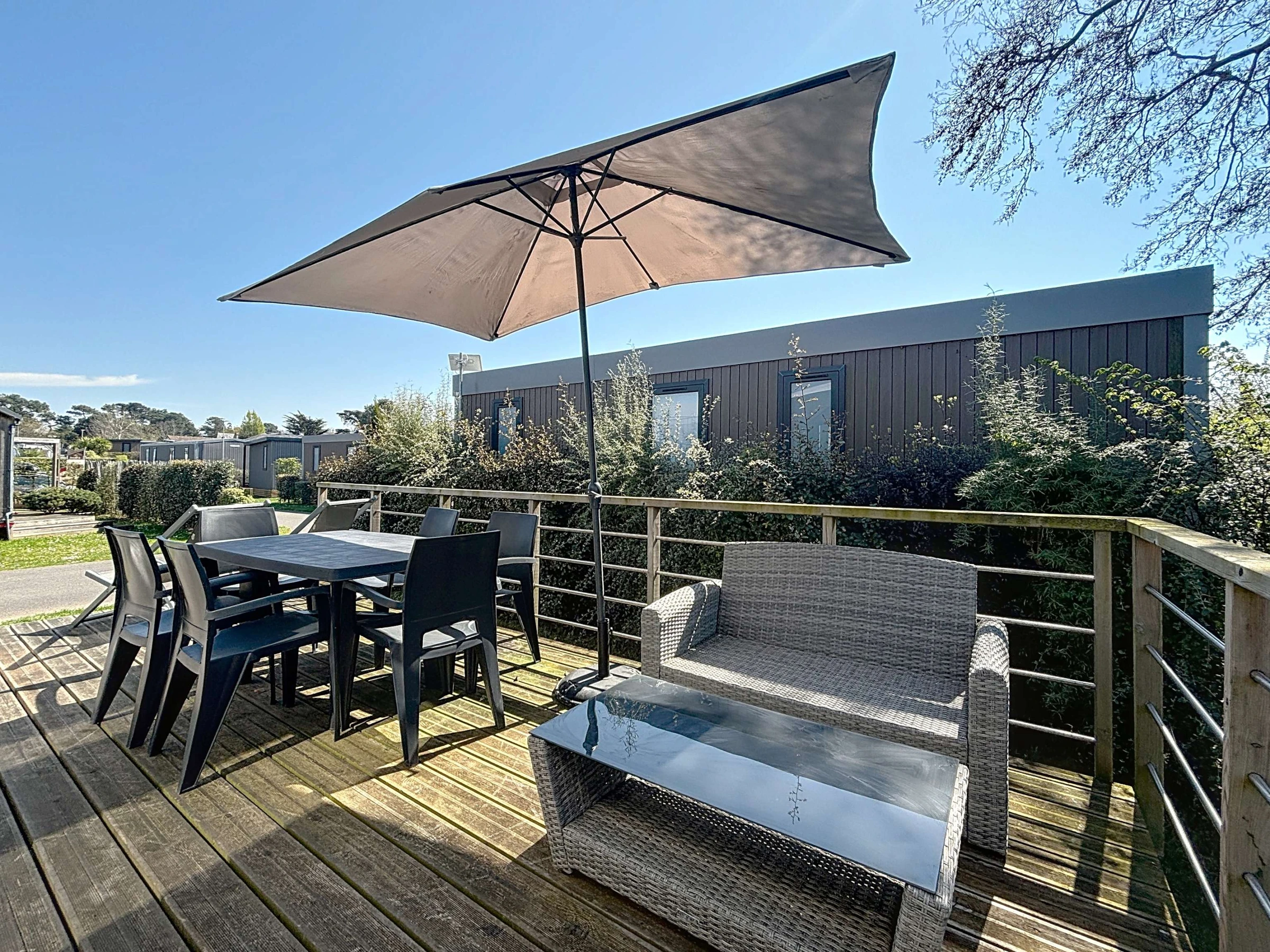 Let yourself be seduced by this 2 bedroom mobile home, great comfort, 4 people with a surface area of 31m² composed of a living room with a fitted and equipped kitchen area, a lounge area with TV and sofa, a bedroom equipped with a double bed (160x200), a second bedroom with two single beds (90), a bathroom and separate toilet. You can enjoy the wooden terrace equipped with indoor/outdoor kitchen. A parking space is available on the plot, only for a single vehicle.