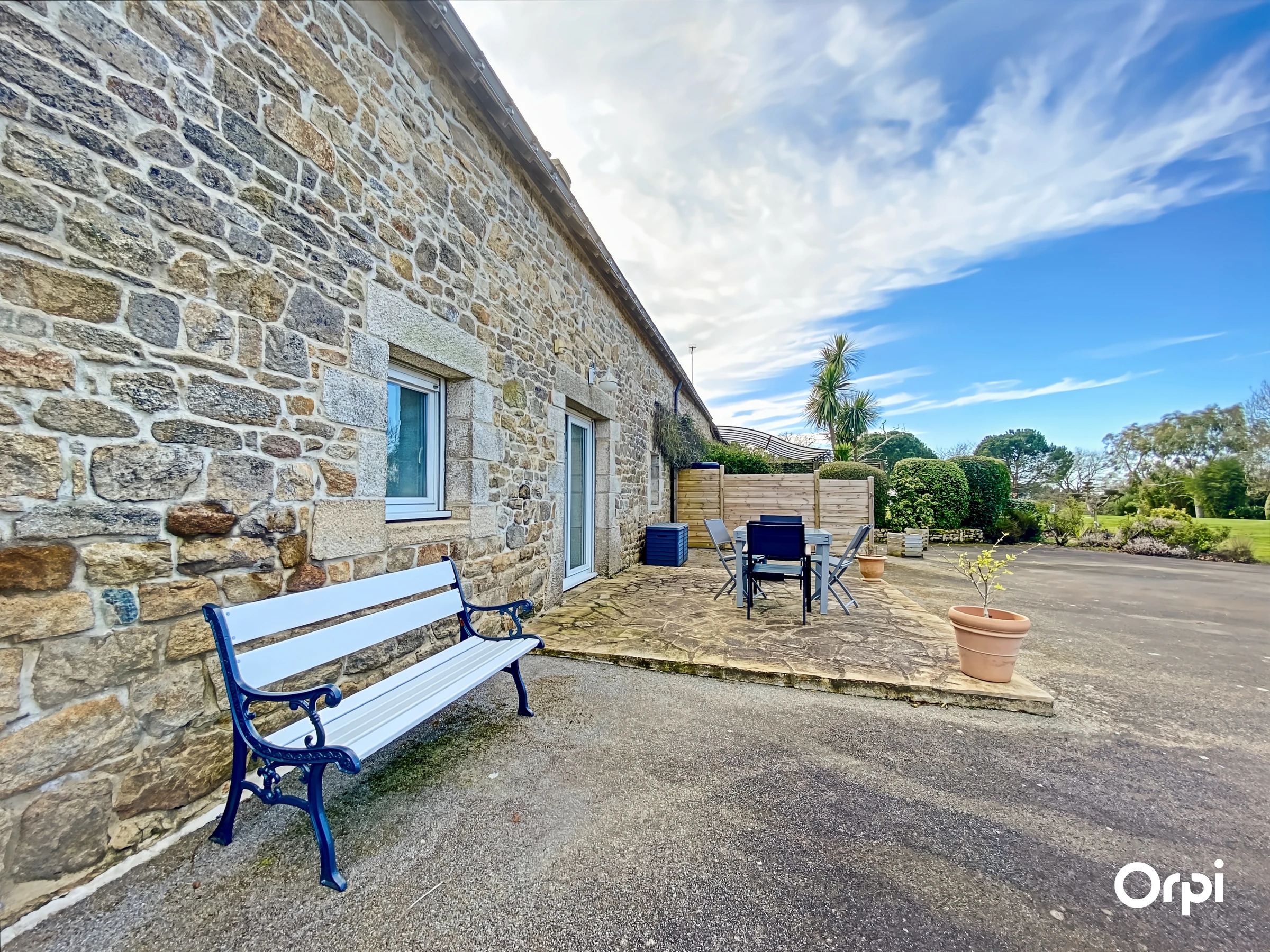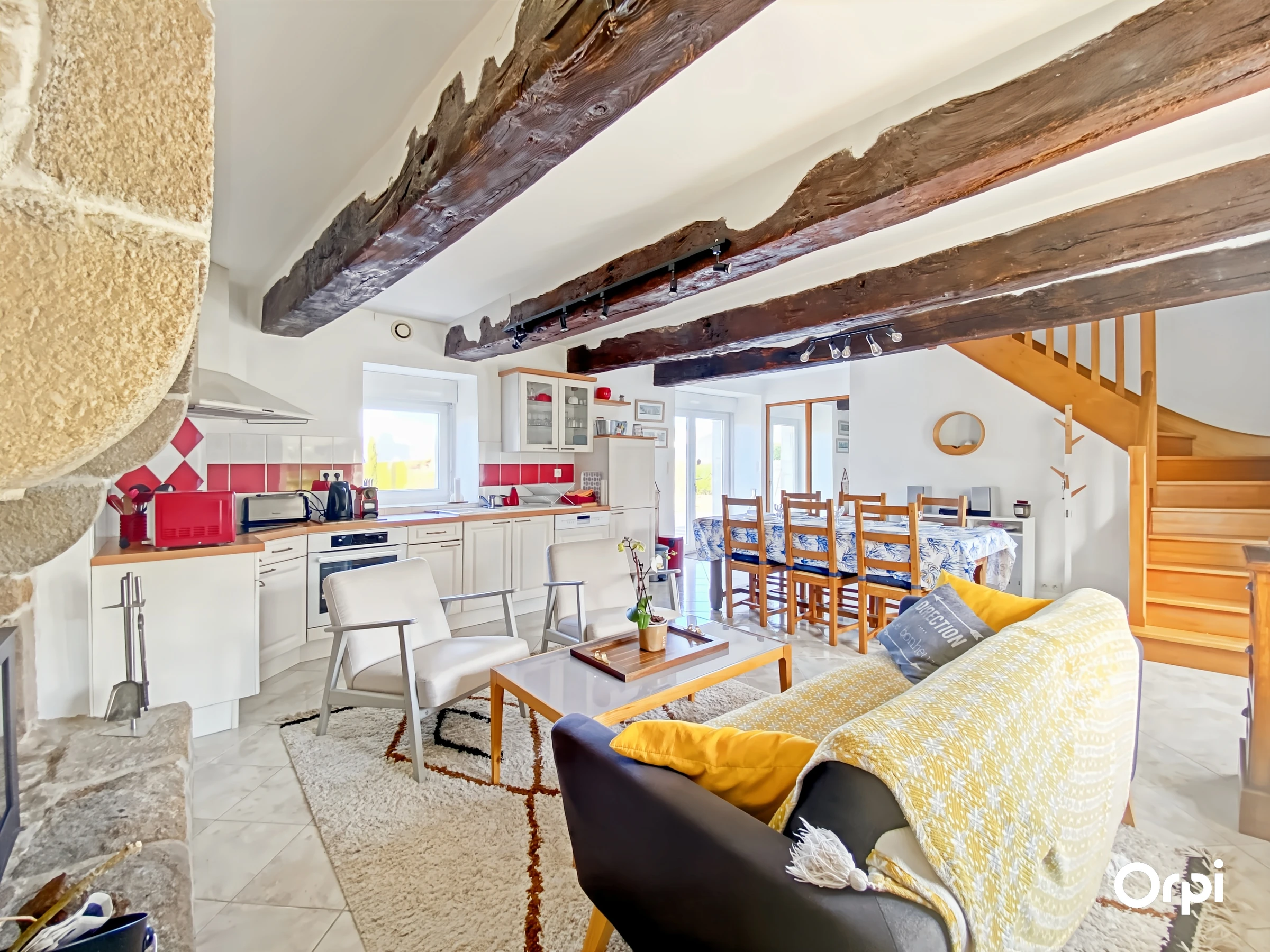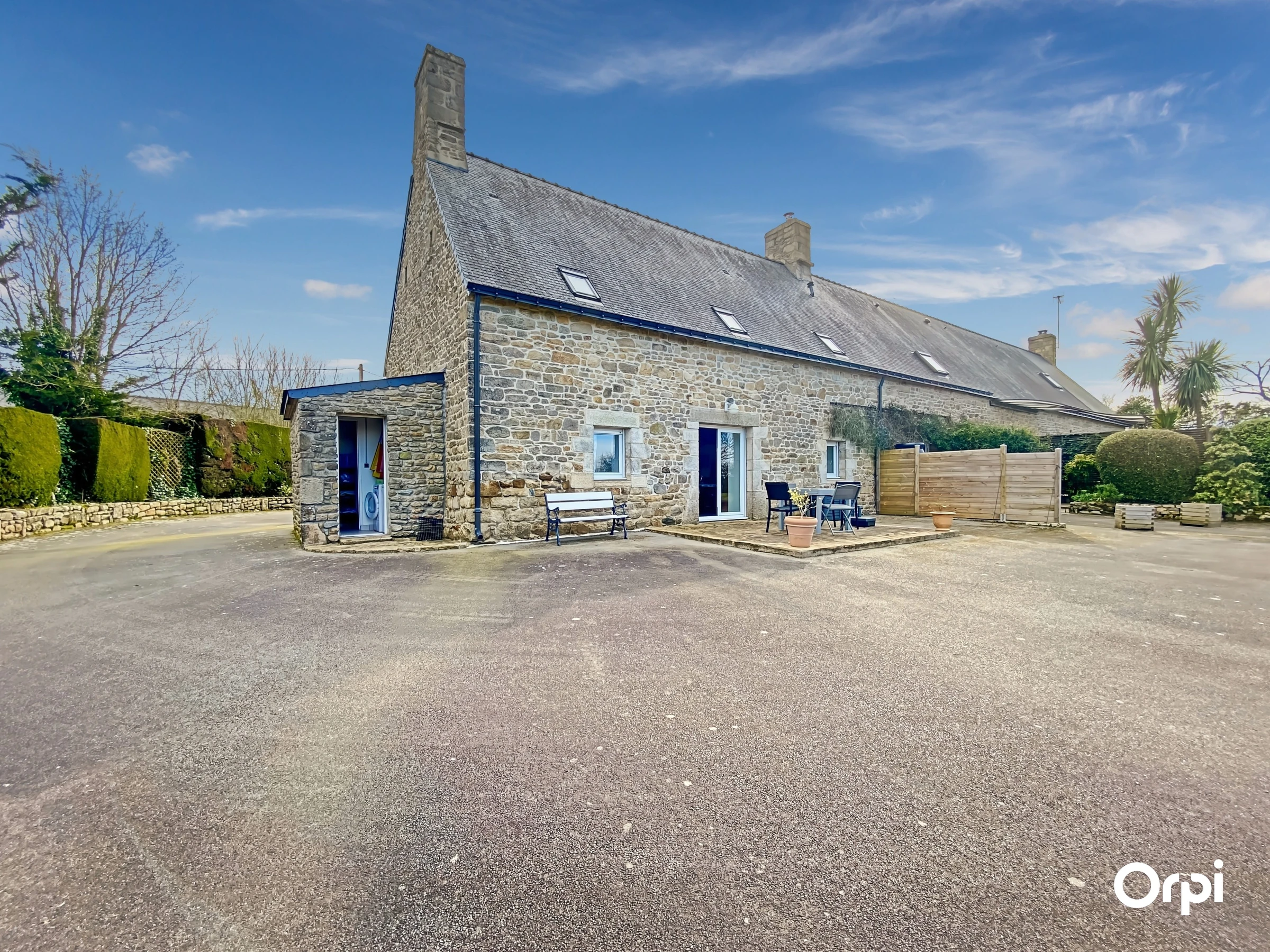 The right part has a fitted and equipped kitchen open to the living room with stove opening onto the terrace, a bedroom (140) with shower room. The upper floor serves 2 bedrooms (2*90) each with a private shower room or bathroom. A parking area is available.