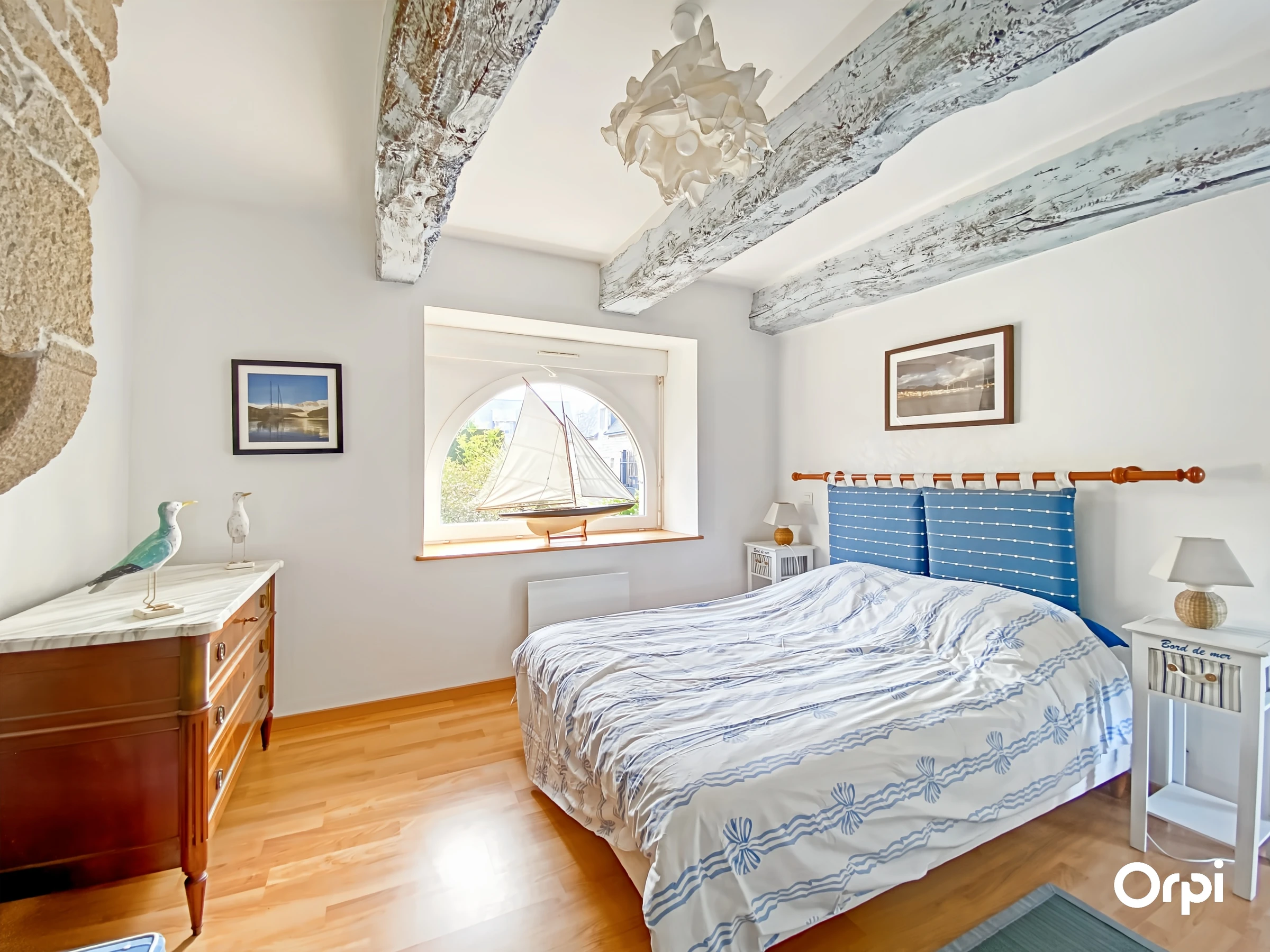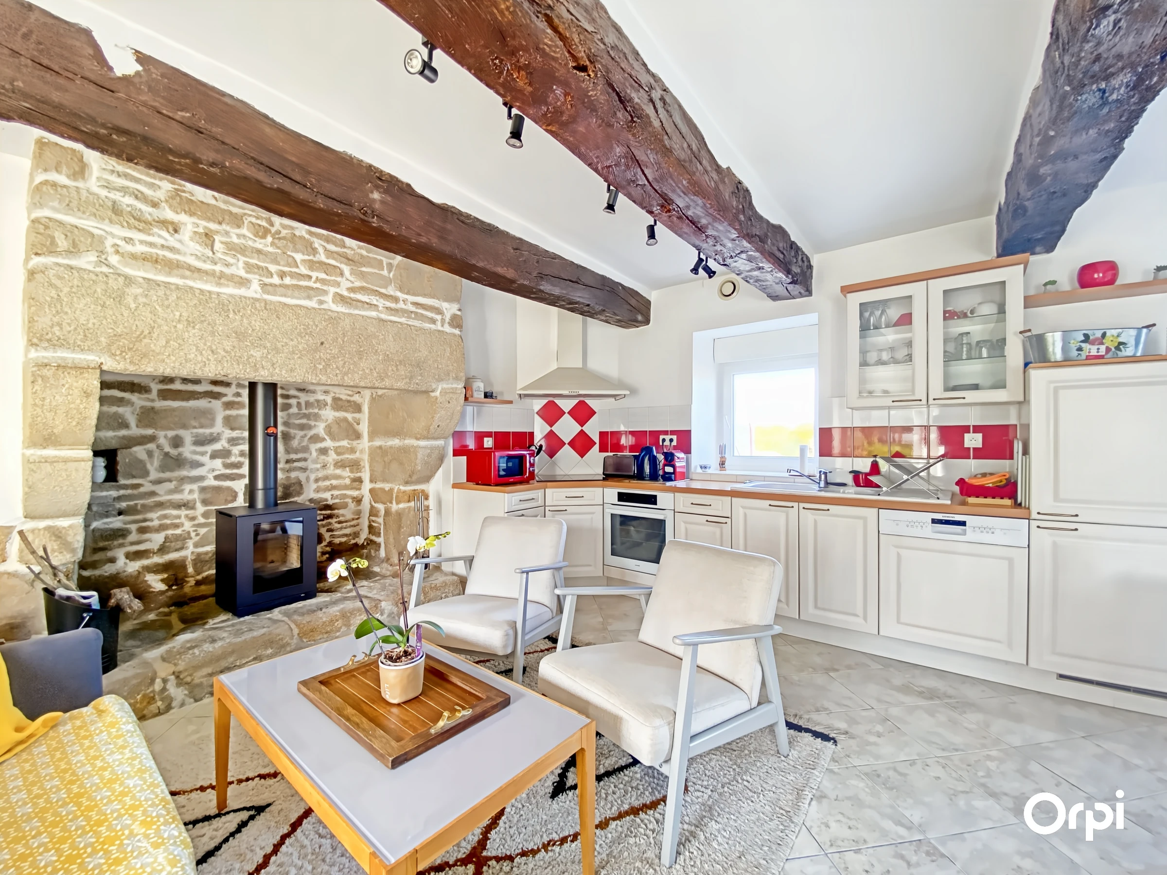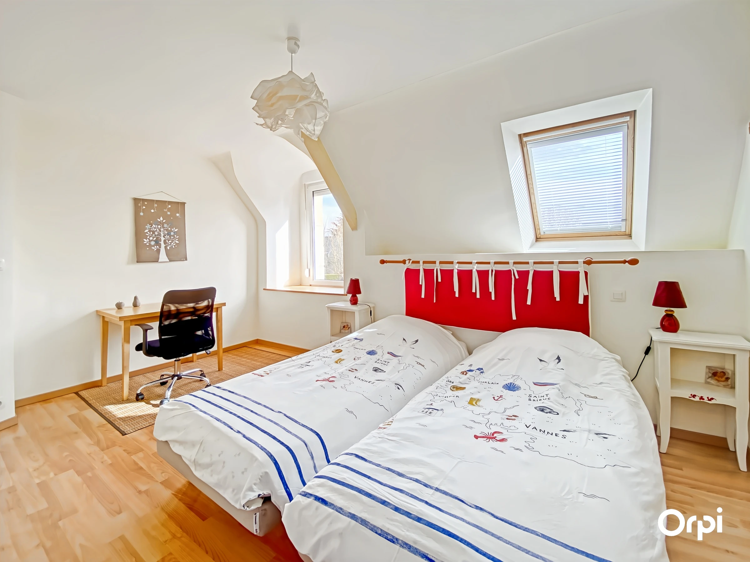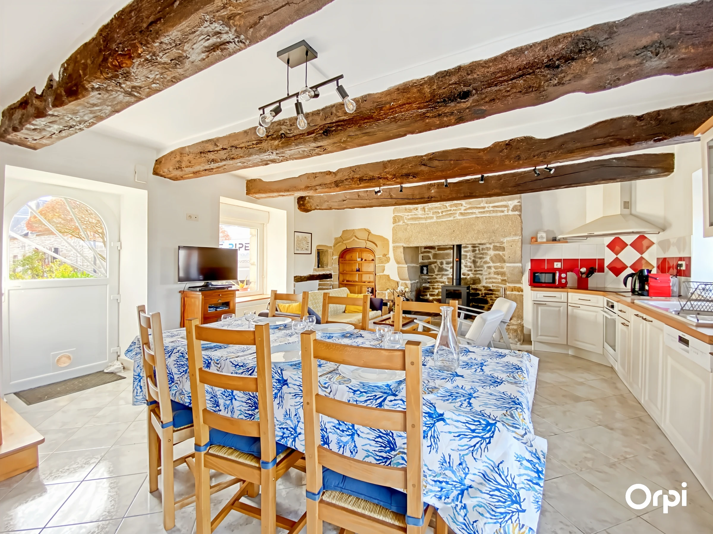 The right part has a fitted and equipped kitchen open to the living room with stove opening onto the terrace, a bedroom (140) with shower room. The upper floor serves 2 bedrooms (2*90) each with a private shower room or bathroom. A parking area is available.