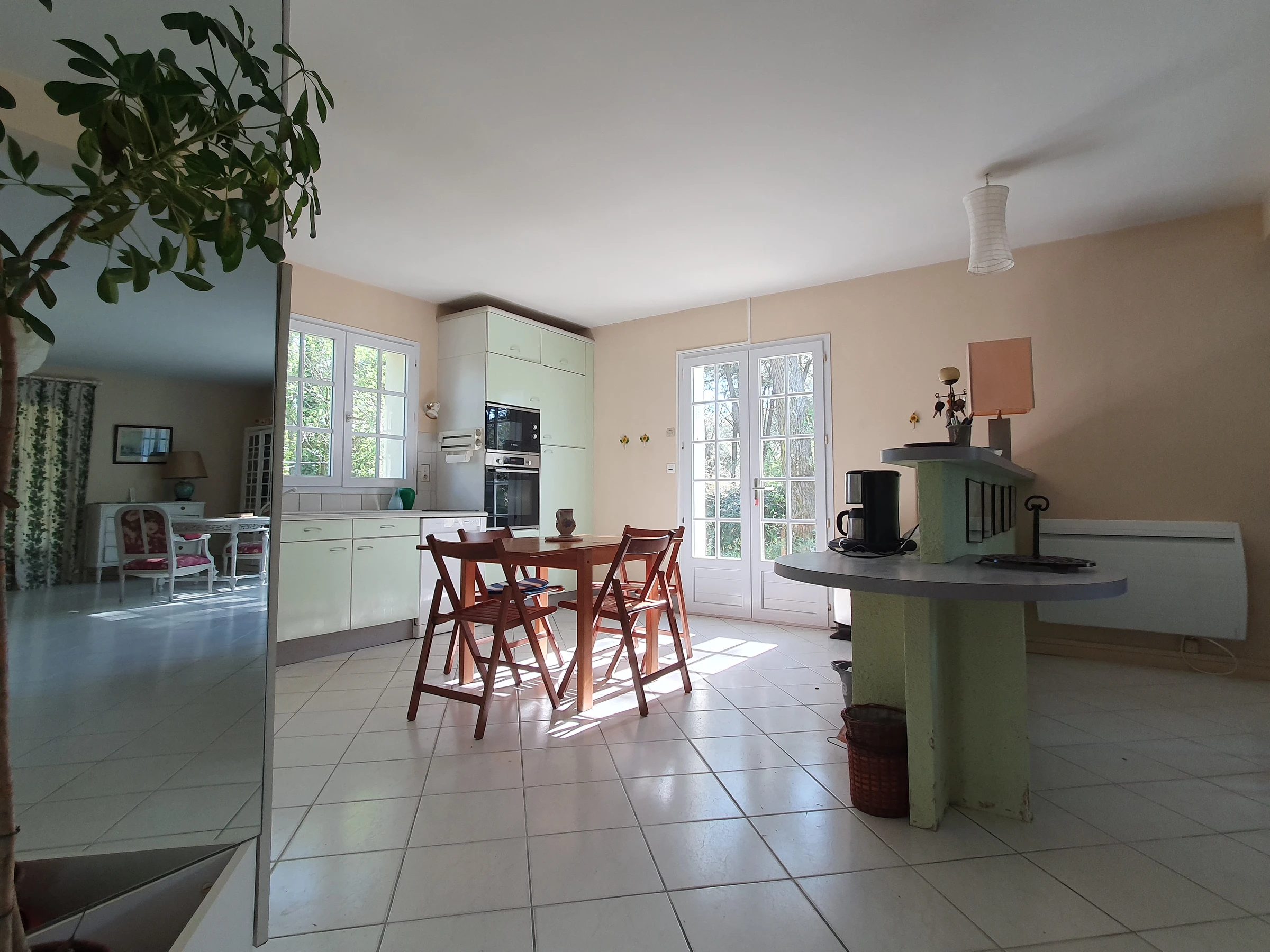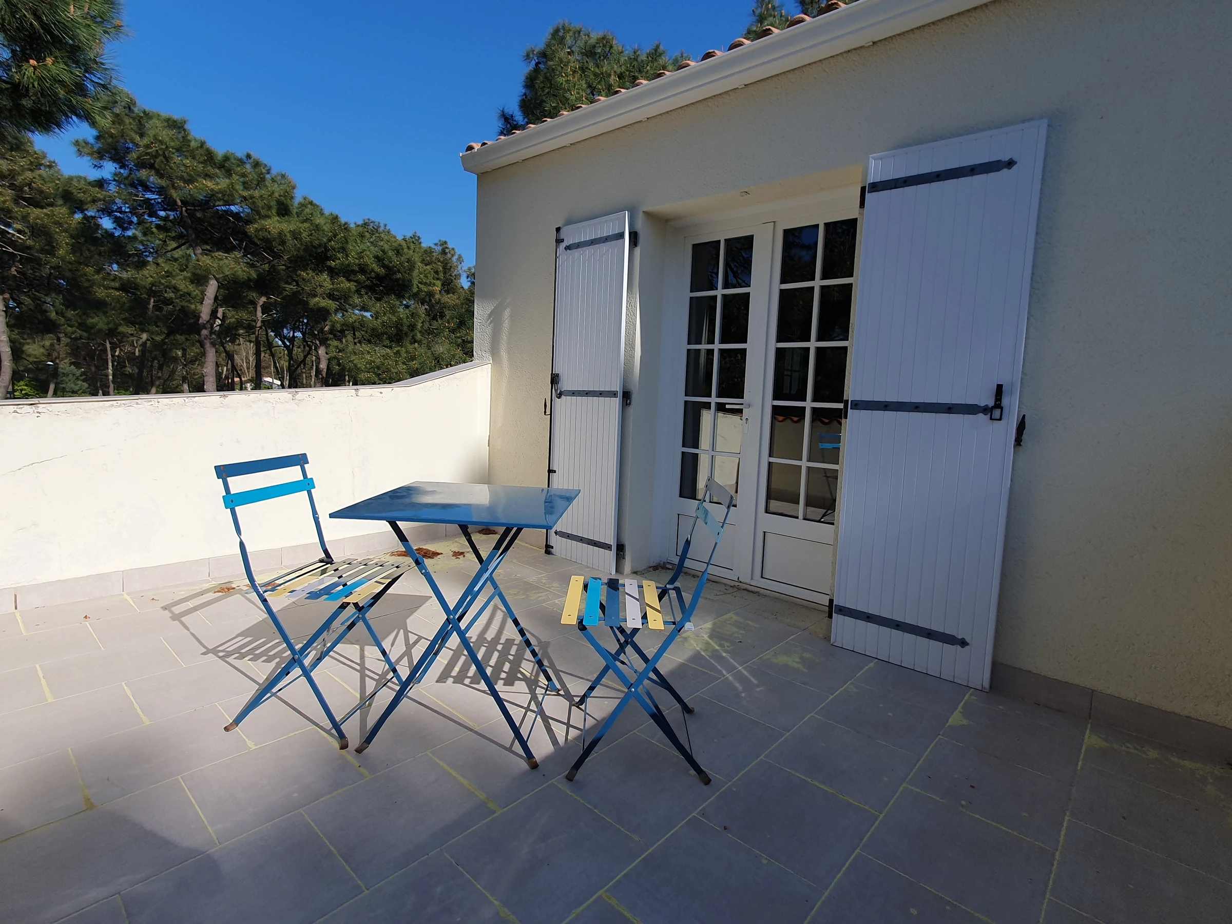 Upstairs: a shower stall on the landing, a bedroom under the eaves with four single beds (90 cm), a second bedroom with a 140 cm bed opening onto a balcony with a lovely view of the pine forest, a third bedroom with a 90 cm bed and a sink, and a toilet. A garage with a freezer, small fridge, and a washing machine. A wooded garden with an awning terrace, garden furniture, barbecue, and parking space. Housekeeping is provided by the tenant. Linens not provided; rental is possible through our partner; contact us. Heating is extra from October 1st to May 31st, depending on the meter reading.