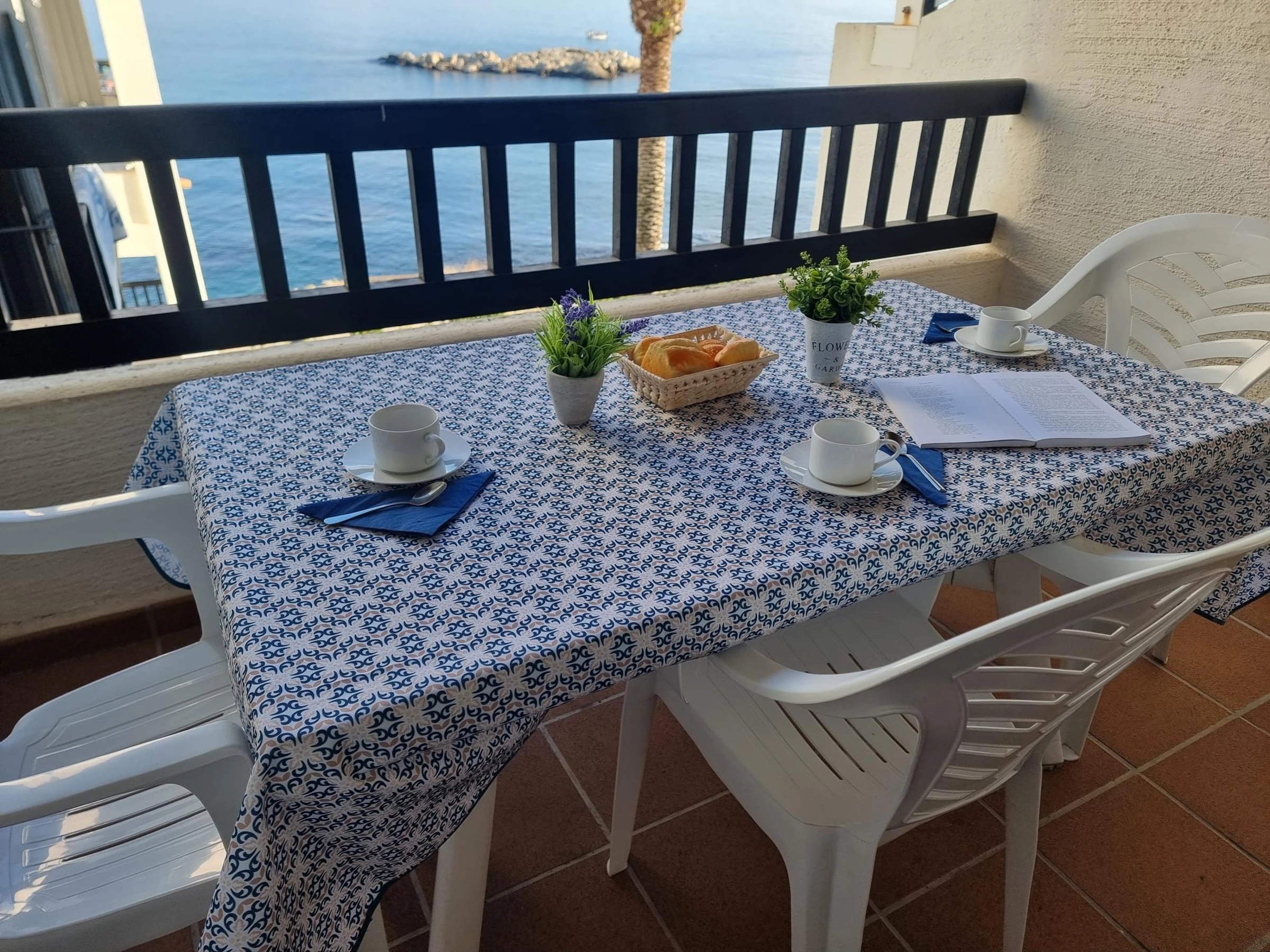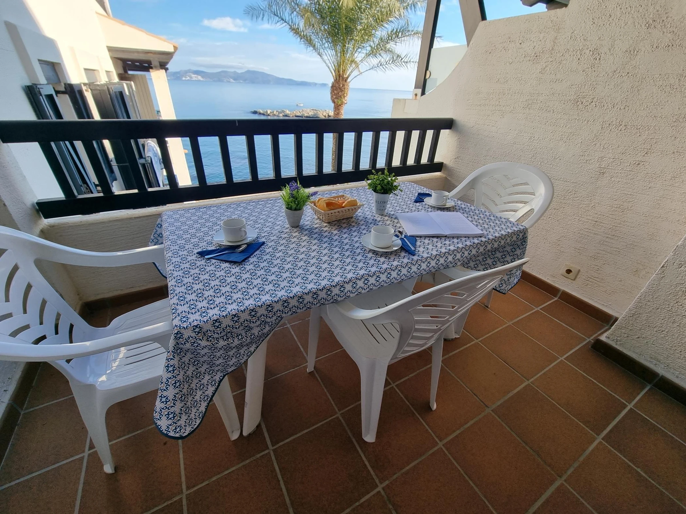 It has two bedrooms, a full bathroom, and a kitchen-dining room. Its private terrace with sea views is perfect for enjoying magical sunsets. Plus, the communal pool is a great place to cool off on warm days.