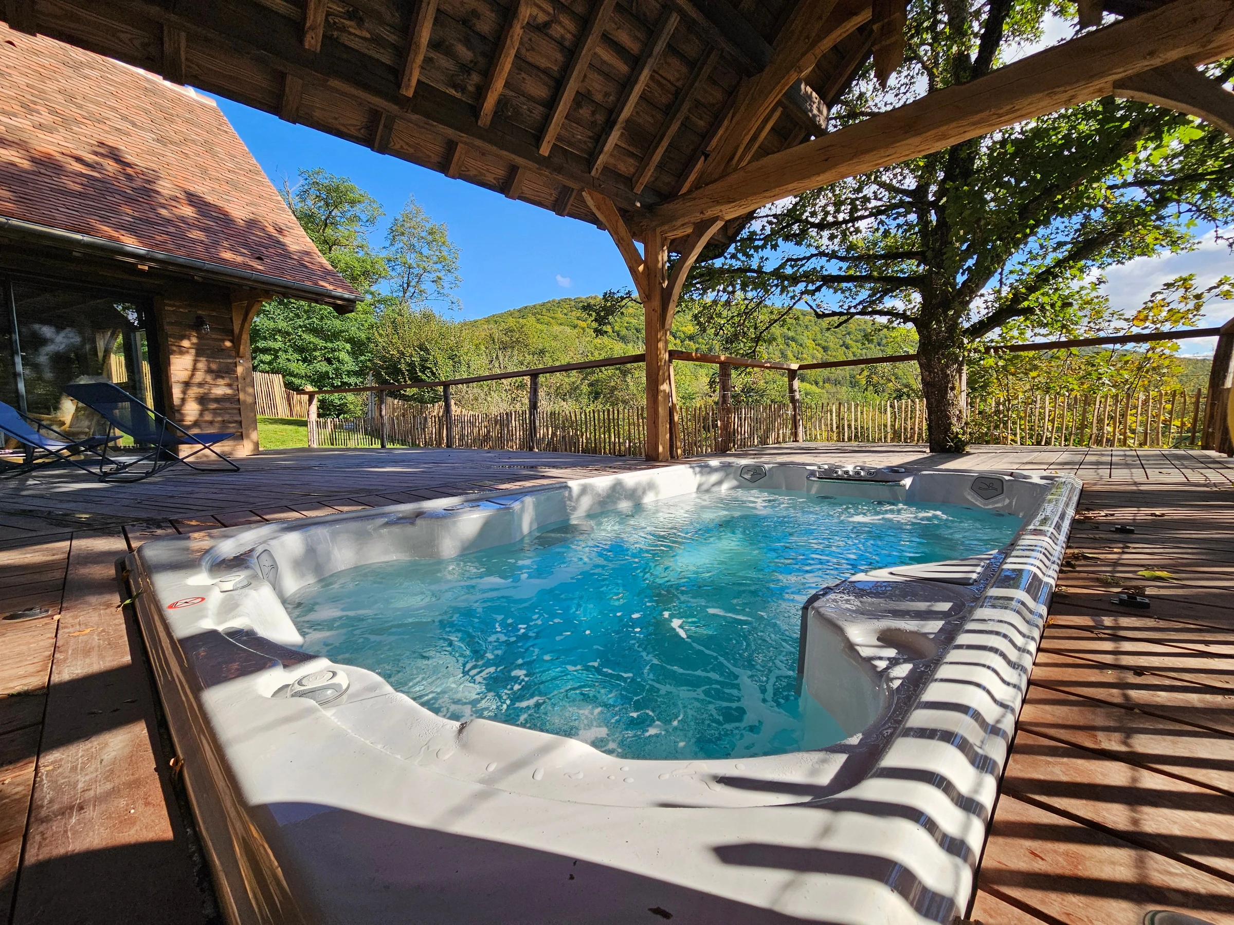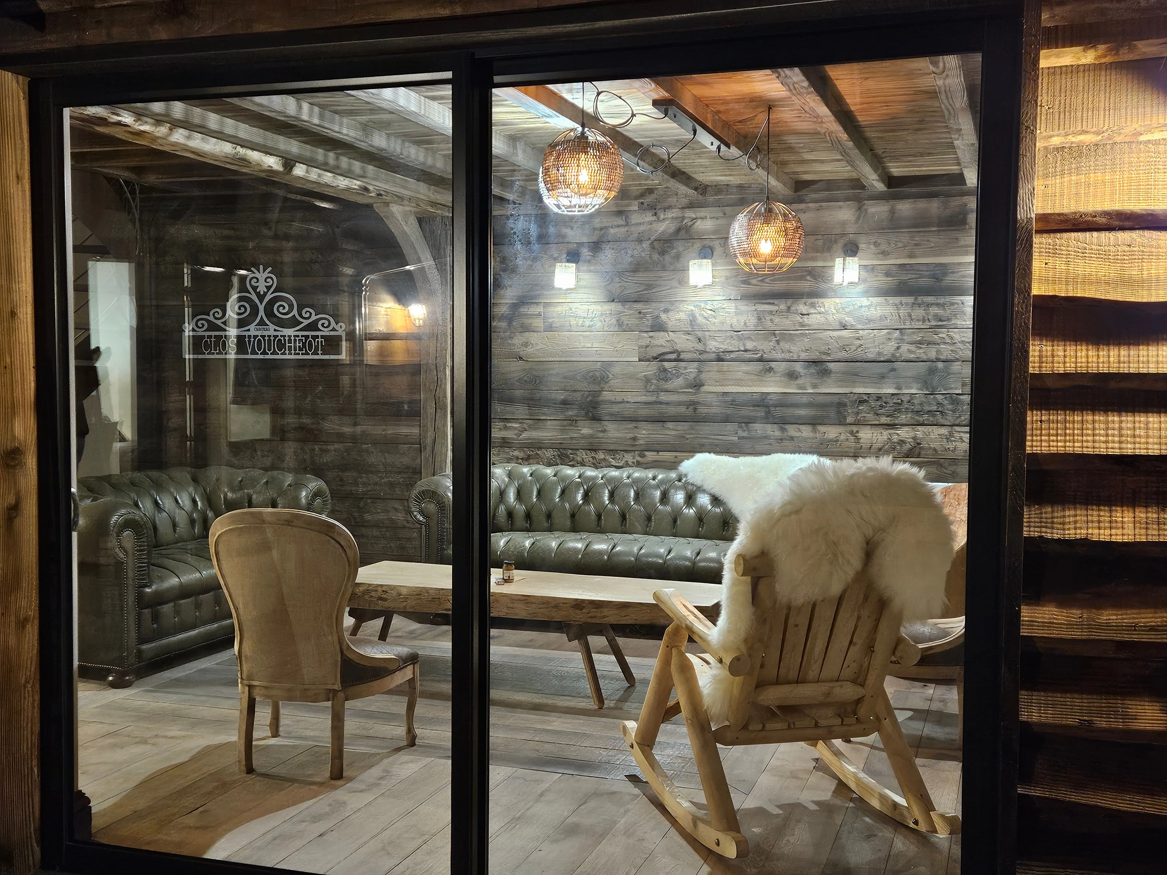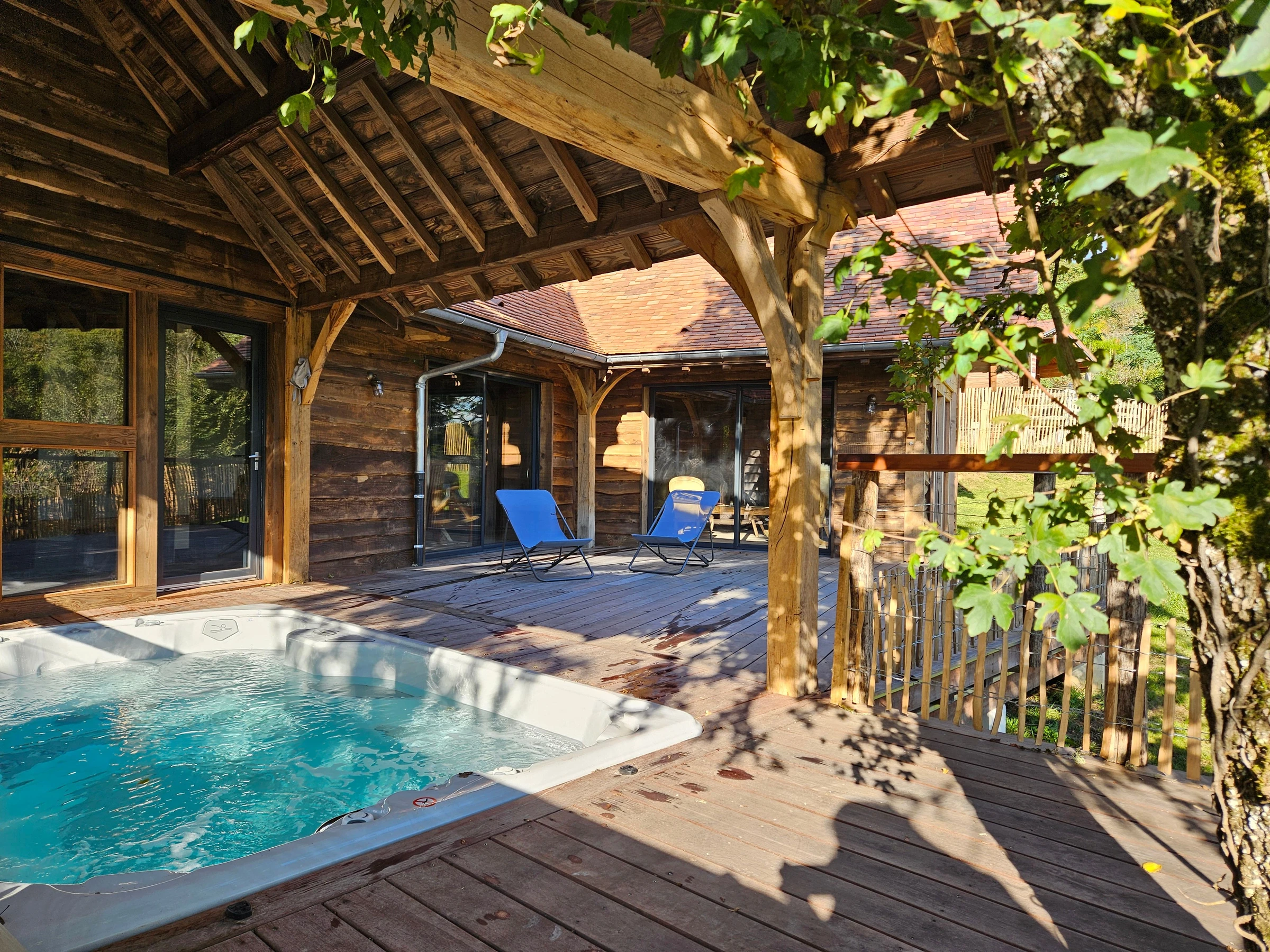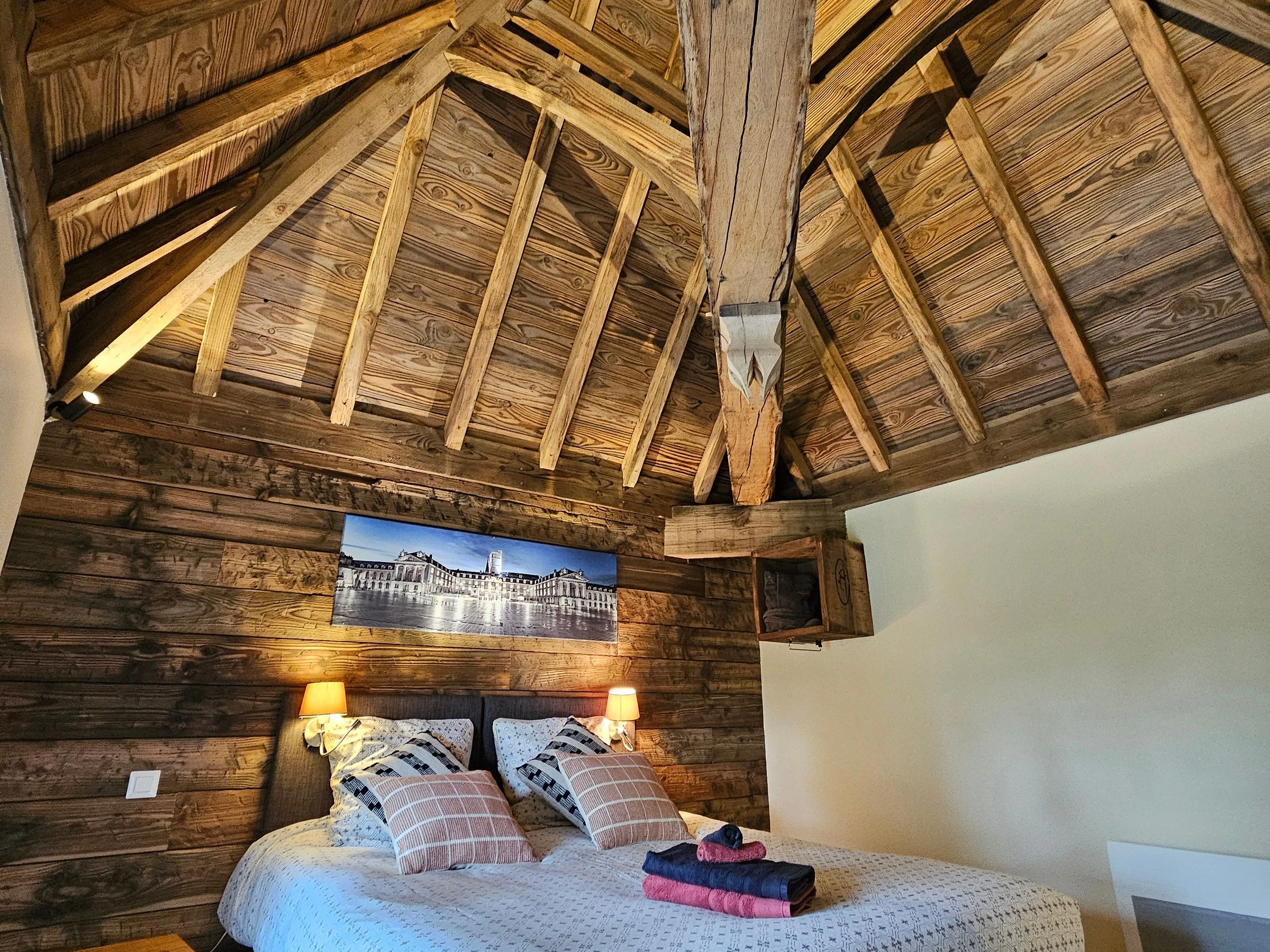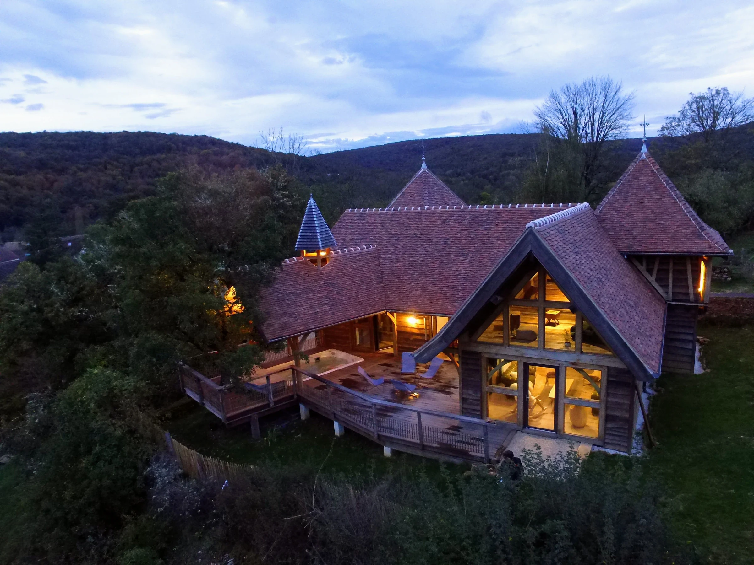 Loosely inspired by the Château du Clos Vougeot, this impressive 100% wooden cottage, with large swimming spa, was entirely built by Arnaud, a carpenter by trade, and Hélène, his wife. They will welcome you in a luxury accommodation with refined decoration and imposing exposed beams.