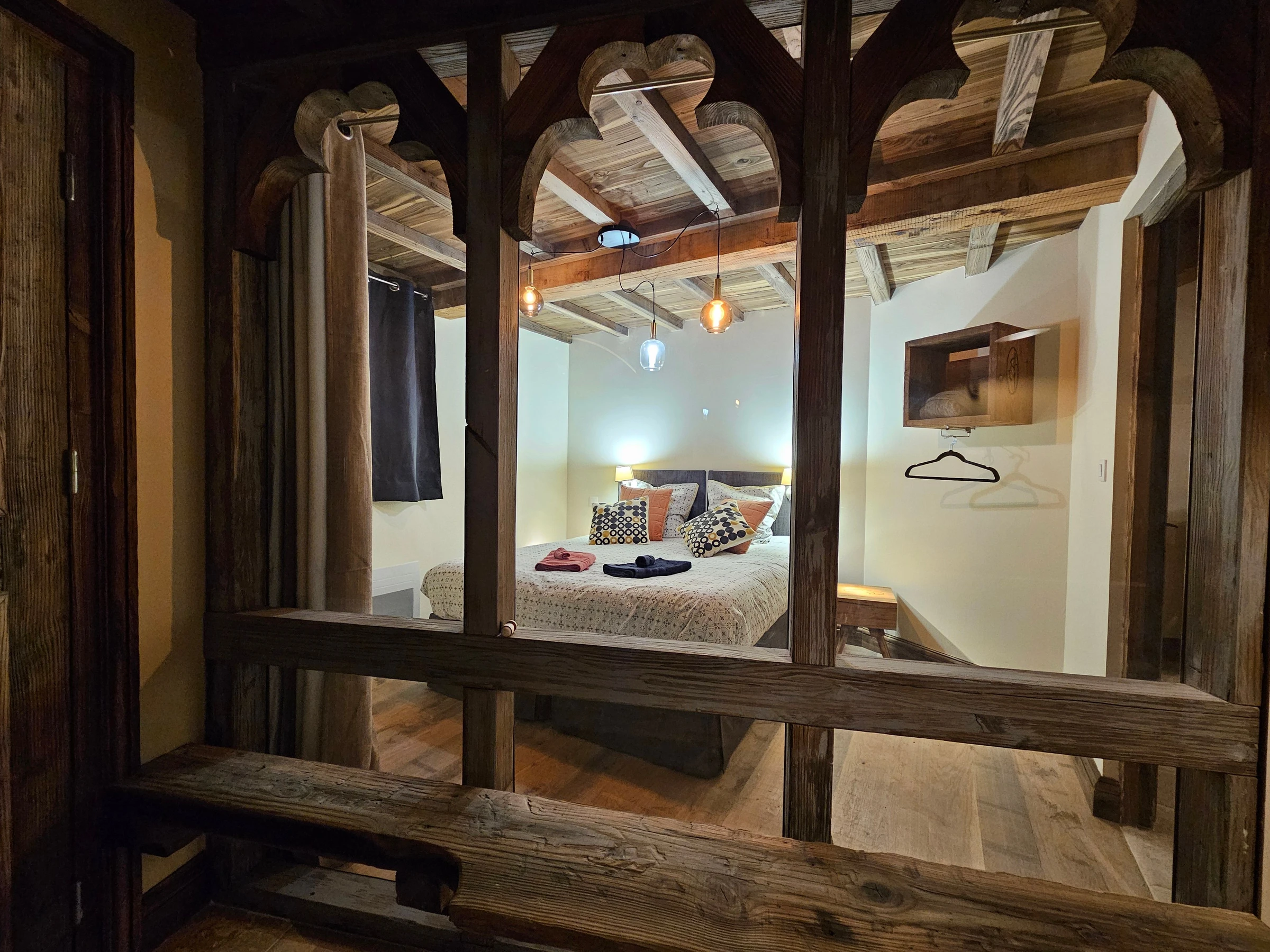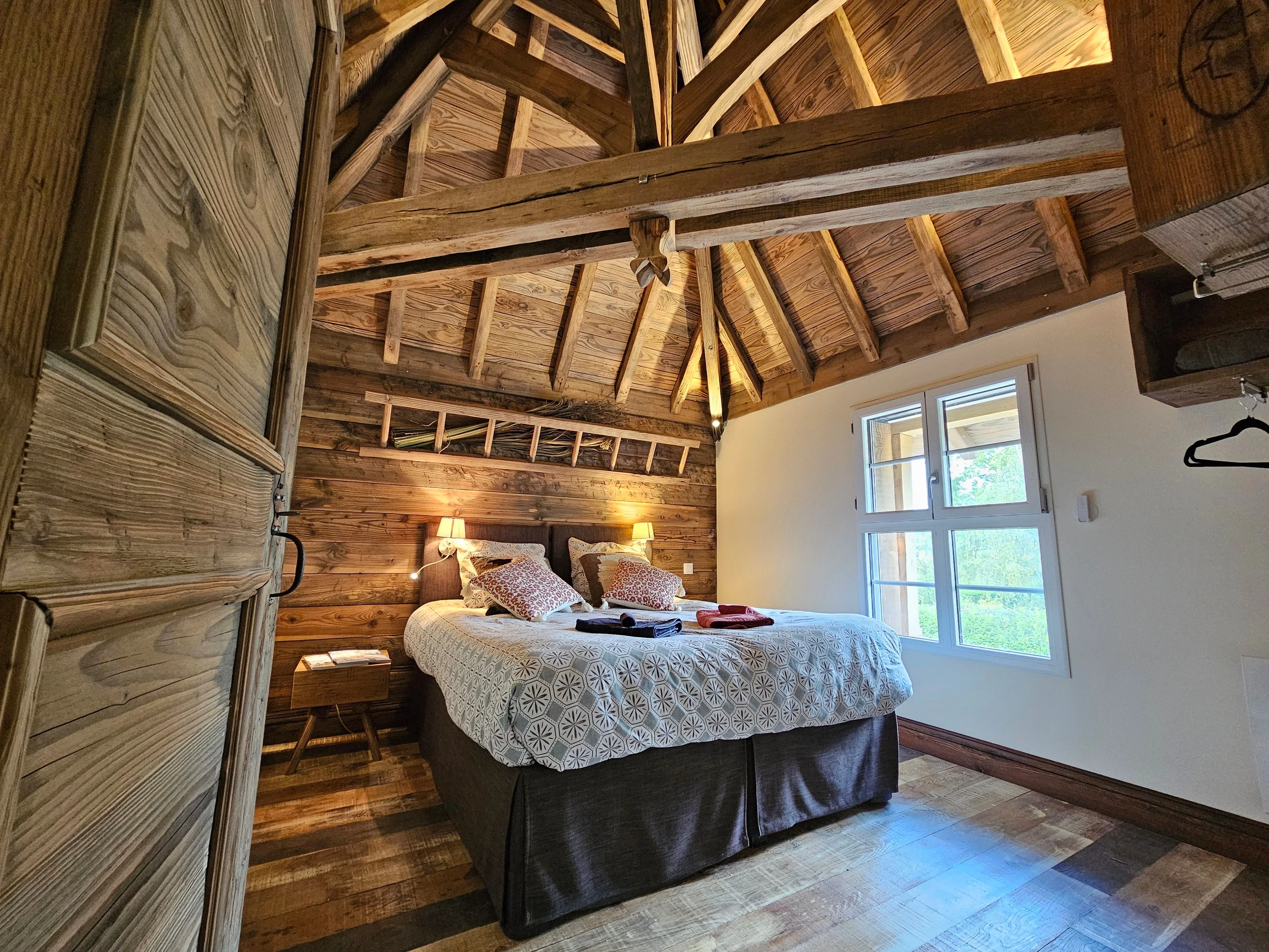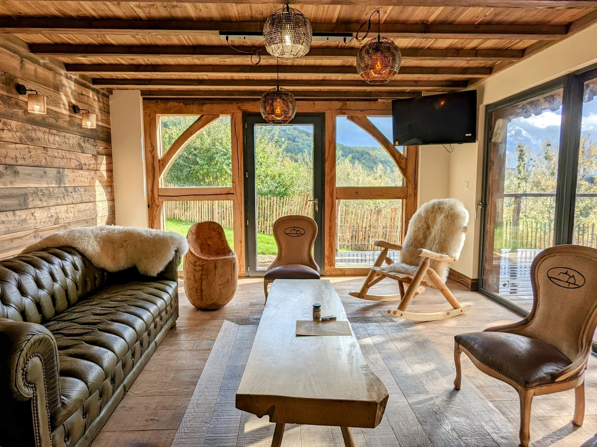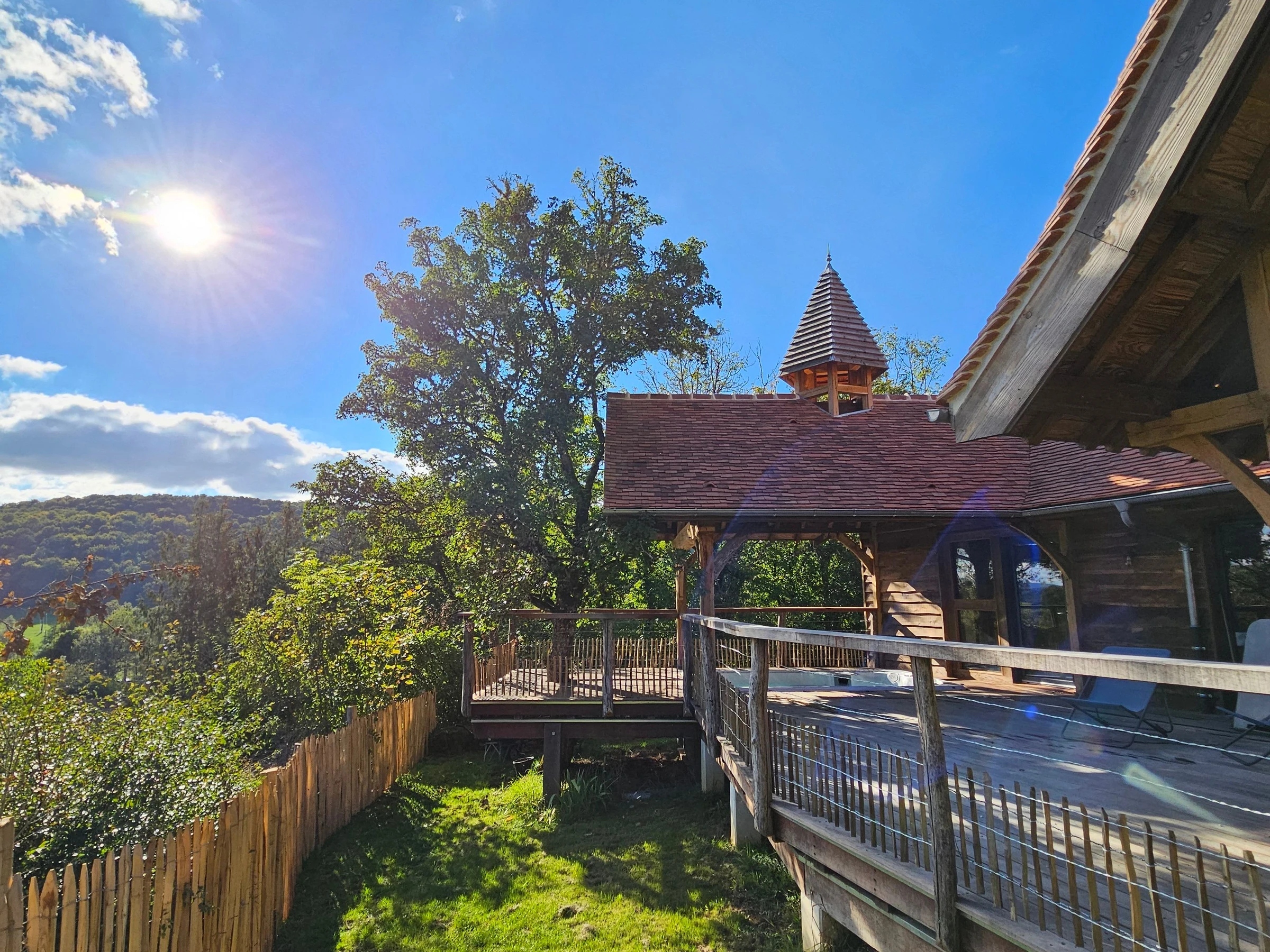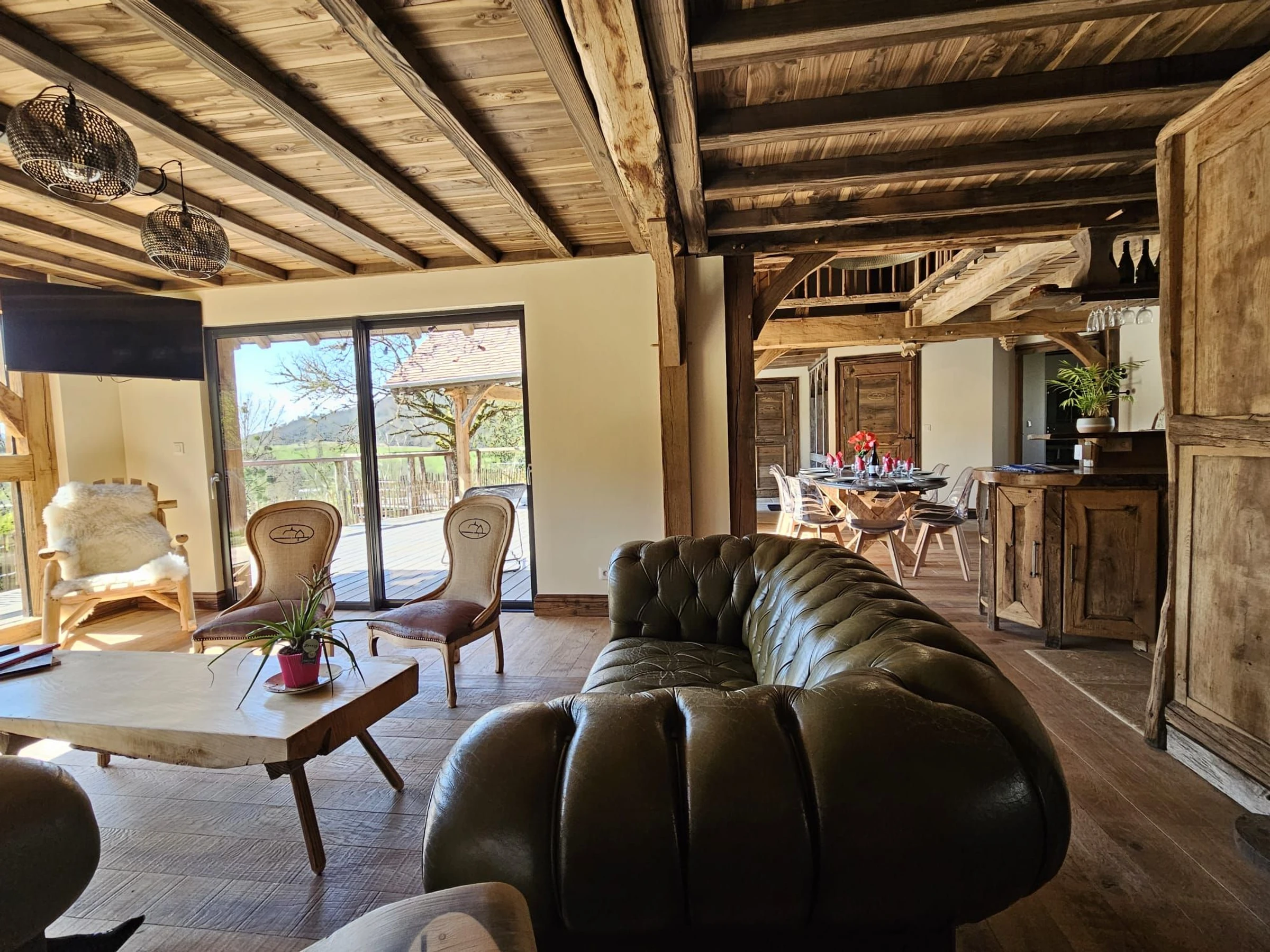 Loosely inspired by the Château du Clos Vougeot, this impressive 100% wooden cottage, with large swimming spa, was entirely built by Arnaud, a carpenter by trade, and Hélène, his wife. They will welcome you in a luxury accommodation with refined decoration and imposing exposed beams.