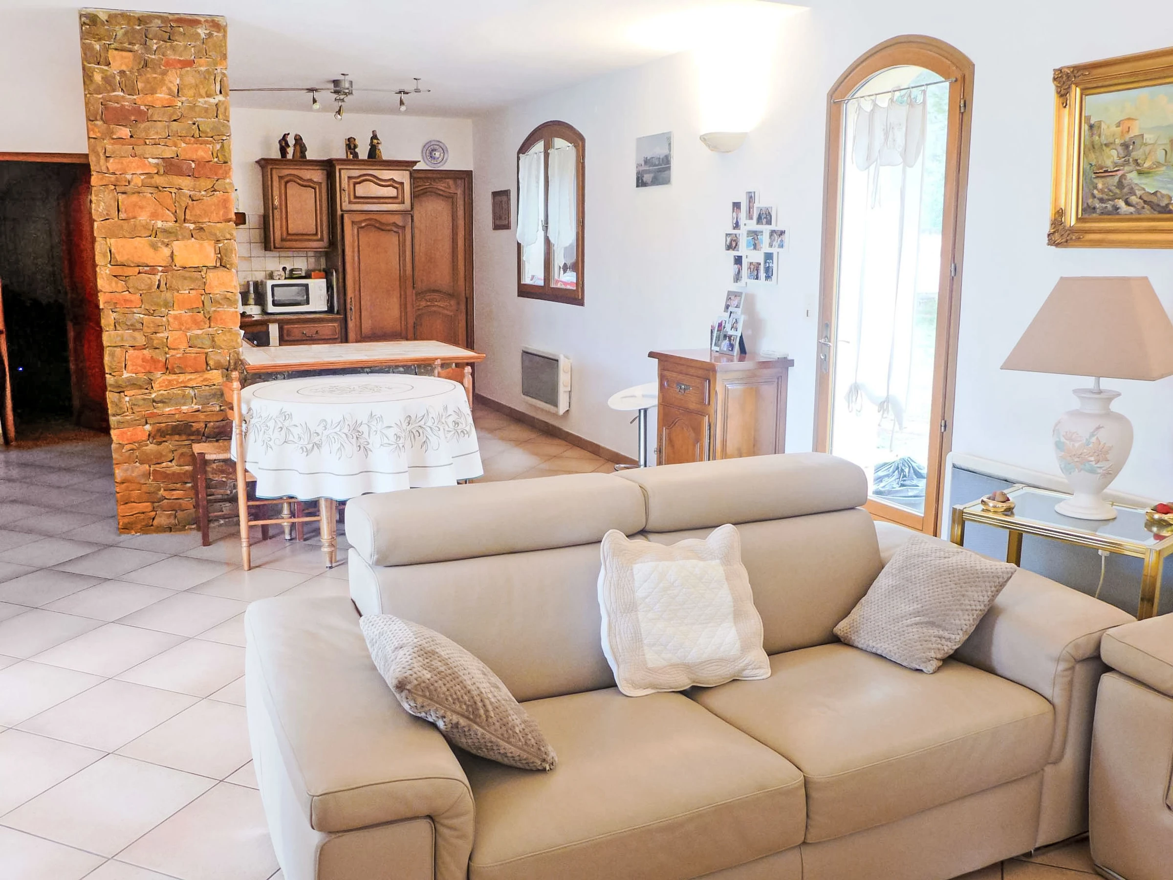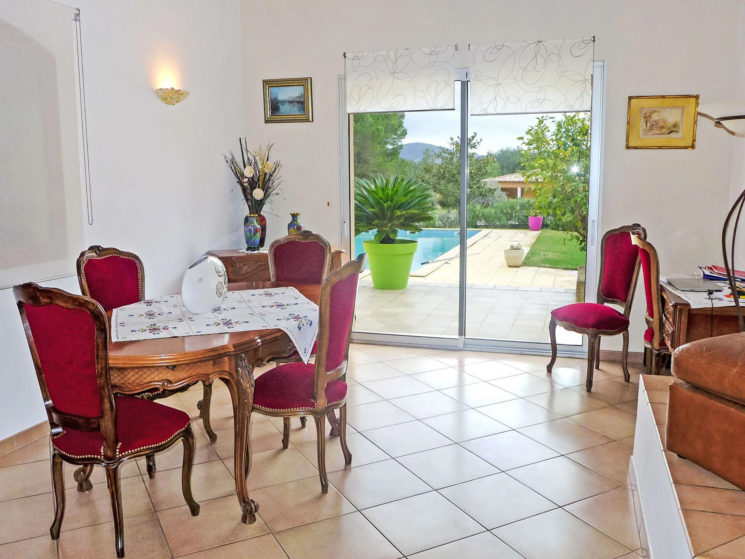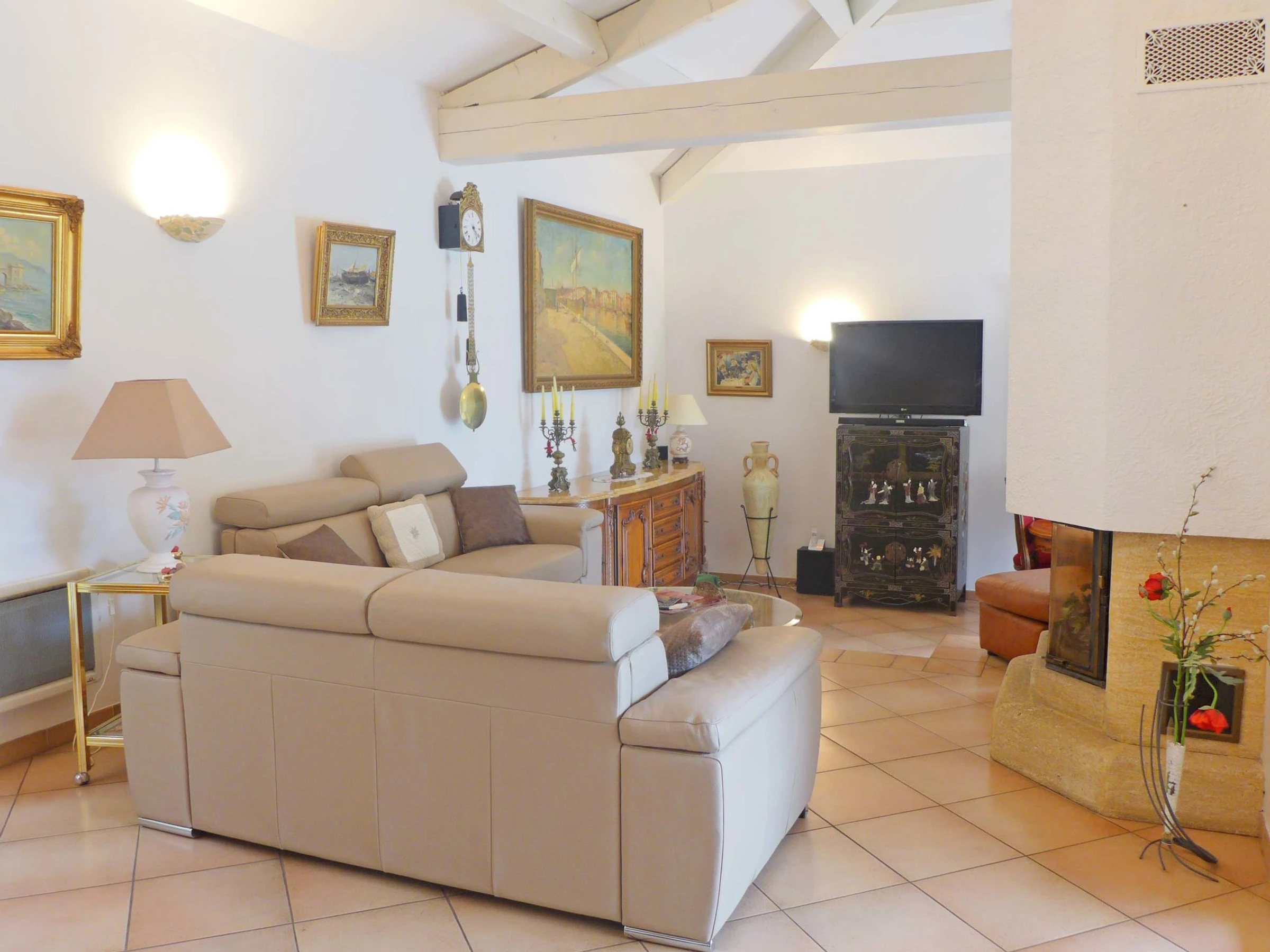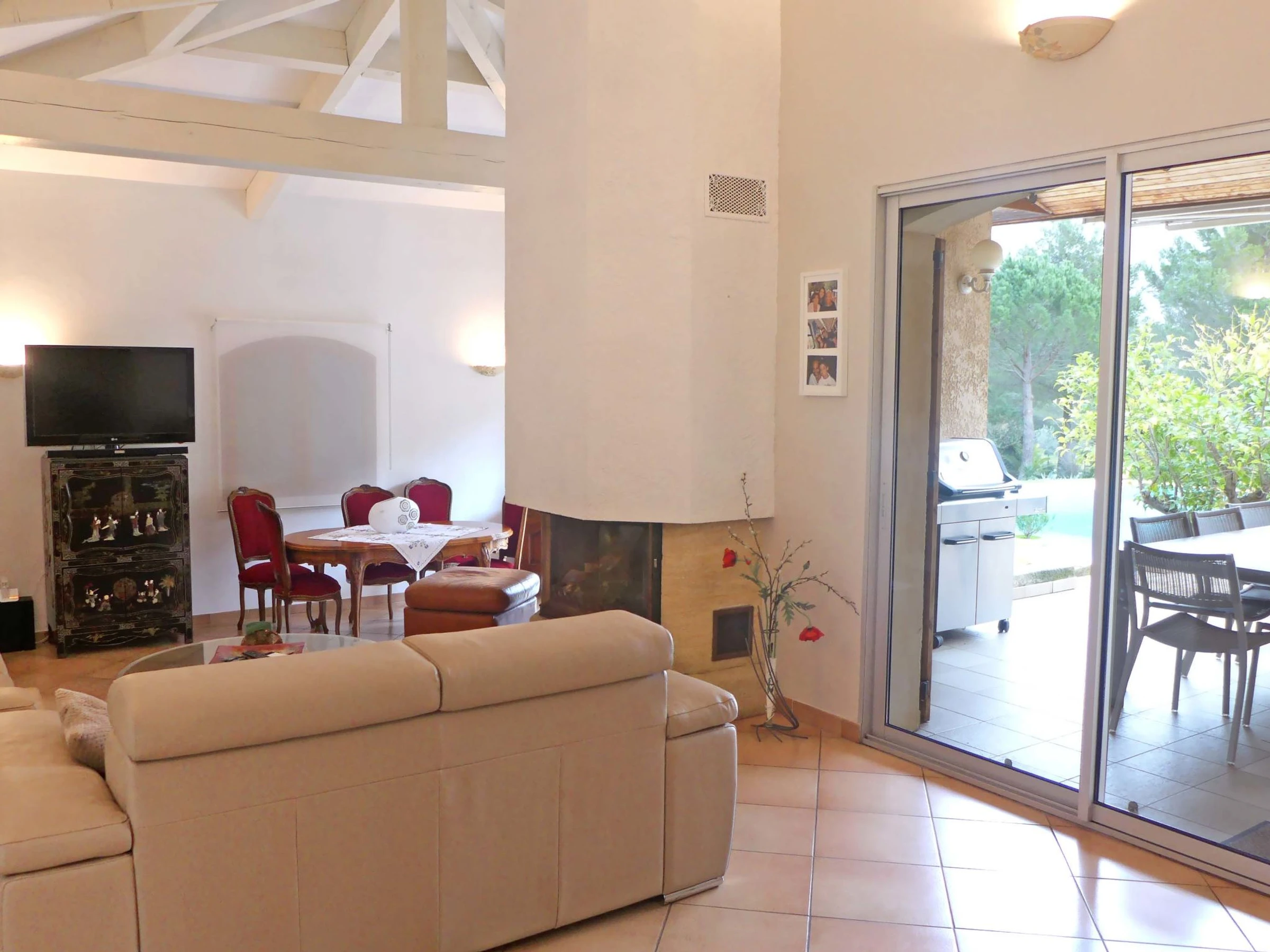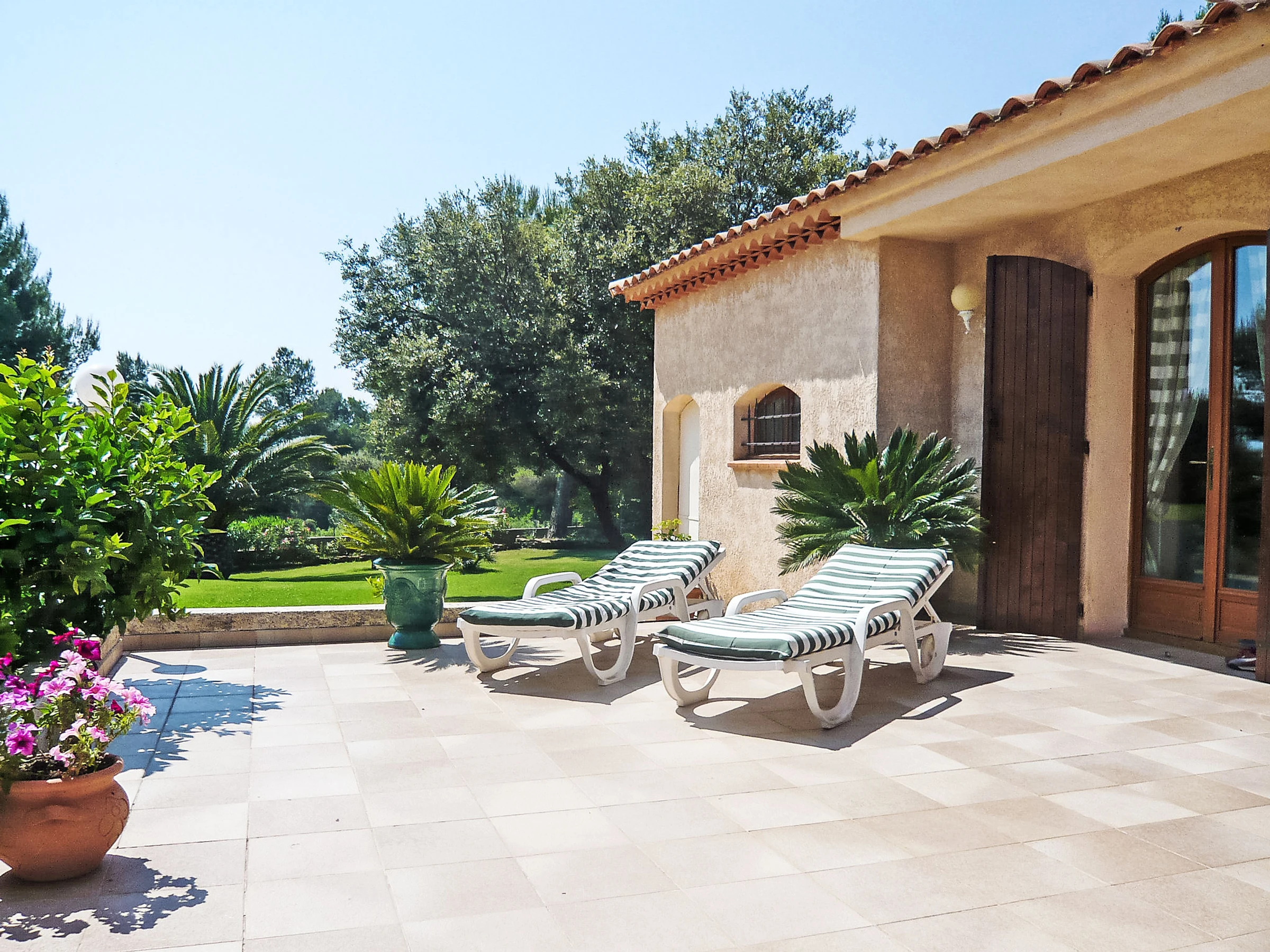 4-room villa 150 m2. Comfortable and beautiful furnishings: living/dining room with dining table and TV (flat screen). Exit to the terrace, to the swimming pool. 2 rooms, each room with 1 french bed (1 x 140 cm, length 190 cm), air conditioning. 1 room with 1 french bed (160 cm, length 200 cm), air conditioning. Exit to the terrace. Open kitchen (oven, dishwasher, 3 ceramic glass hob hotplates, toaster, kettle, microwave, freezer, electric coffee machine, Capsules for coffee machine (NESPRESSO) extra). Bathroom, sep. WC, double hand-basin. Air-conditioning. Large terrace 80 m2. Terrace furniture, barbecue, deck chairs (6). Facilities: washing machine, iron, baby cot for up to 2 year olds. Internet (WiFi, free). Parking (4 cars). Please note: TV only FR. Smoke alarm.