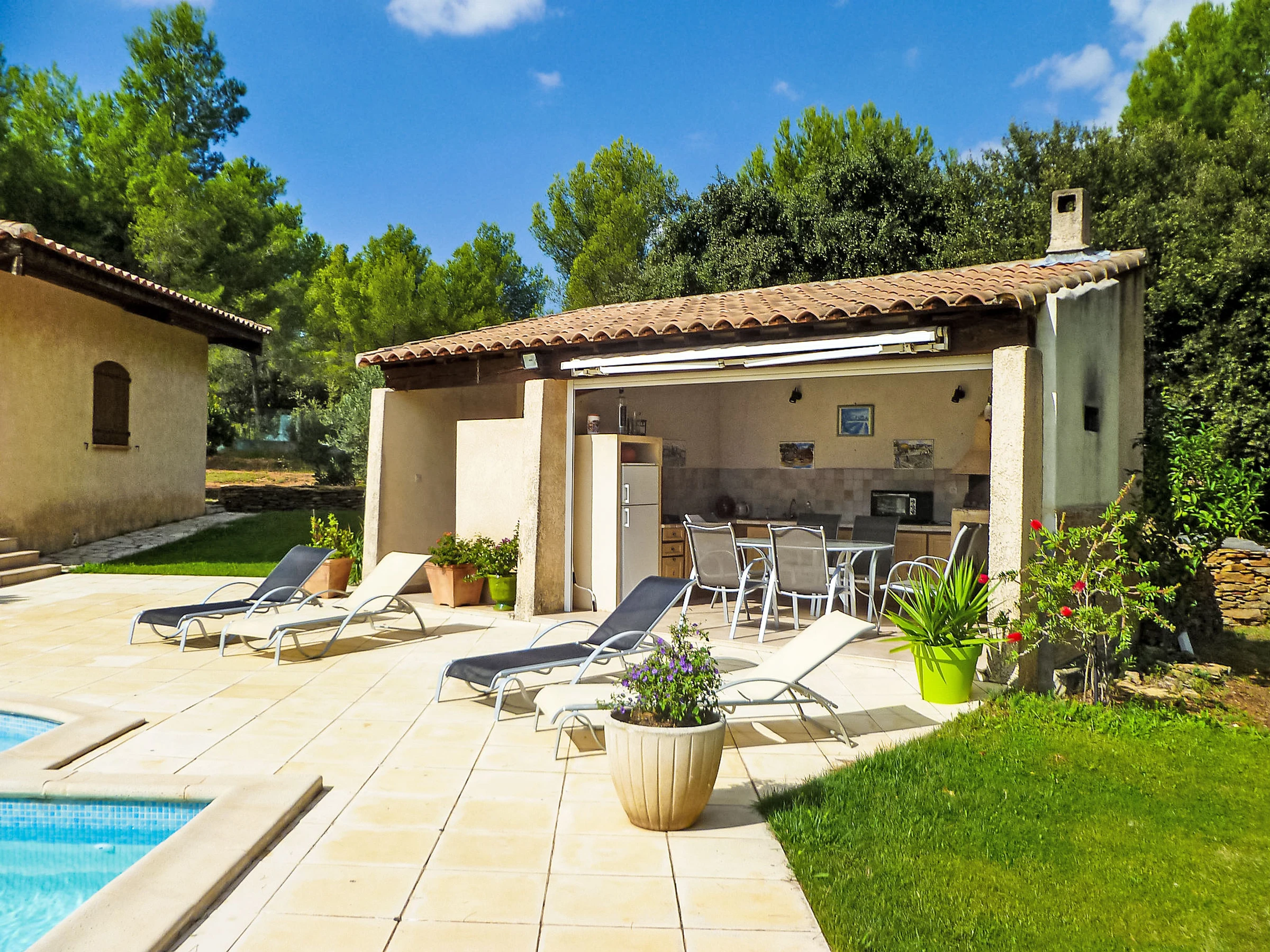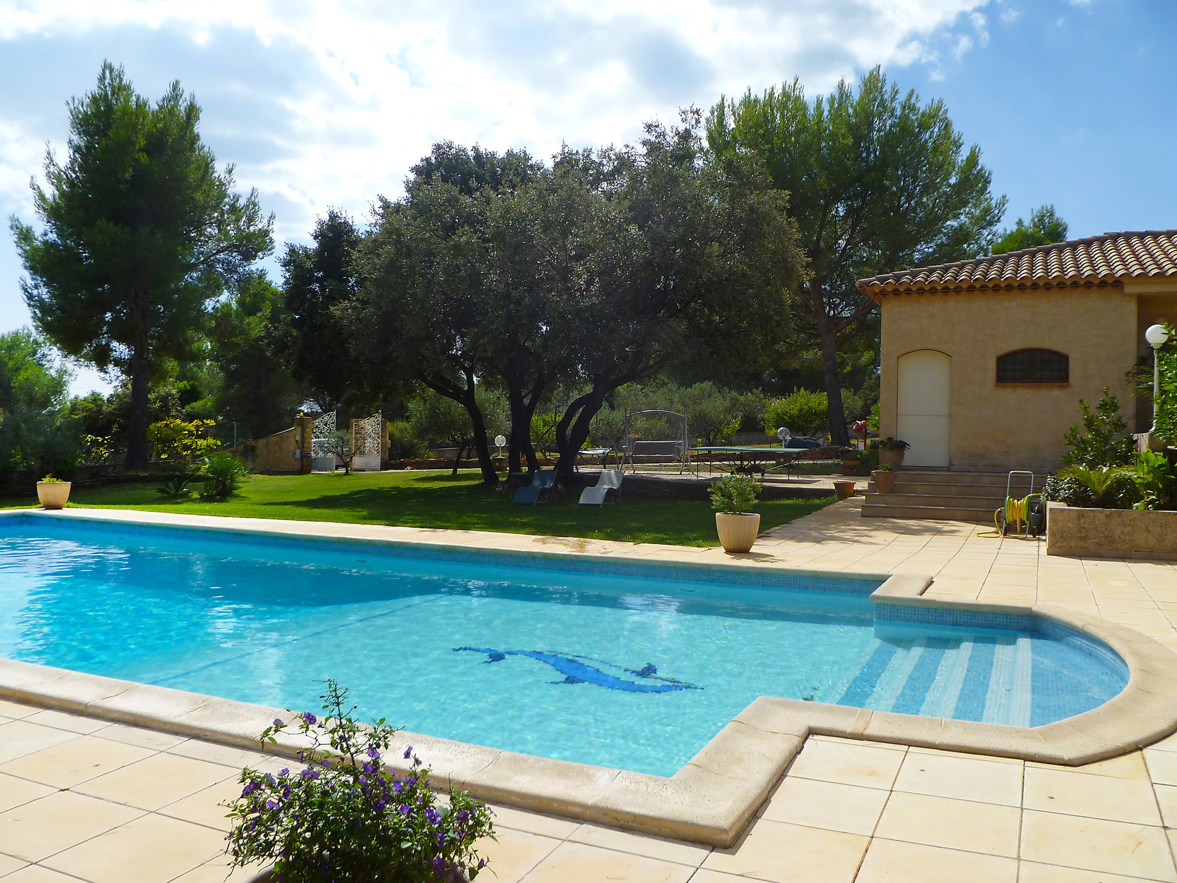 6 km from La Cadière d'Azur: Single-family house "La Péguière". In a quiet position in the residential district, 4 km from the sea. Private: property 5'000 m2 (fenced) with lawn 1'000 m2, beautiful garden to relax, swimming pool (12 x 7 m, depth 150 - 325 cm, seasonal availability: [hidden] - [hidden] with alarm system. Pool house with fridge, shower, WC and cooking stove, boules, fireplace. Shop 6 km, supermarket 4 km, restaurant 6 km, café 6 km, bus stop "La Malissone" 4 km, railway station "Saint Cyr Sur Mer/ La Cadière" 3 km. Sports harbour 5 km, golf course (18 hole) 8 km. Hiking paths: Sainte Baume et Sainte Victoire, Calanques Port-Cros, Porquerolles, Ile verte, Embiez, Figuerolles, Cassis. Please note: car recommended.