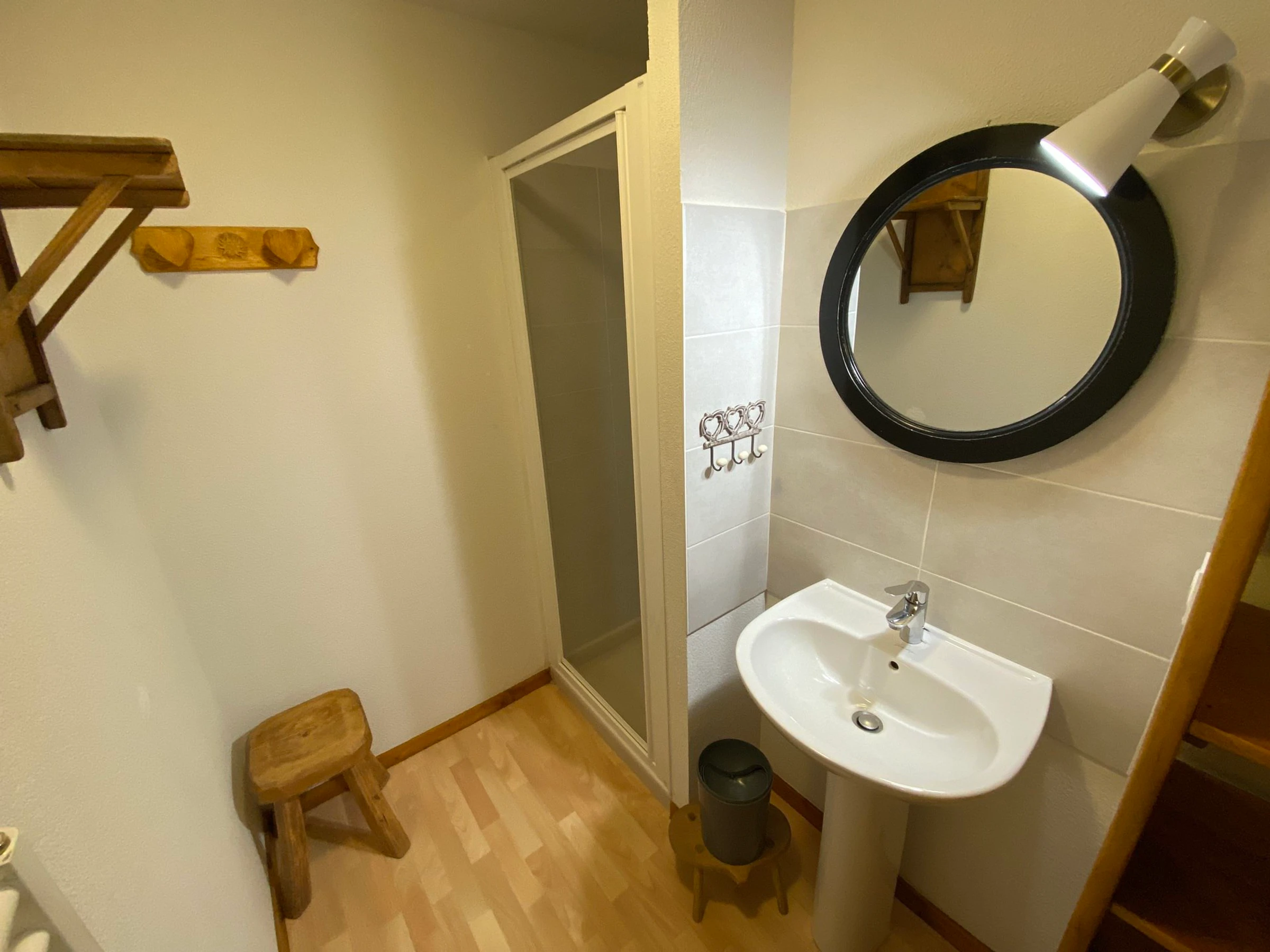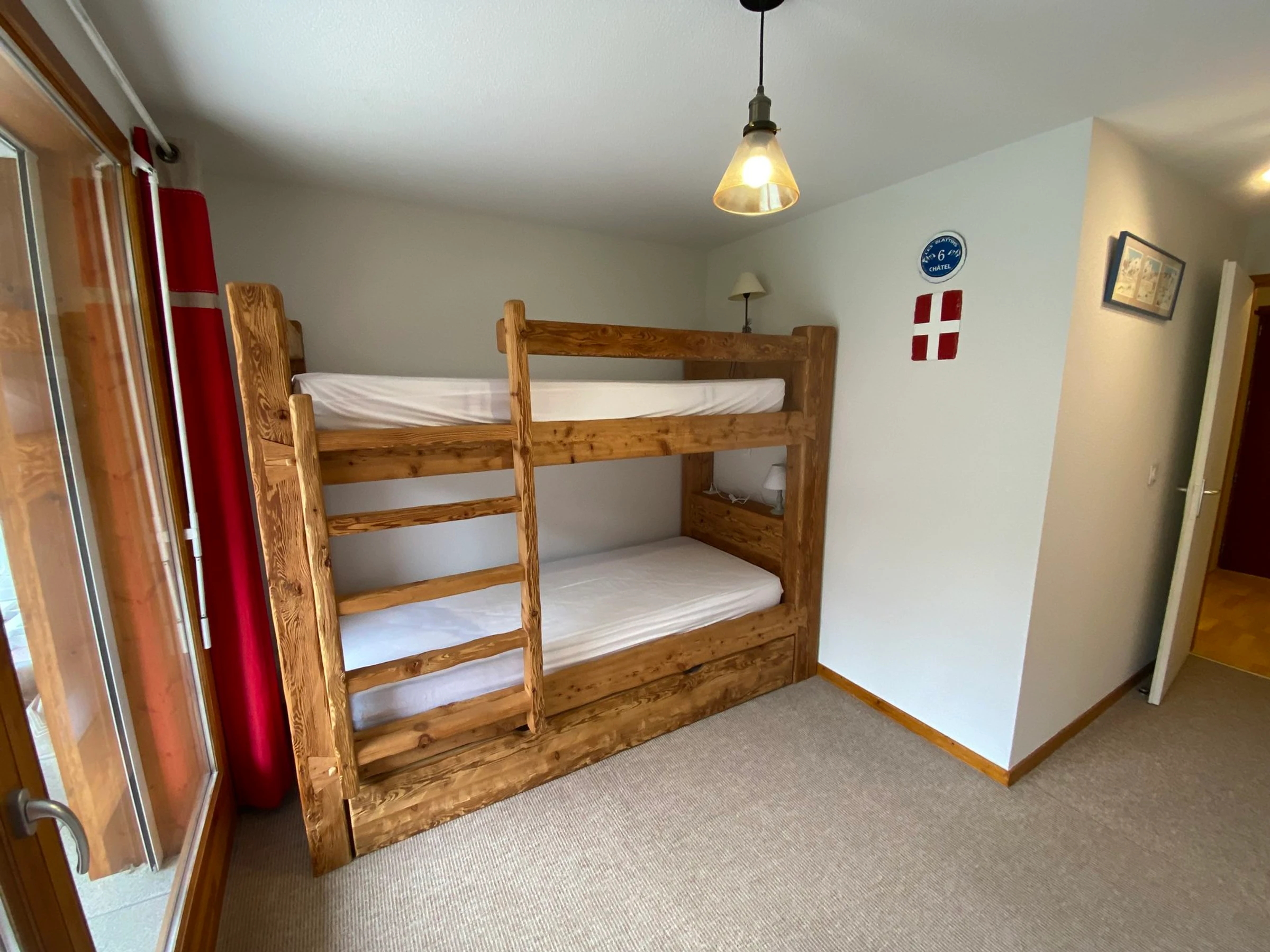 54 m² apartment, on the ground floor comprising an entrance with cupboards, separate toilet, a bathroom with shower and sink, a washing machine, a bedroom with bunk beds (90x190), a kitchen equipped with a dishwasher, a living room, a second bedroom with a double bed (160x200),