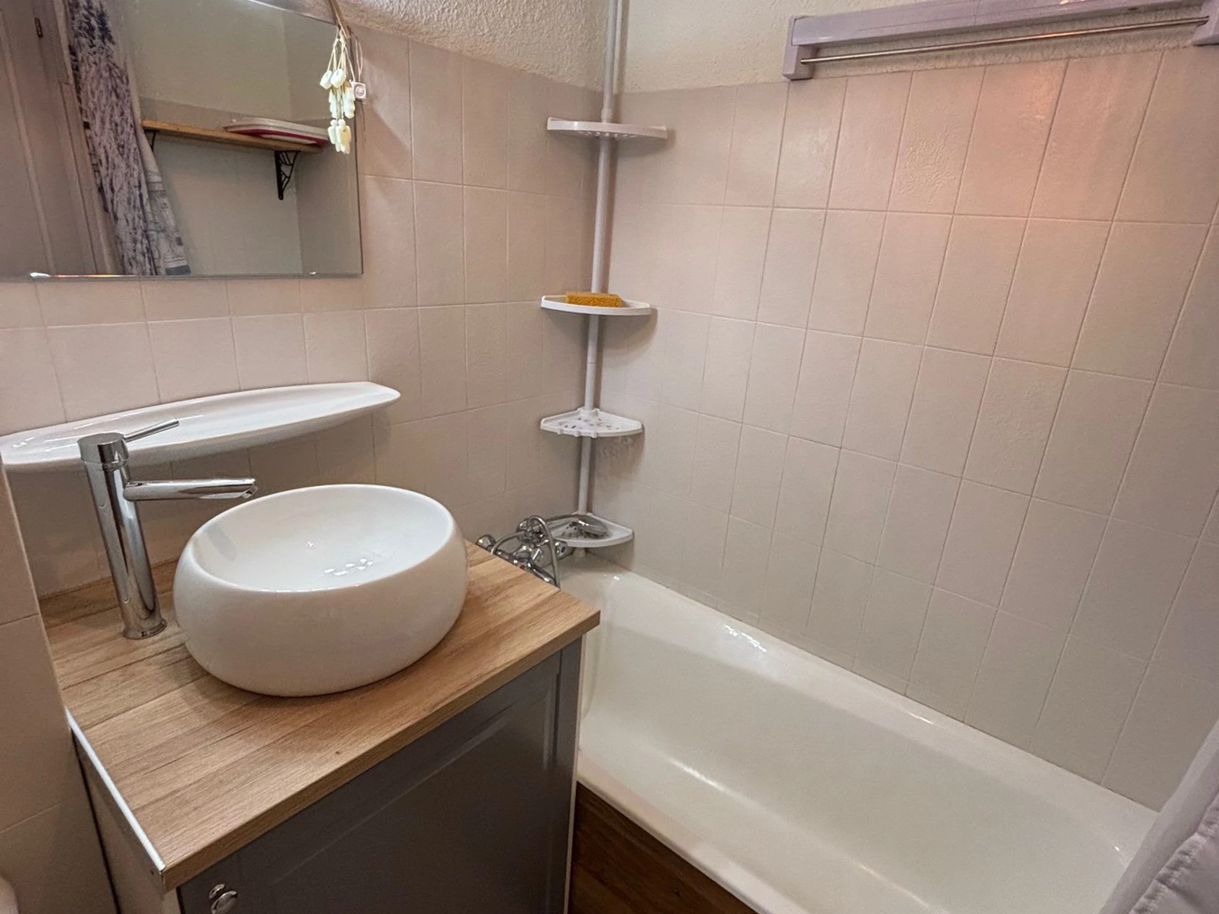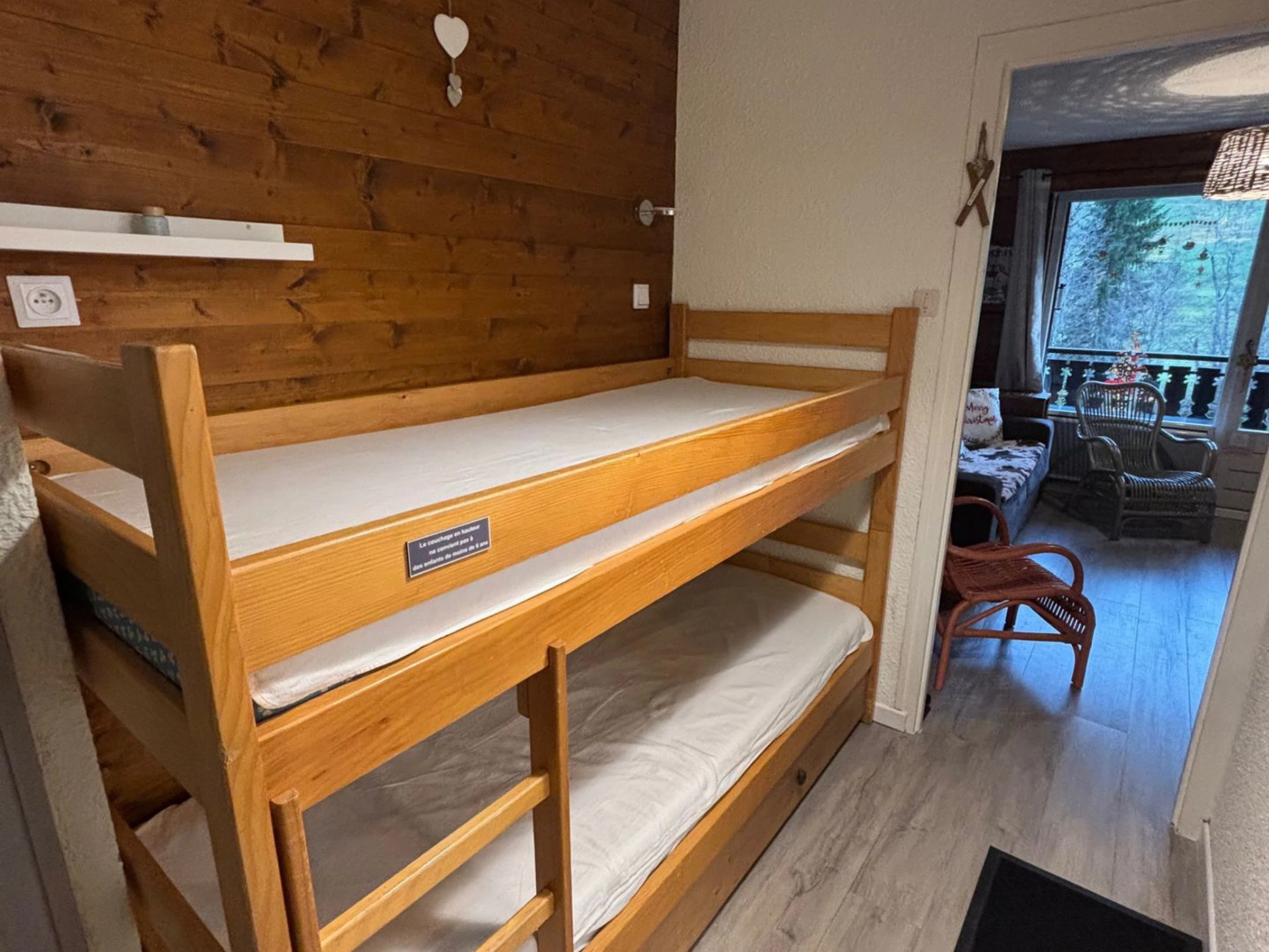Studio located on the 1st floor without elevator comprising an entrance, mountain corner with bunk beds (2 x 90x190), bathroom with toilet and washing machine, living room with a sofa bed and kitchenette area equipped with dishwasher. South-facing balcony.