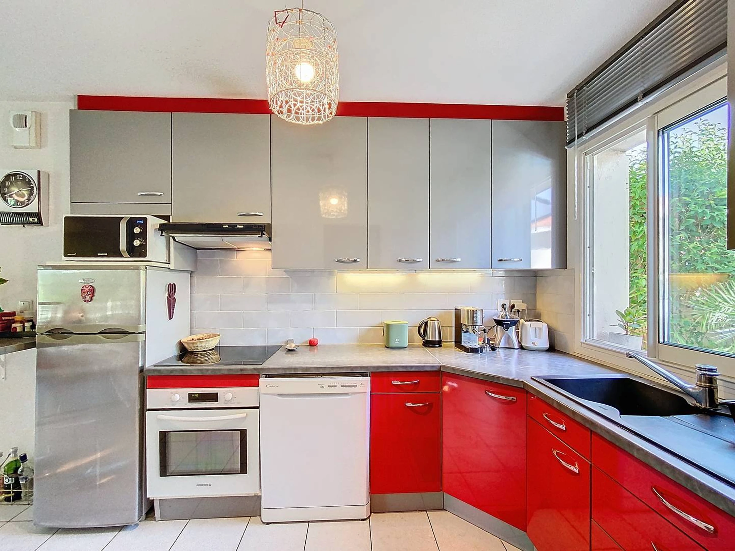 Direct access to an enclosed terrace with a dining table, ideal for enjoying meals with family or friends, overlooking the garden