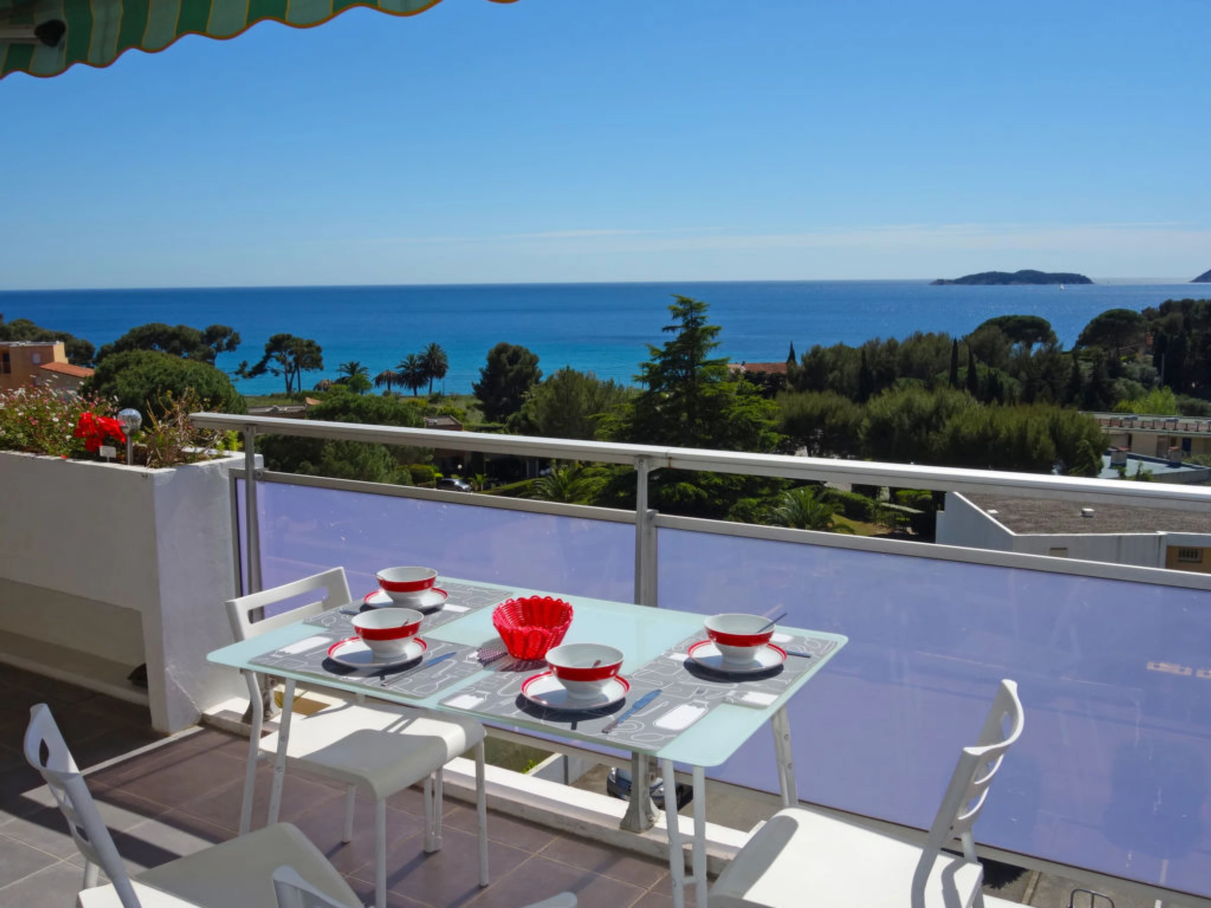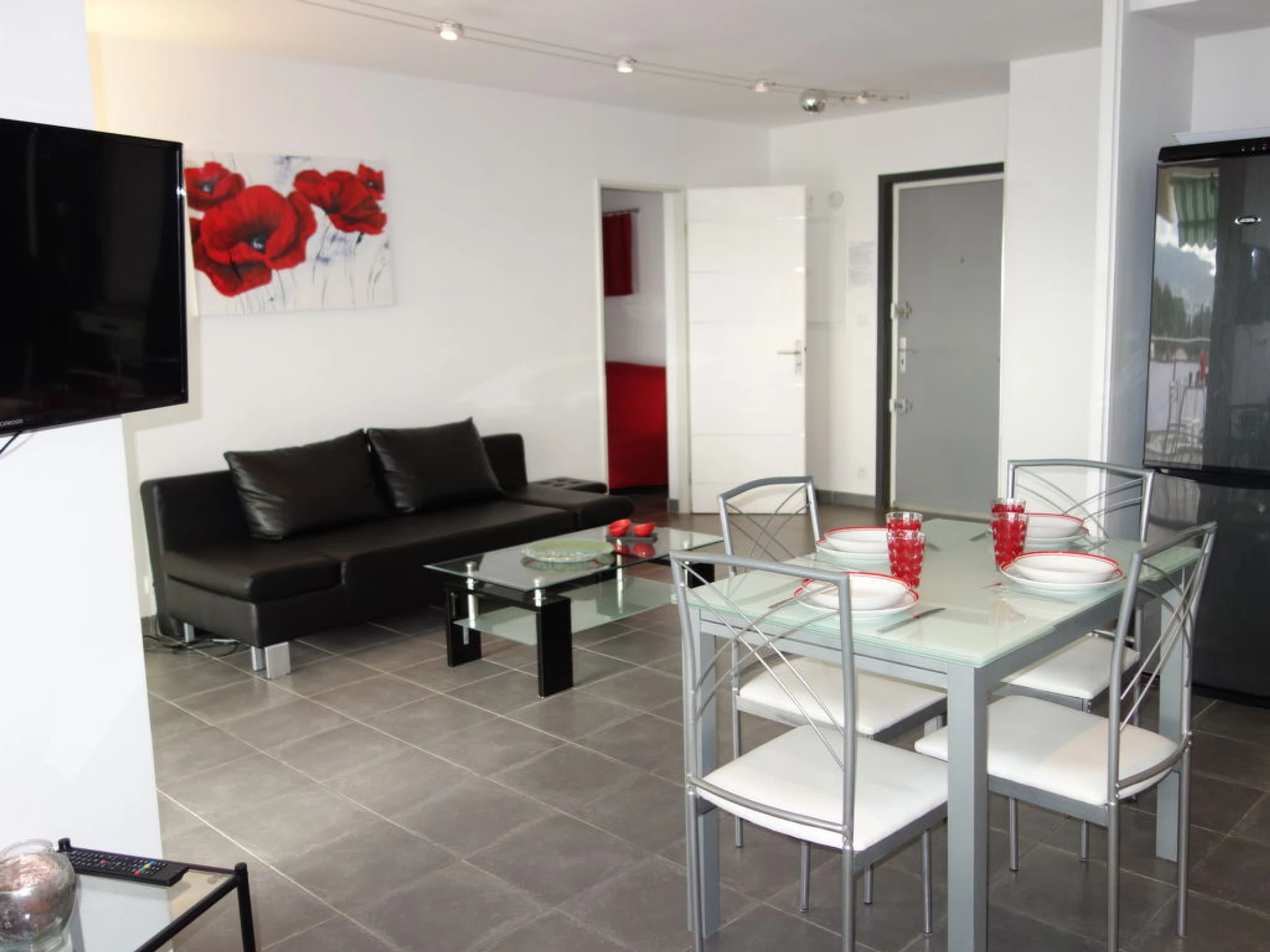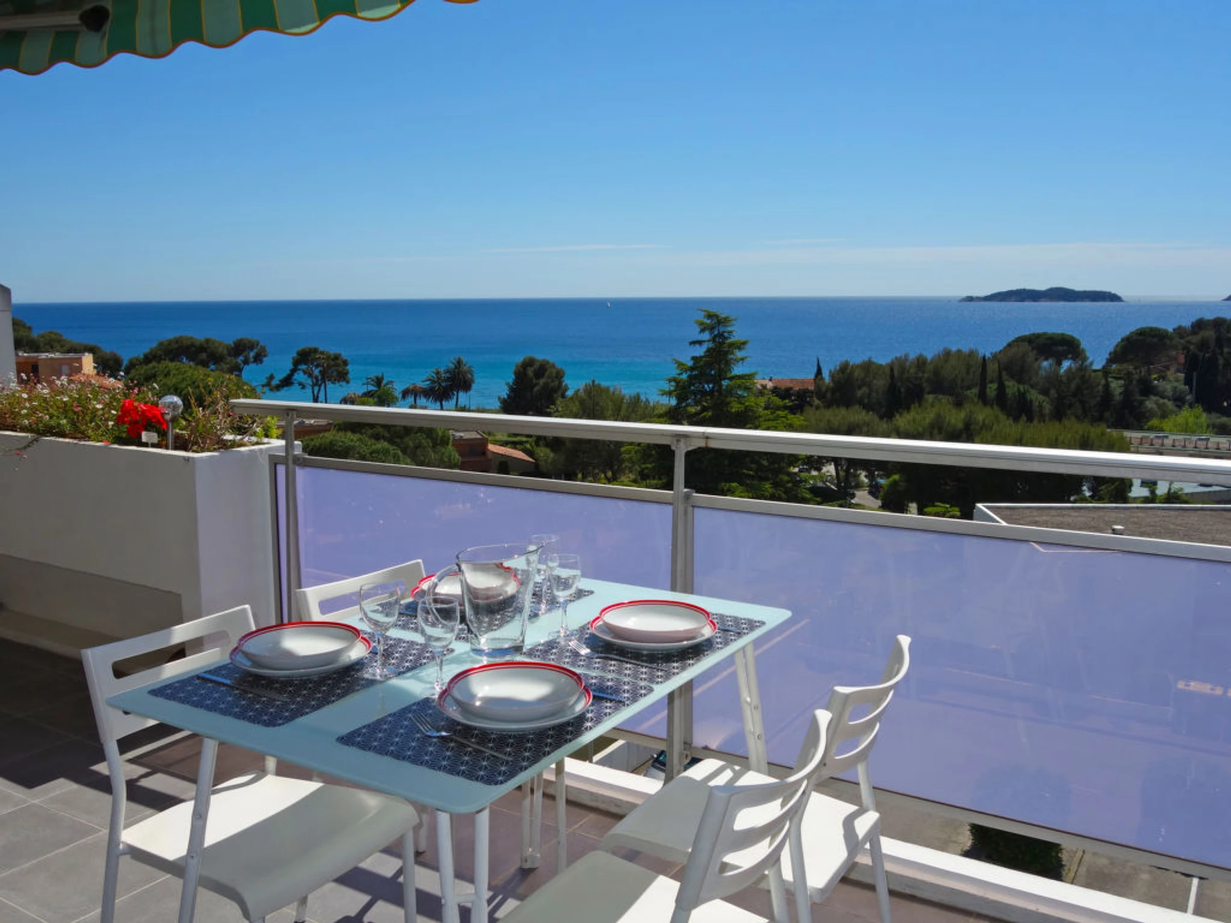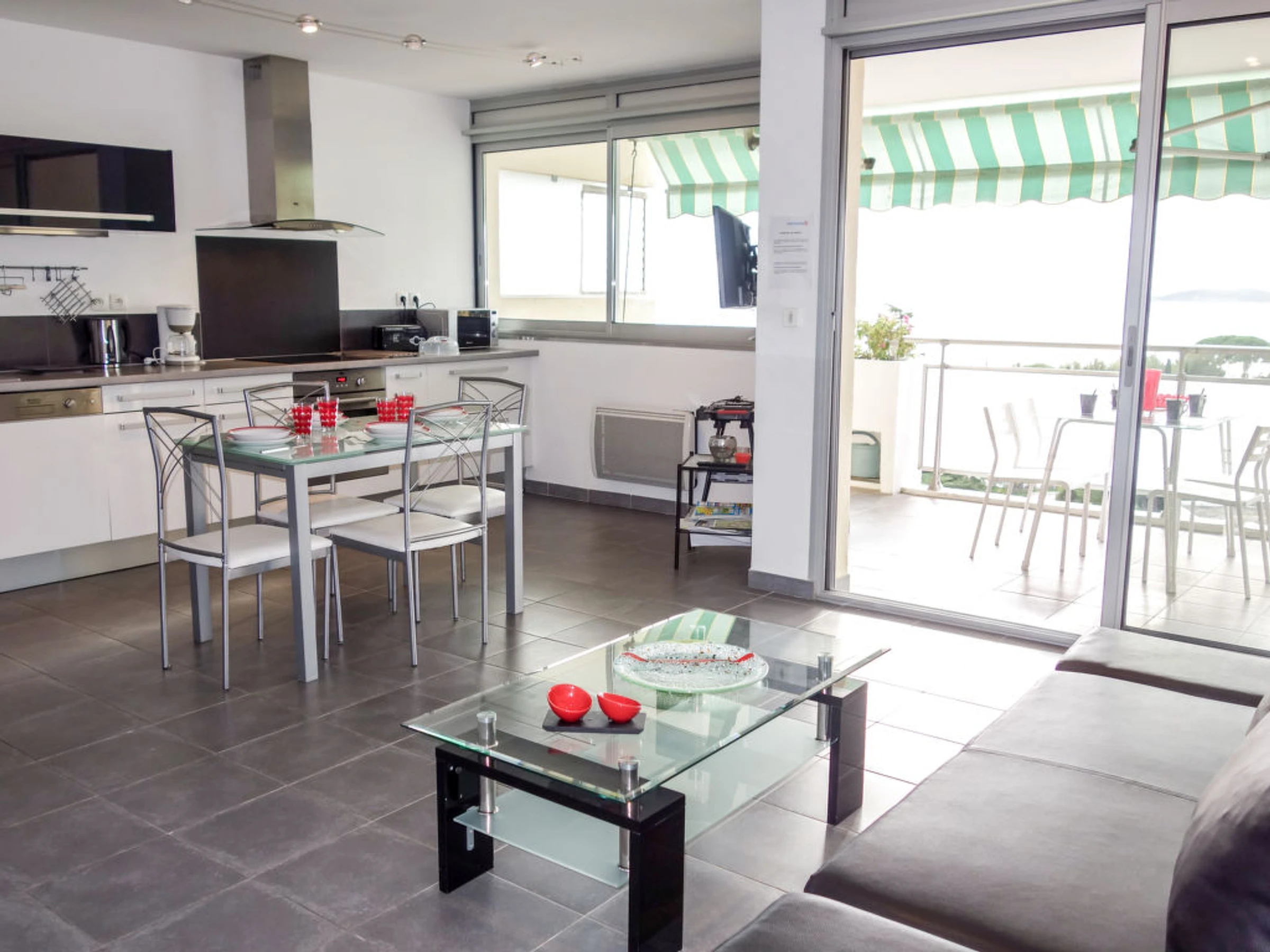 3-room apartment 56 m2 on 2nd floor, south facing position. Renovated in 2012, practical and modern furnishings: large living/dining room with TV (flat screen). Exit to the terrace, south facing position. Walk-through room with 1 double sofabed (140 cm, length 190 cm). 1 room with 1 french bed (1 x 140 cm, length 190 cm). Exit to the terrace. Large, open kitchen (oven, dishwasher, 3 induction hot plates, freezer, electric coffee machine, combination microwave). Shower, sep. WC. Electric heating. Large terrace 20 m2, roofed, south facing position. Terrace furniture, electric barbecue. Marvellous panoramic view of the sea. Facilities: washing machine, iron. Internet (WiFi, extra). Reserved parking space n 188. Please note: TV only FR. Smoke alarm, no lift. Access to the bedroom with the double bed is throught the bedroom with the double sofa bed.