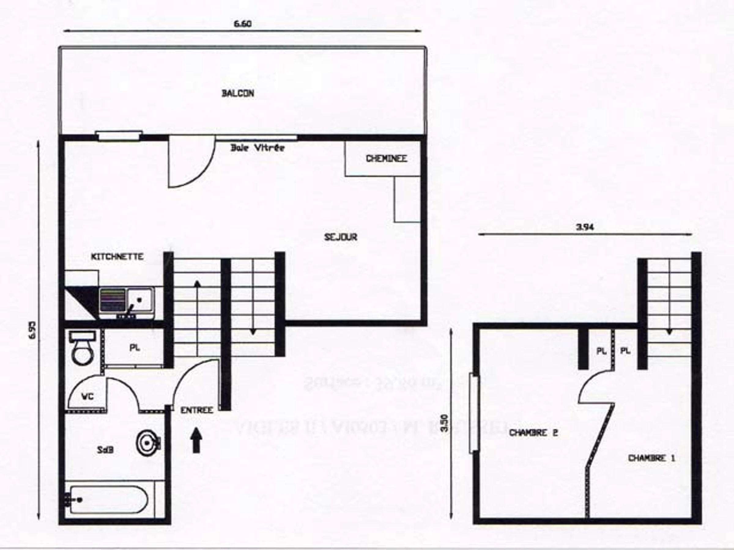 - At the first half-floor : Living room with french window and balcony south facing, fireplace, sofa bed 130 cm x 2 pers (13.22 sqm)