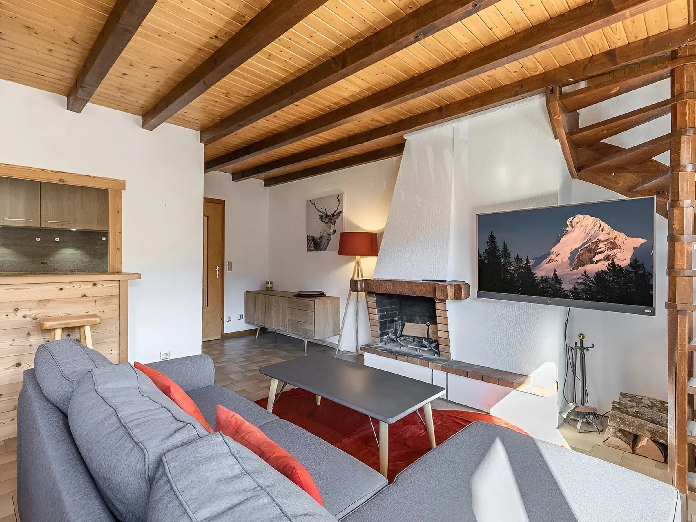The entrance, located on the second floor, leads to the other rooms before reaching a bathroom including a bathtub, and a separate toilet. The living room is organised around a dining area and a sofa bed (140 cm) in a warm atmosphere enhanced by the fireplace. The kitchen is open and integrated into the living room. The south-facing balcony allows to enjoy the view.