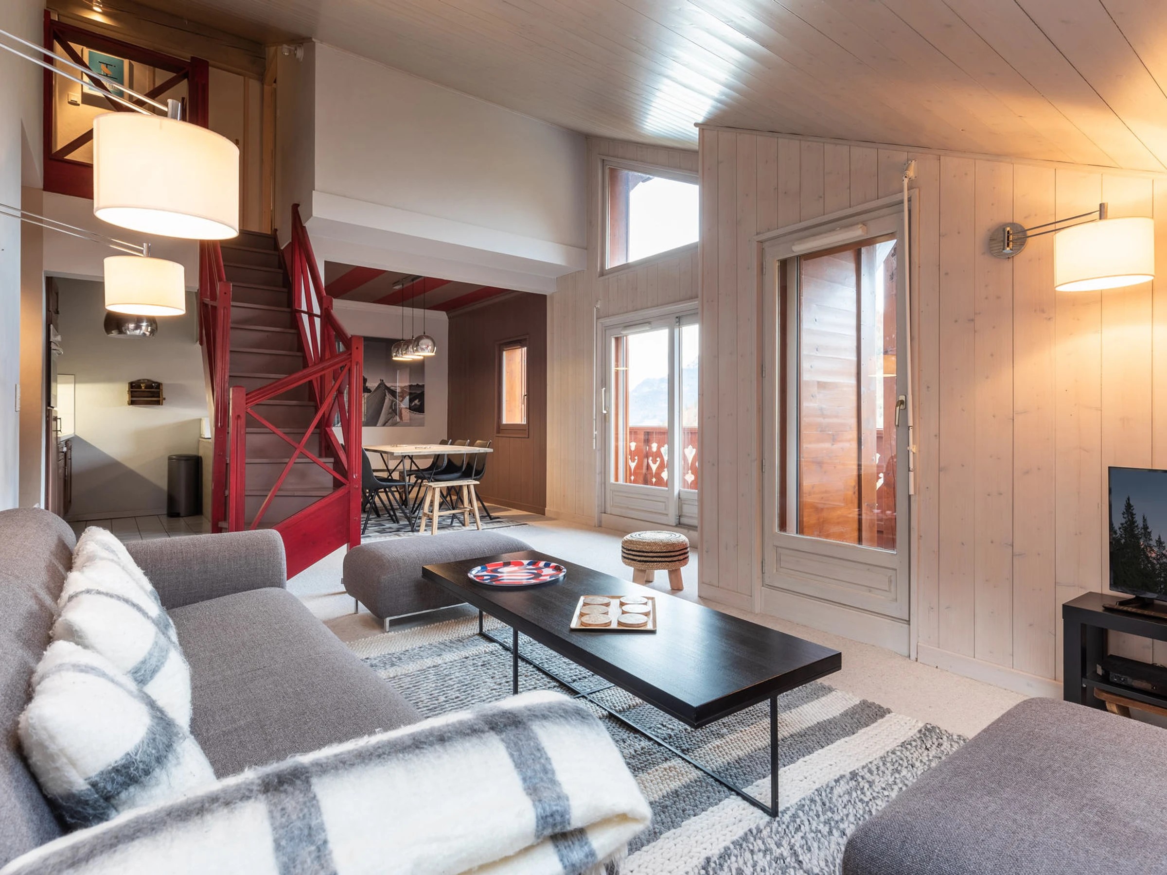 - LIVING-ROOM (26.06m² including 2.72m² mansard roofed) : sofa, flat screen TV, french window, east balcony access, slopes / village / mountain view, roof window