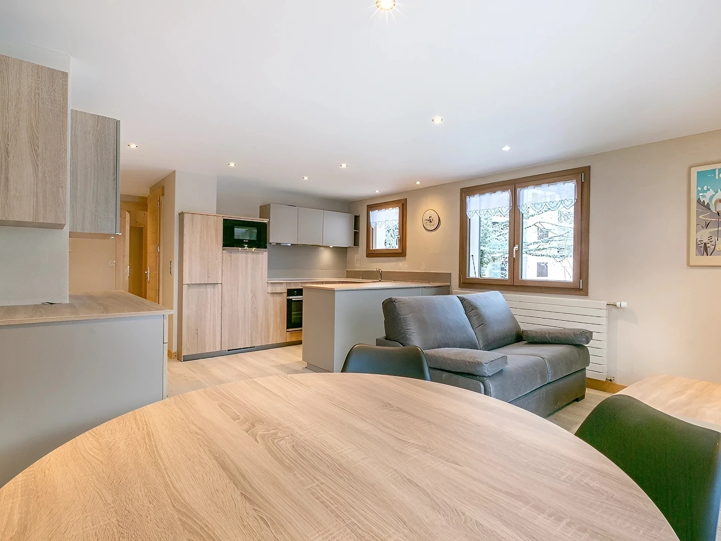 - KITCHEN open to living-room : combined fridge + freezer (210 L), INDUCTION STOVE, OVEN, MICROWAVE, DISHWAHER, south facing window, vegetation / next door residences / mountain view