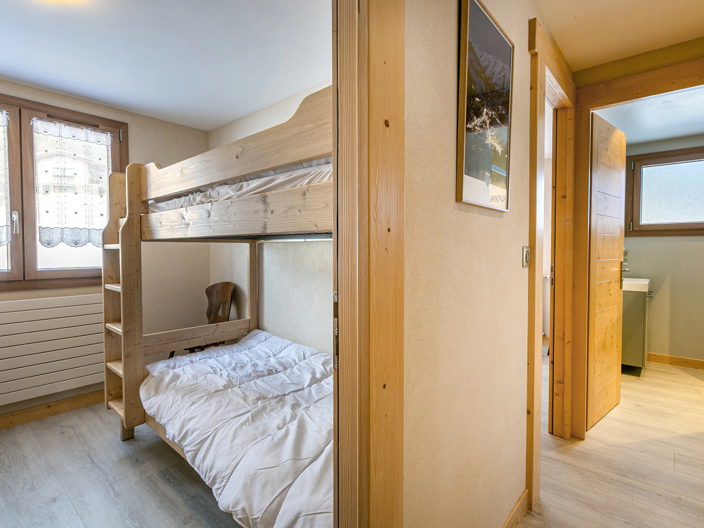 - SLEEPING NOOK (6.39 m²) : 2 BUNK BEDS (80) -> upper bed forbidden under 6 years old, east facing window, vegetation / Col de la Croix Fry road / next door residences view