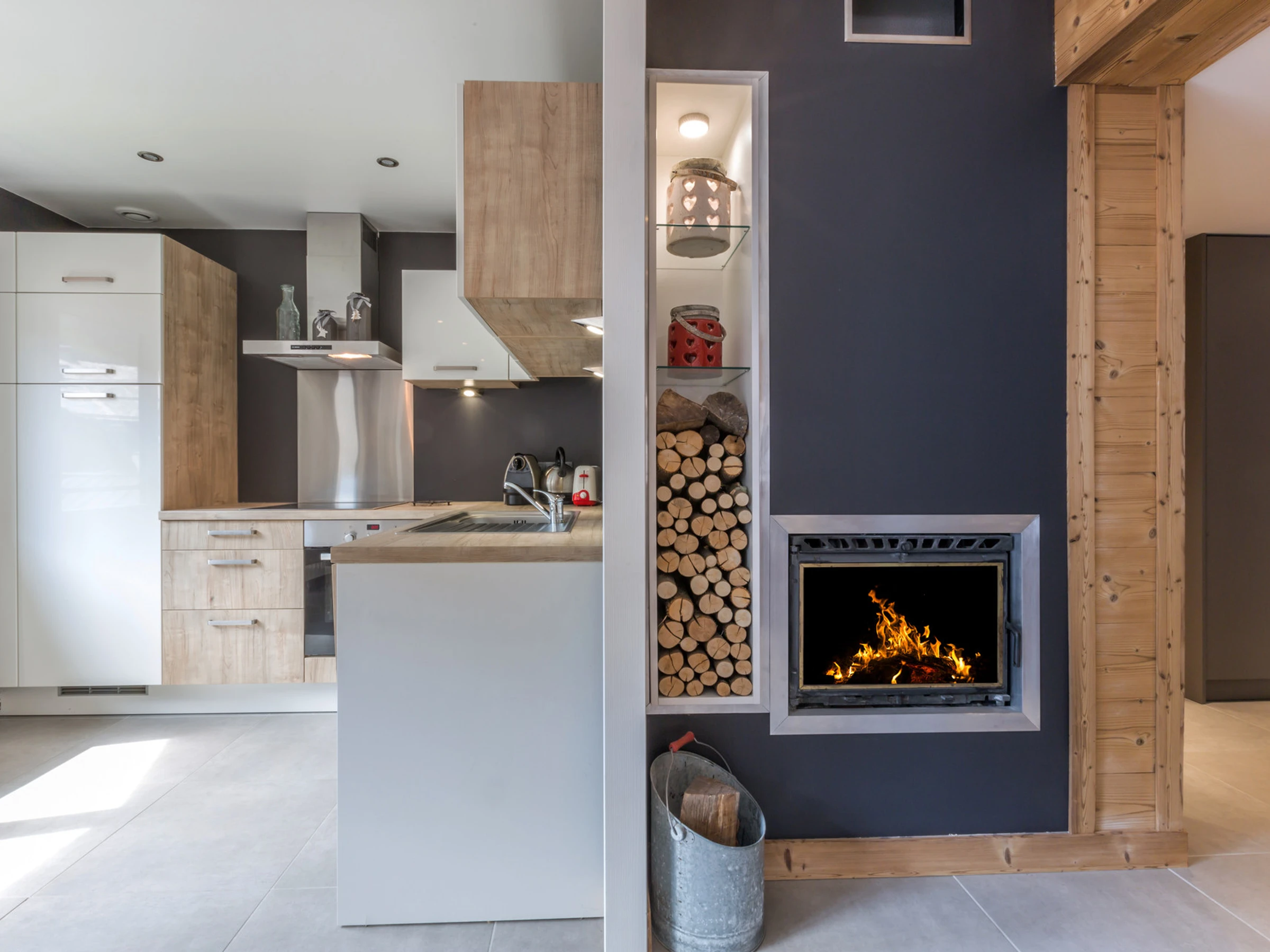 The entrance, located on the 3rd floor, offers a spacious area with a non-working fireplace. The living room combines a lounge and a dining area, complemented by a double sofa bed (140 cm). The south and west-facing windows provide plenty of natural light. The open kitchen blends harmoniously into this space.