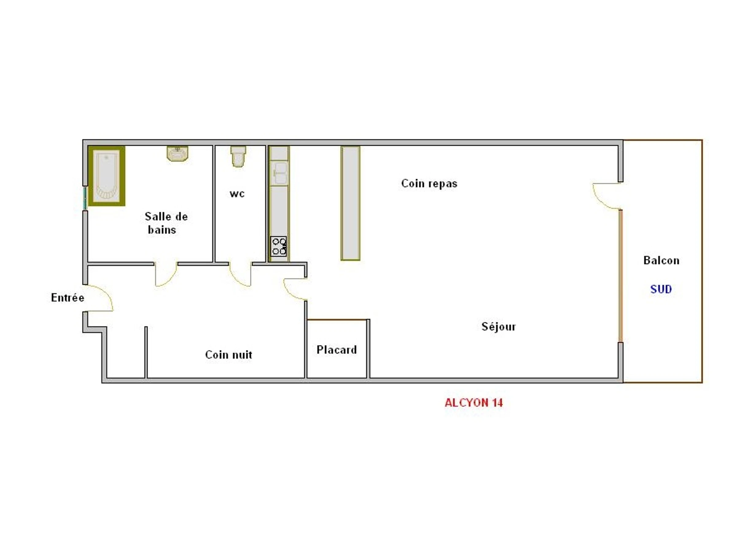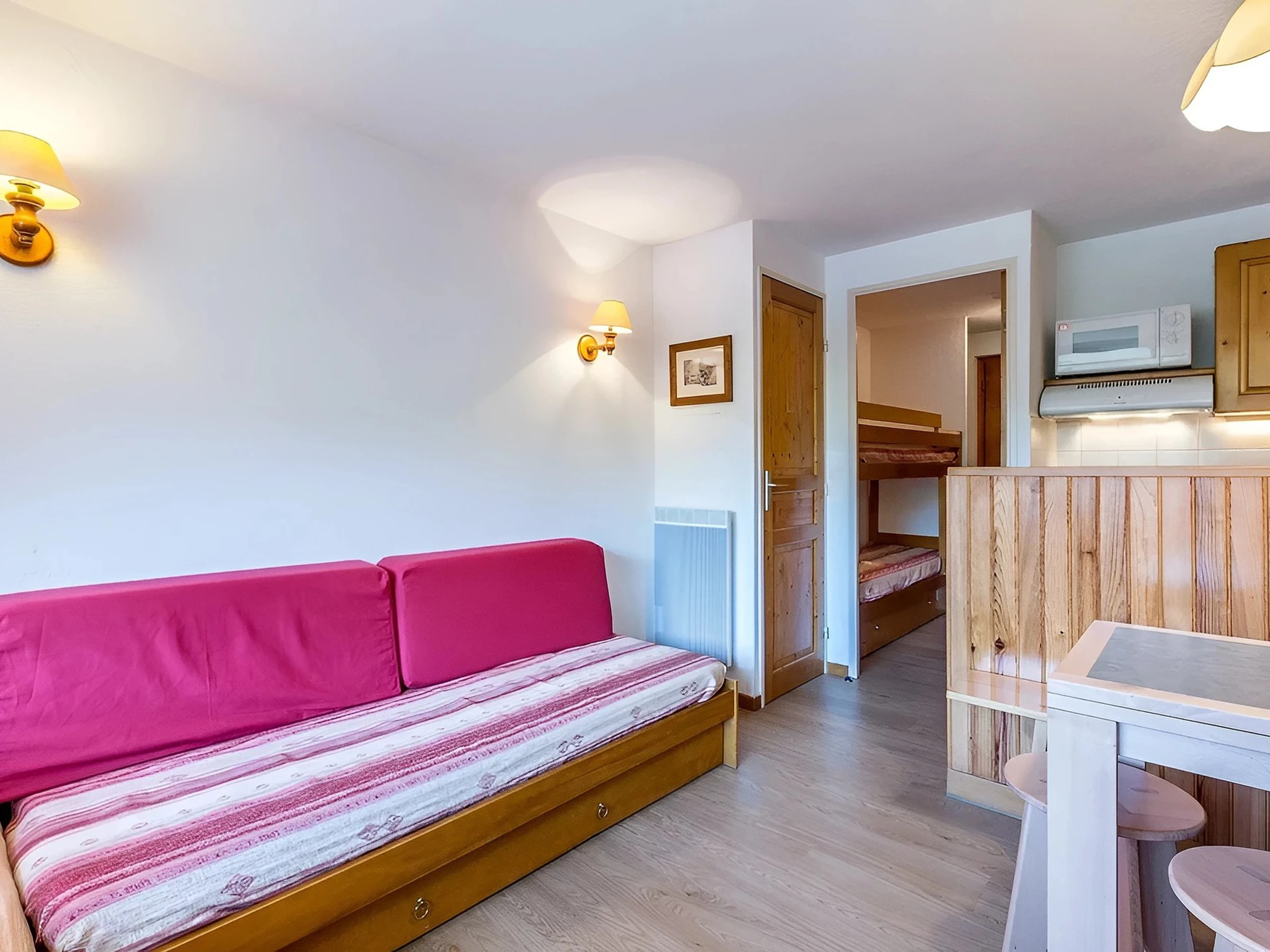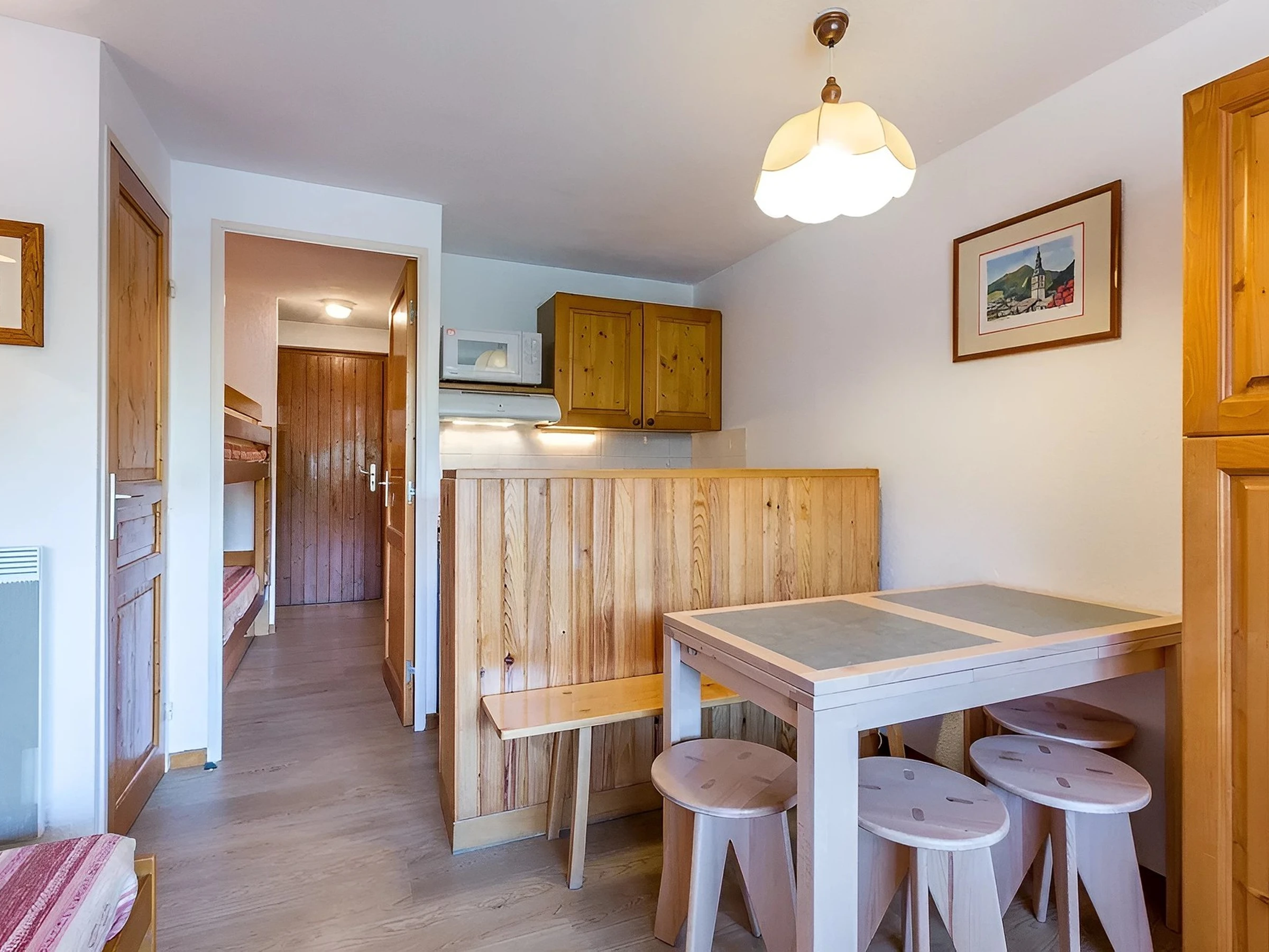 The entrance, located on the first floor, leads to a sleeping area with two bunk beds (70 cm). The living area is organised around a dining area and two single sofa beds (80 cm). The open kitchen, integrated into the living room, naturally complements the living space. French windows open onto the south-facing balcony, providing a pleasant extension to the living area.