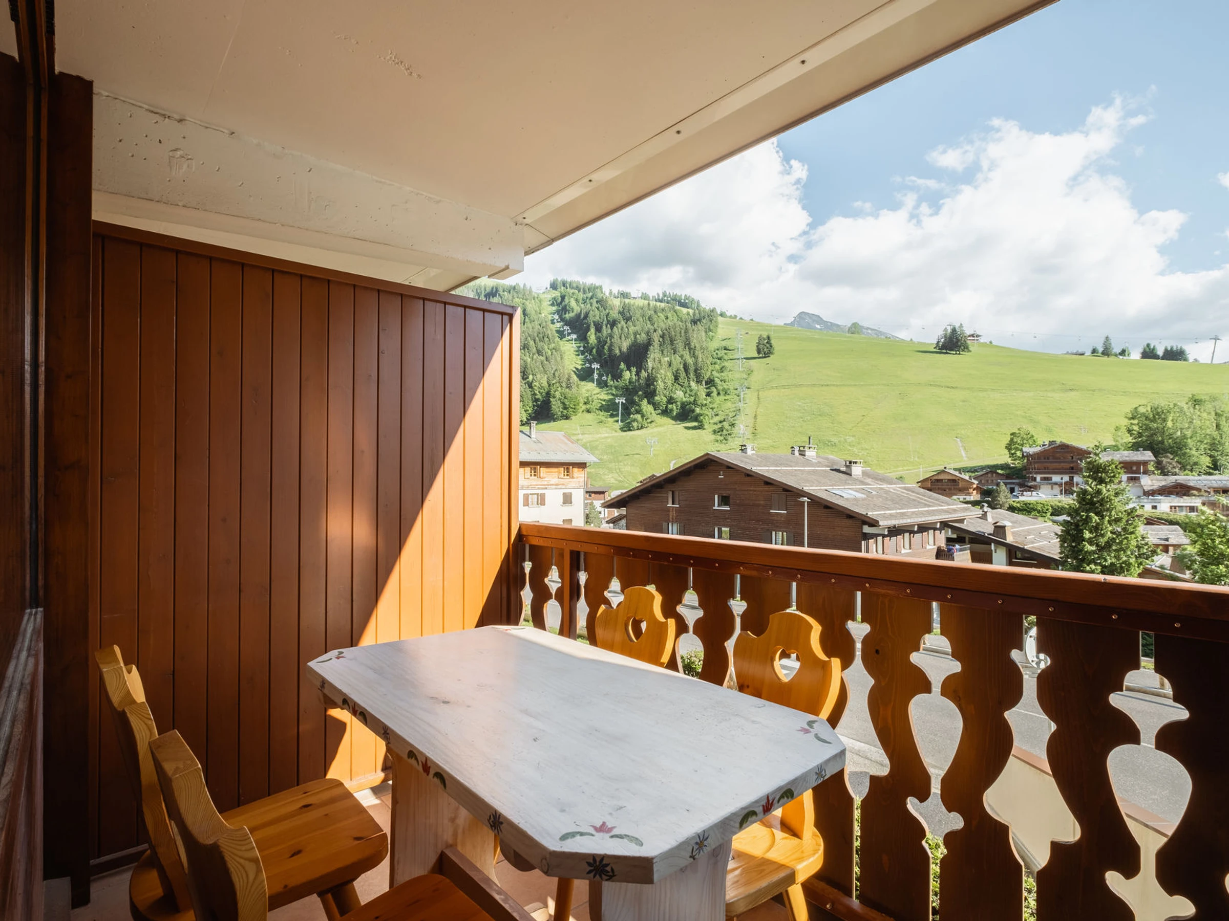 Outside, the south-facing balcony overlooks the village and mountains, creating a bright and pleasant atmosphere in the early morning. The private garage provides convenient parking in all seasons.
