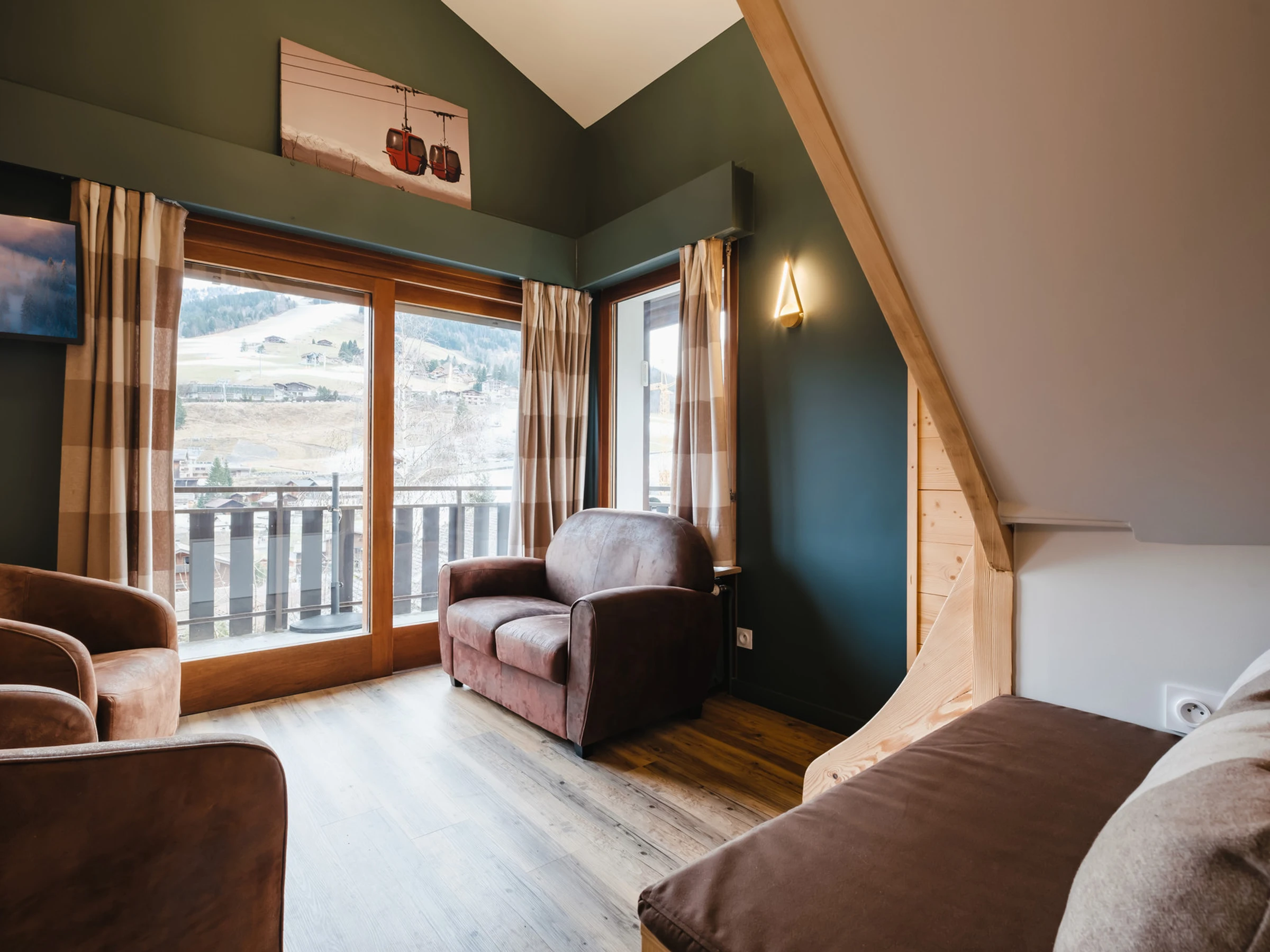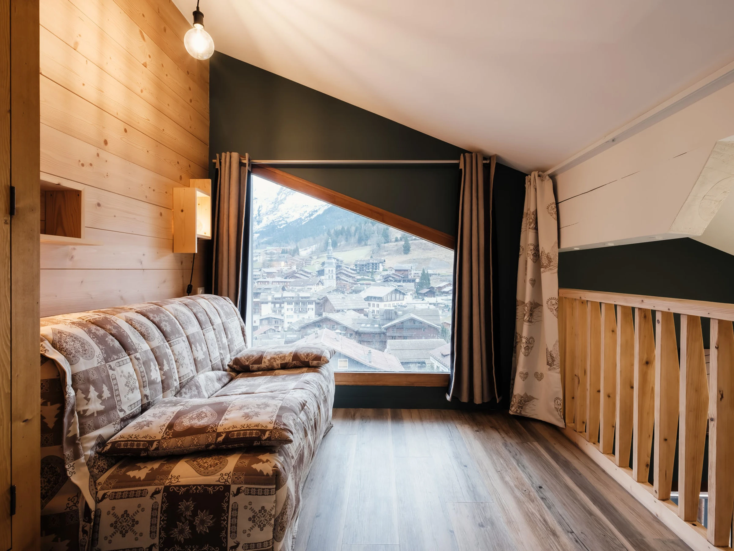 - Open MEZZANINE separated by a curtain (6.34 m²) overlooking the living room: 1 DOUBLE CONVERTIBLE SOFA BED (140), fixed east bay window, next door residence / mountain view