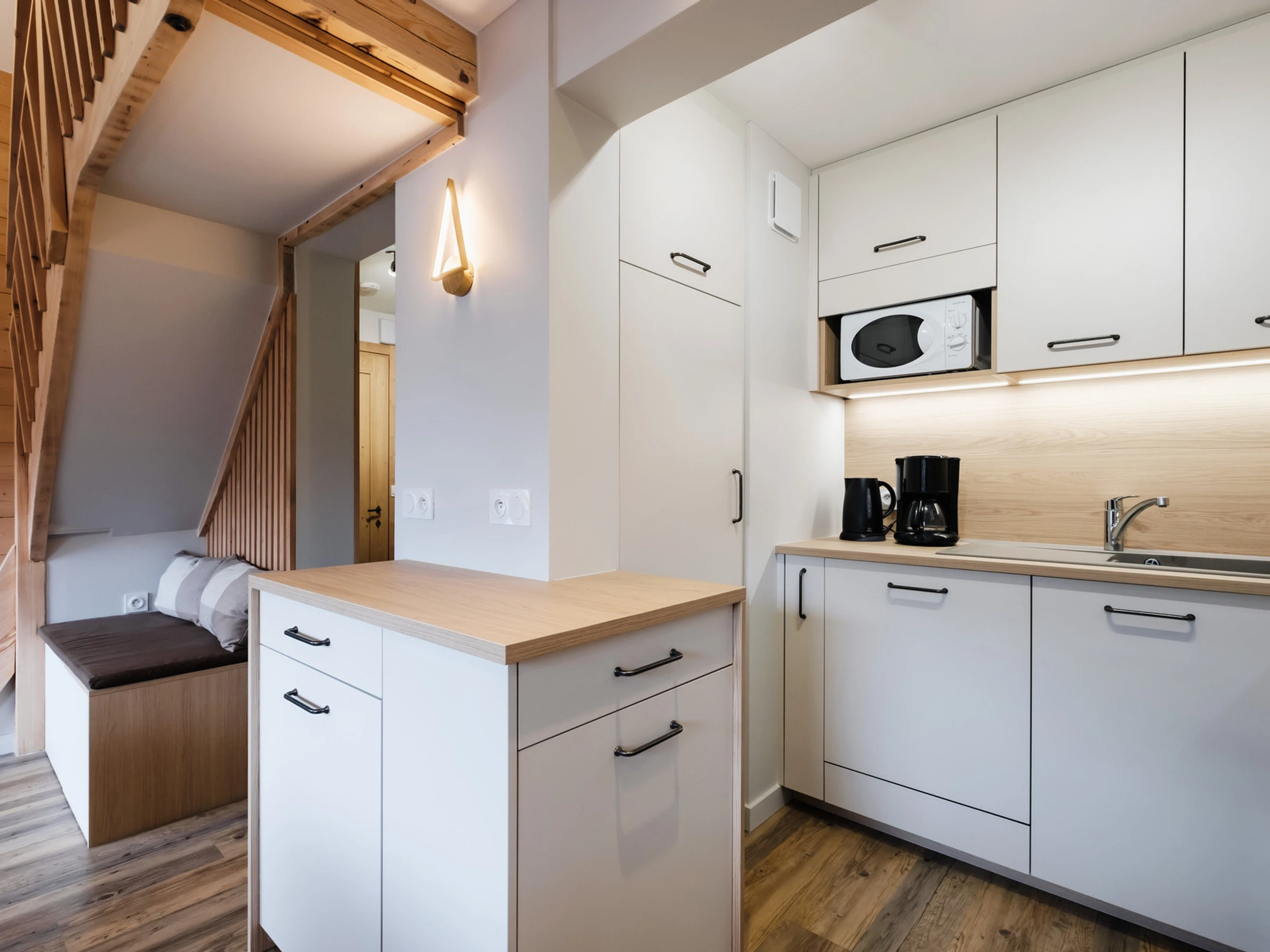 - KITCHENETTE (2.81 m): fridge + freezer (178 L), oven, INDUCTION stove, MICROWAVE, DISHWASHER