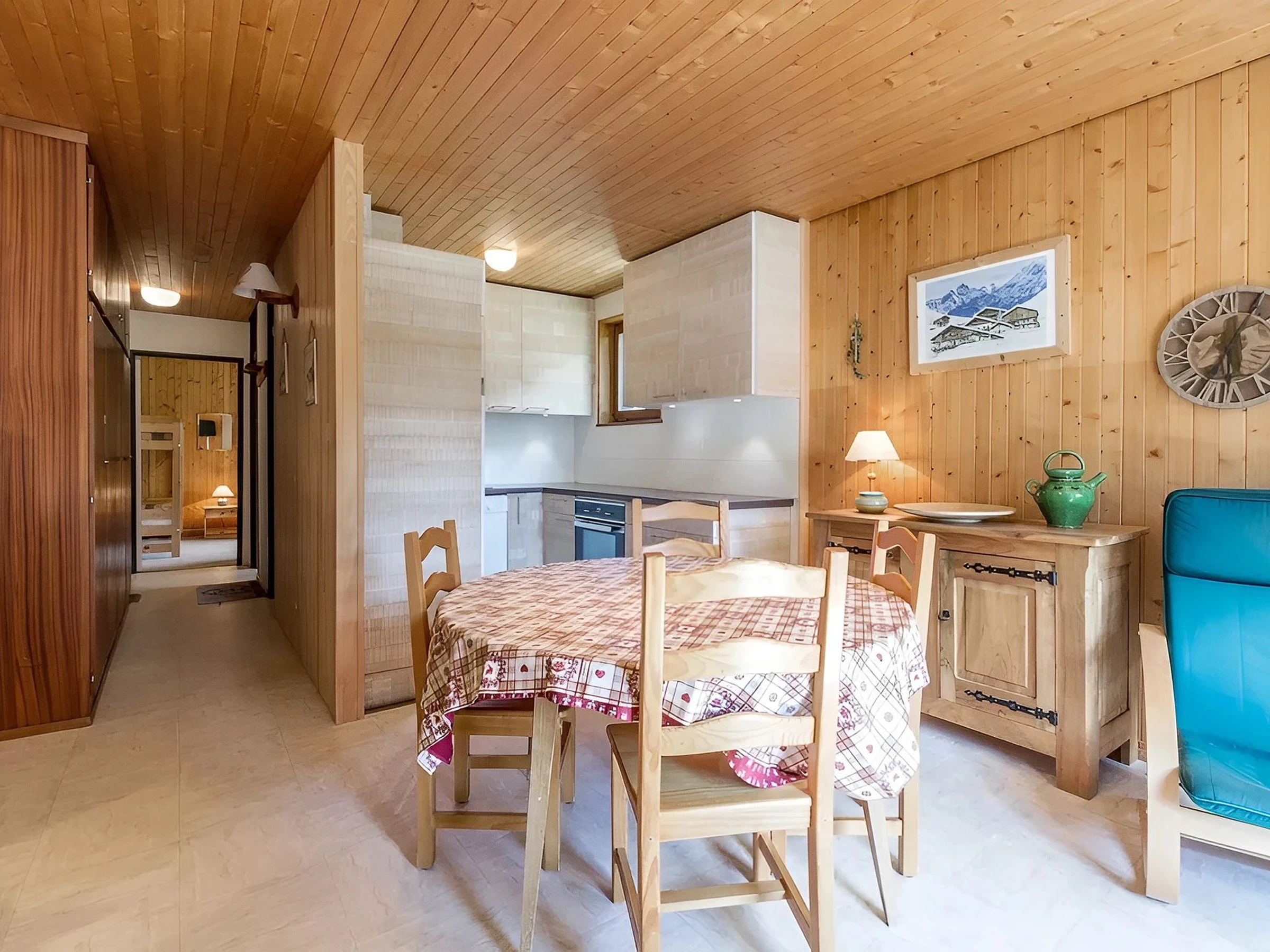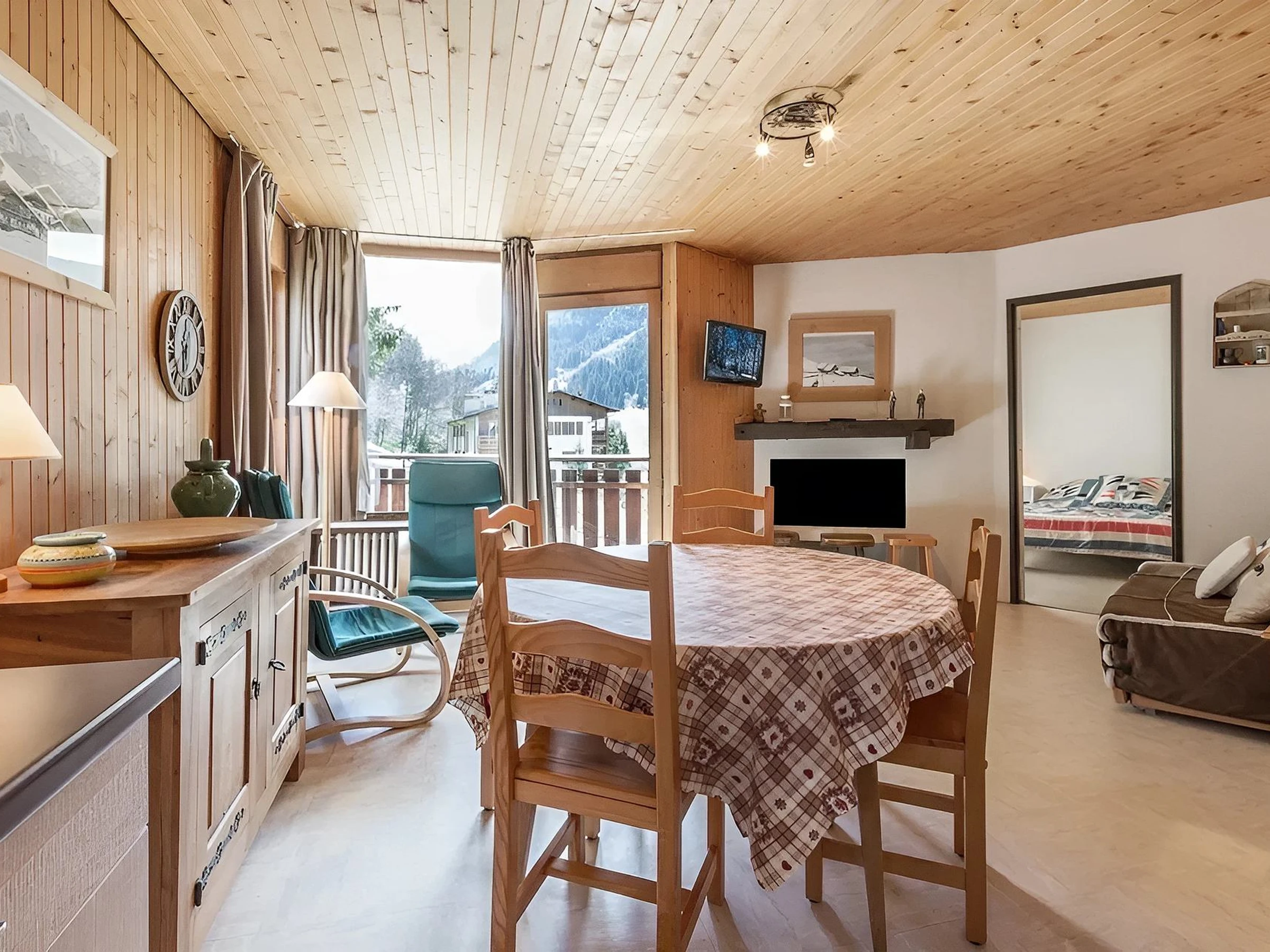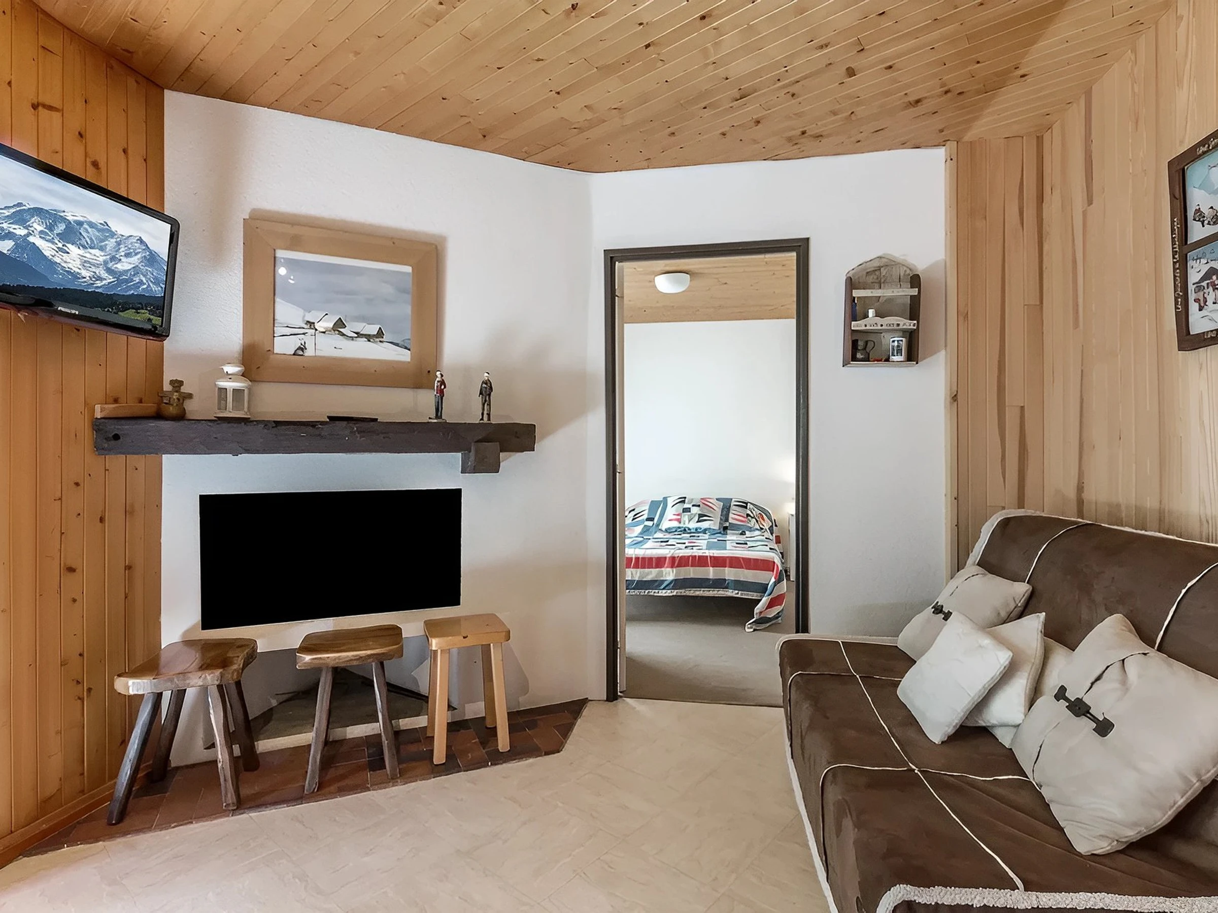 The entrance, located on the second floor, leads to the bright living room. It features a dining area and a non-working fireplace. The open kitchen, integrated into the living room, is perfect for the everyday moment. French windows extend the room onto the south-facing terrace, offering views of the mountains. The sleeping area consists of two comfortable bedrooms: the first opens onto the slopes and has two bunk beds (80 cm), while the second, overlooking the mountains, has a double bed (140 cm). A bathroom with bathtub and a separate toilet complete the space.