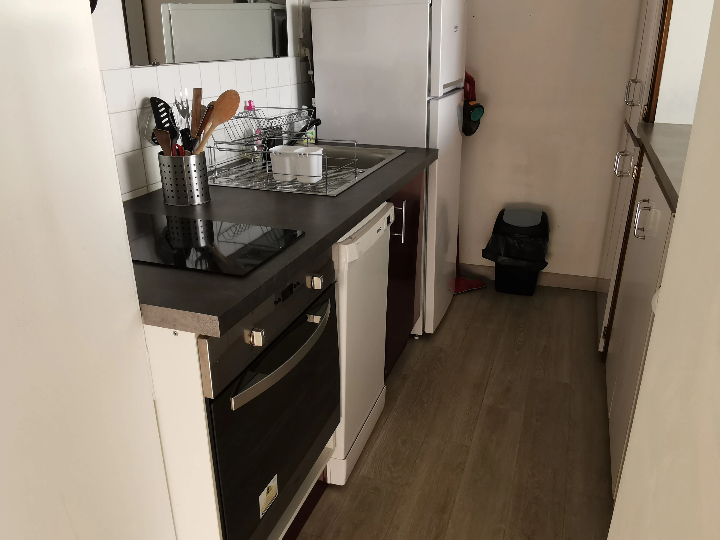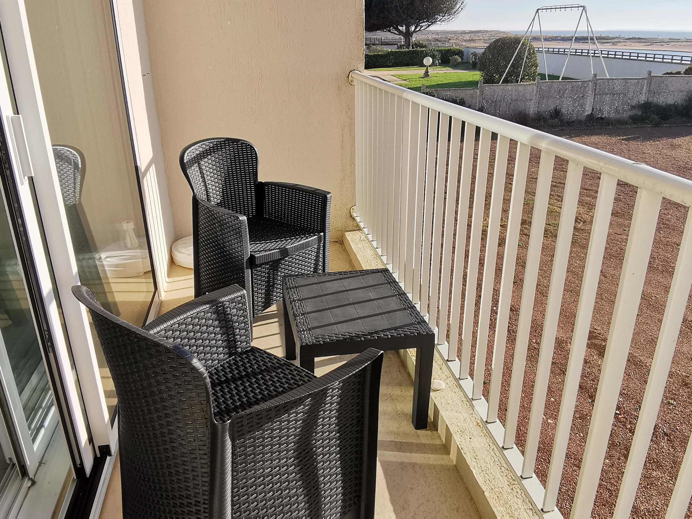 It comprises an entrance hall (with closet) leading to the bathroom with toilet, sink, and shower, the fitted kitchen area (2 ceramic hobs with extractor hood; refrigerator/freezer; oven) with dishwasher, a living room with a sofa bed and a 140 x 200 cm Murphy bed, a table for 4, a flat-screen TV, and Wi-Fi access. The south/west-facing balcony is equipped with patio furniture.